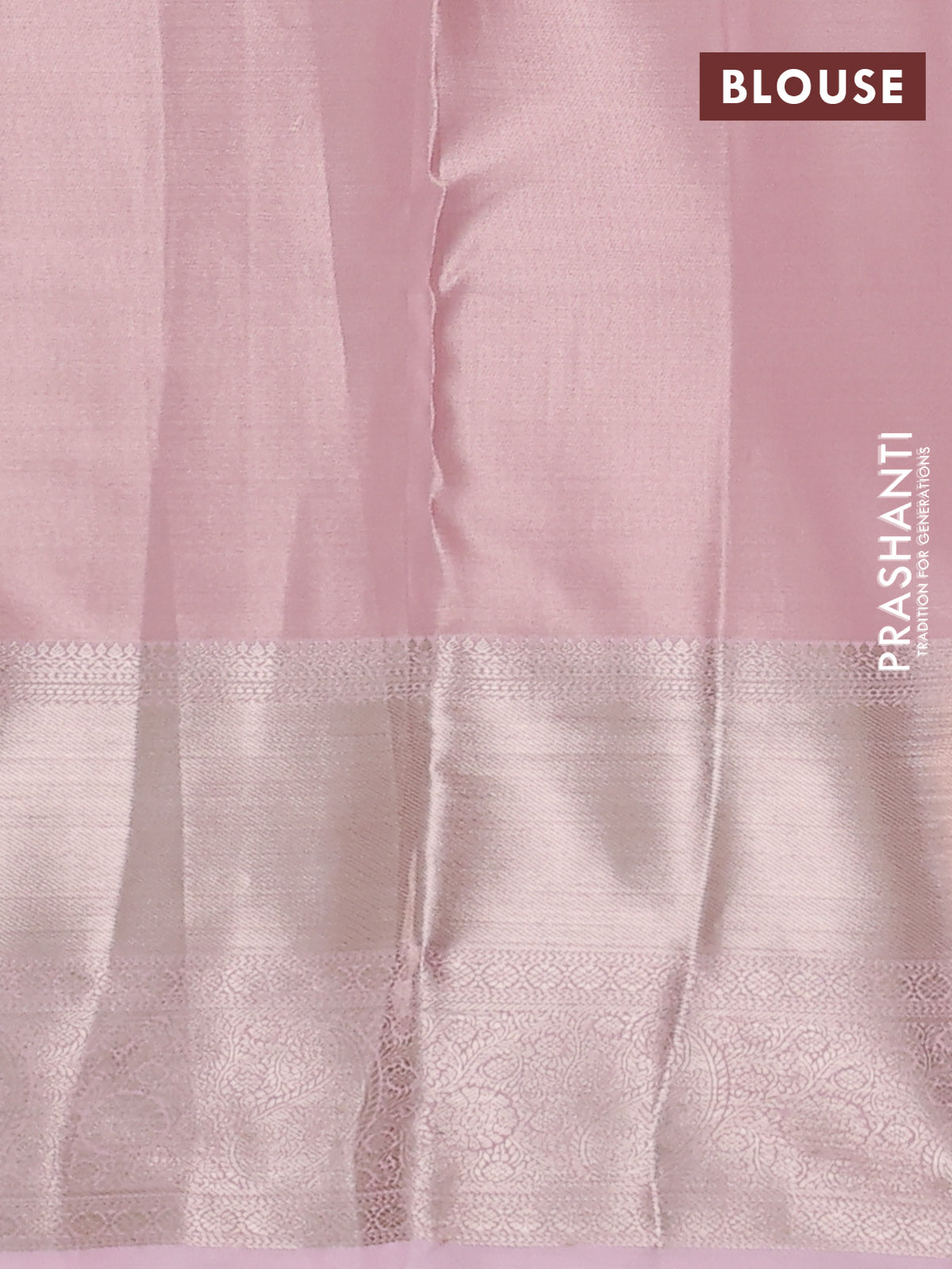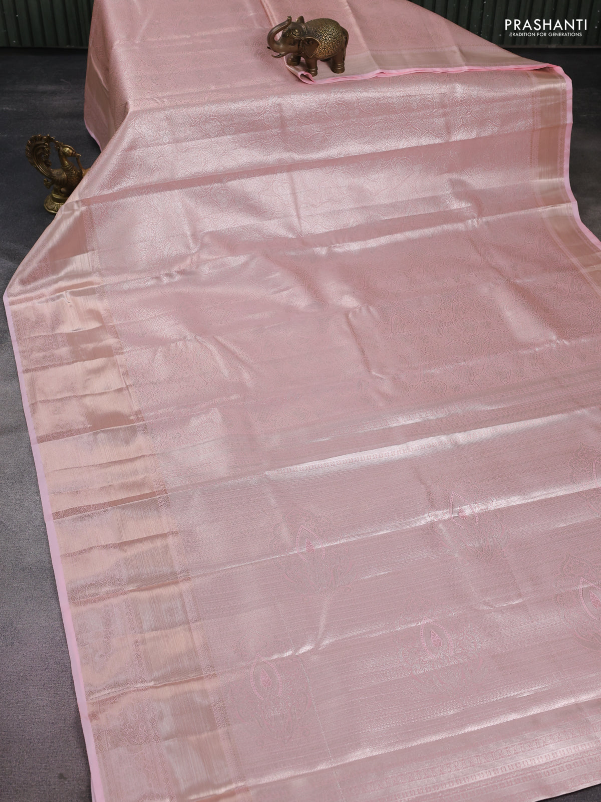Semi kanchipuram tissue silk saree mild peach with allover silver zari woven brocade weaves and long zari woven border