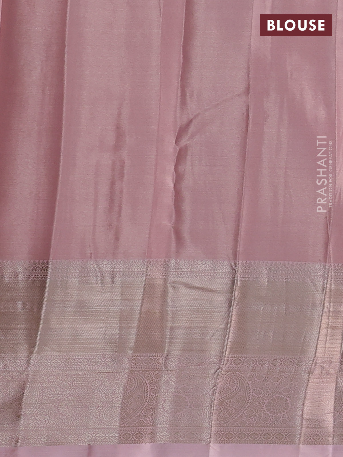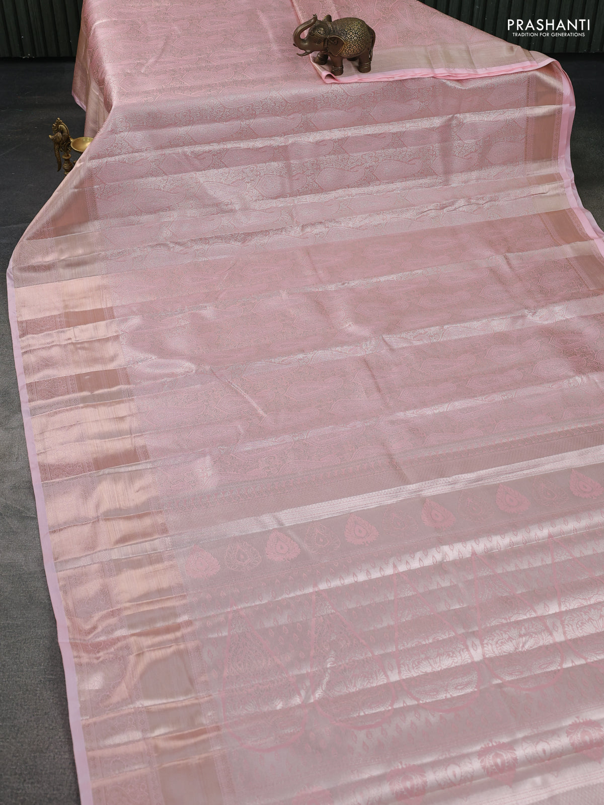 Semi kanchipuram tissue silk saree mild peach with allover silver zari woven brocade weaves and long zari woven border