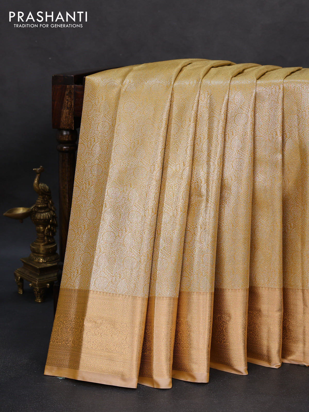 Semi kanchipuram tissue silk saree mustard yellow and sandal with allover silver zari woven brocade weaves and rich zari woven border