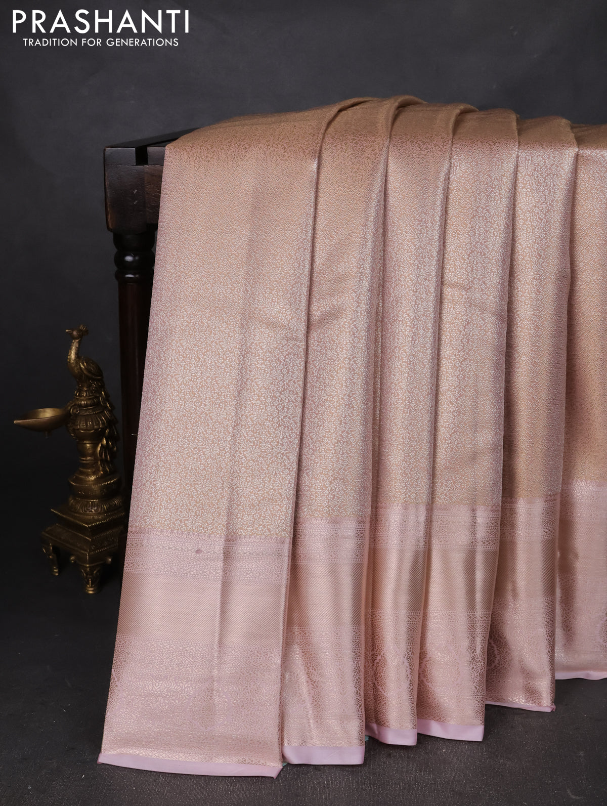 Semi kanchipuram tissue silk saree pastel peach and baby pink with allover silver zari woven brocade weaves and long zari woven border