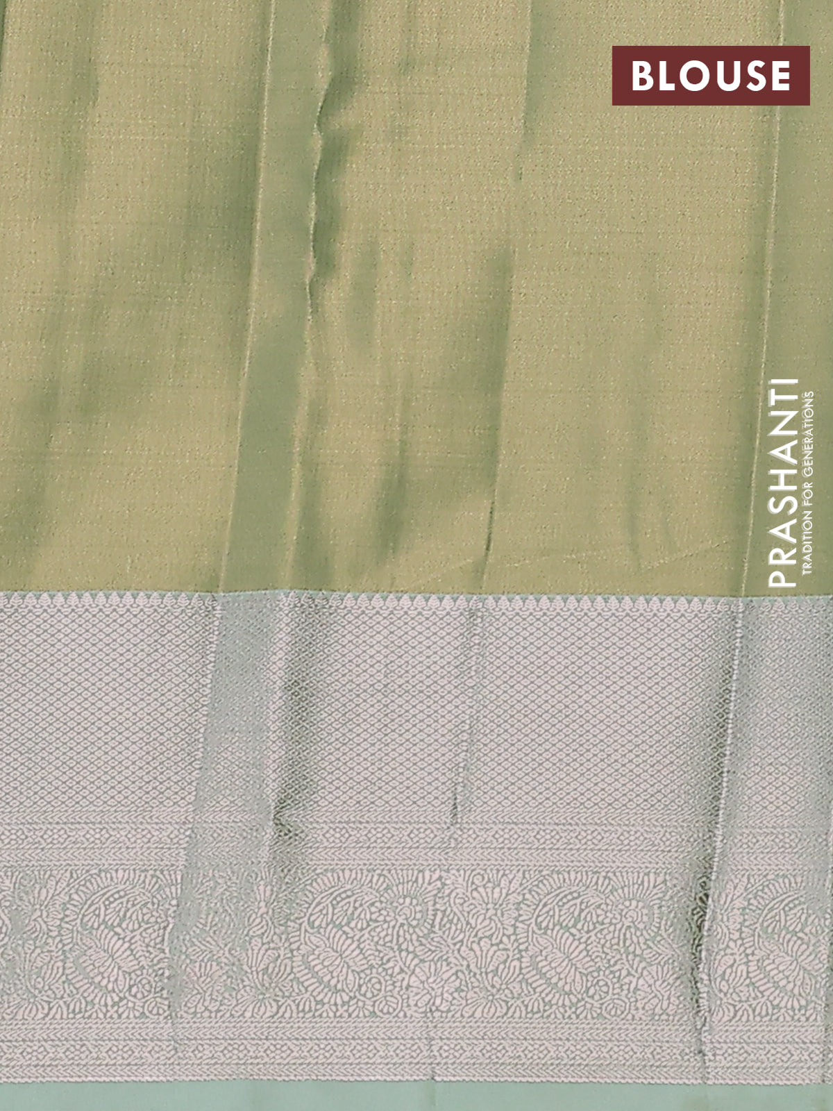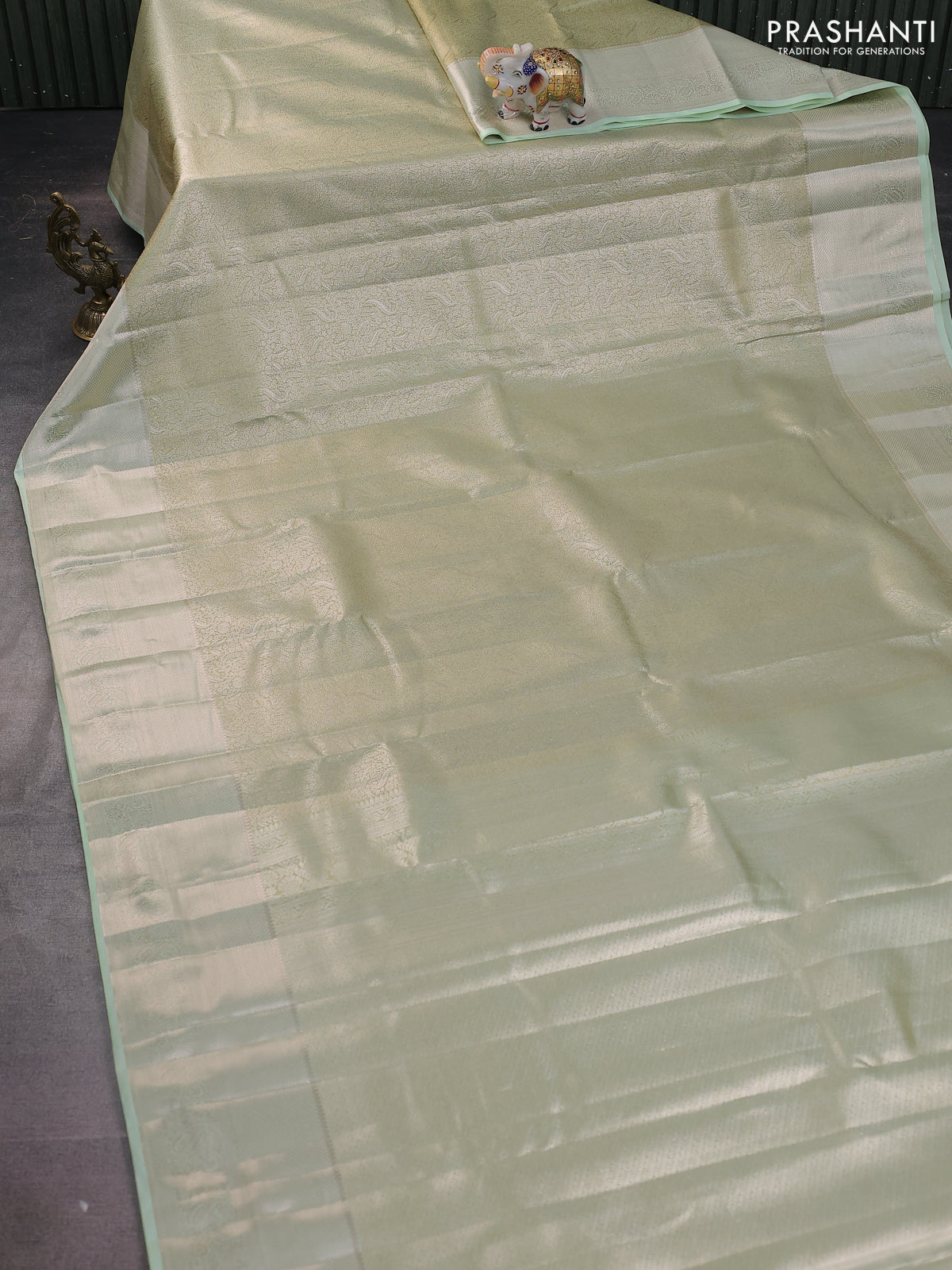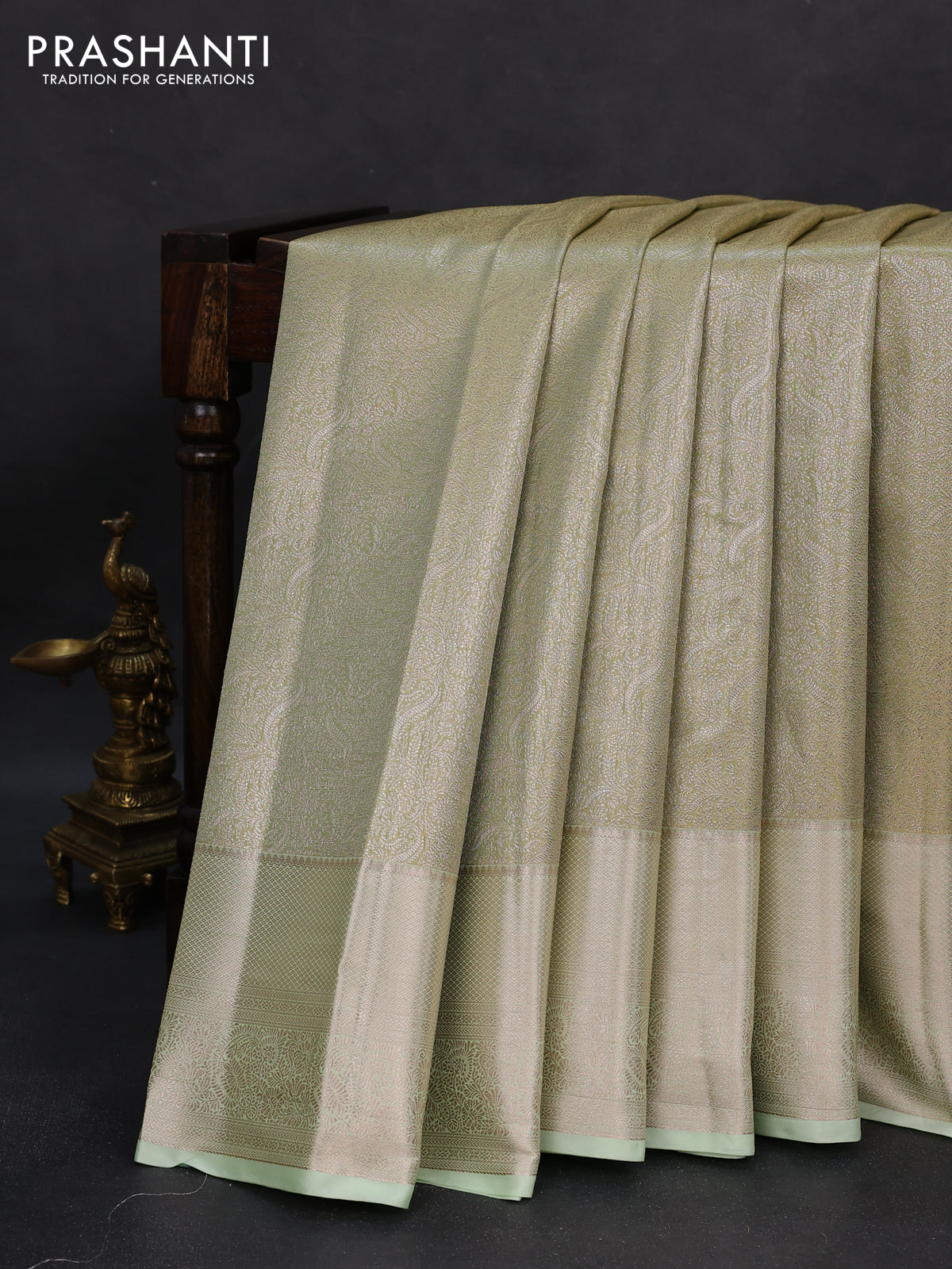 Semi kanchipuram tissue silk saree pista green with allover silver zari woven brocade weaves and long zari woven border