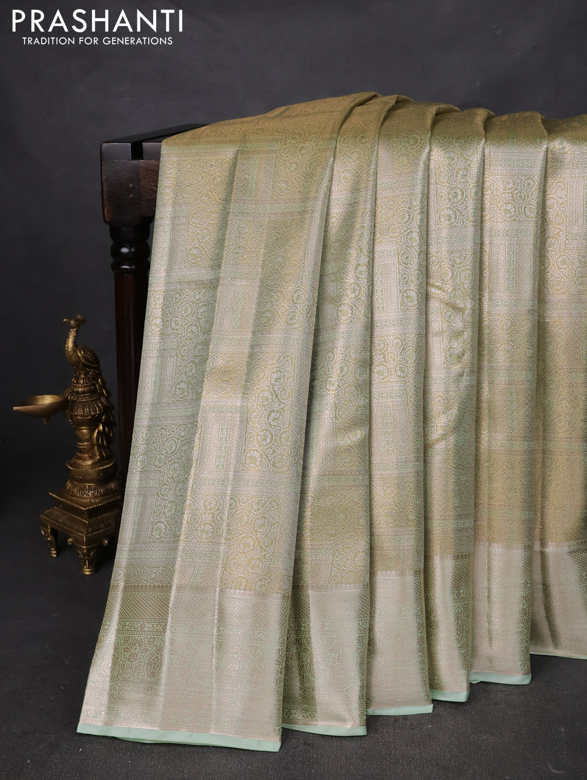 Semi kanchipuram tissue silk saree pista green with allover silver zari woven brocade weaves and zari woven border