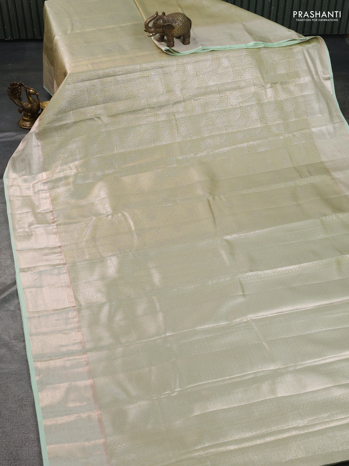 Semi kanchipuram tissue silk saree pista green with allover silver zari woven brocade weaves and zari woven border