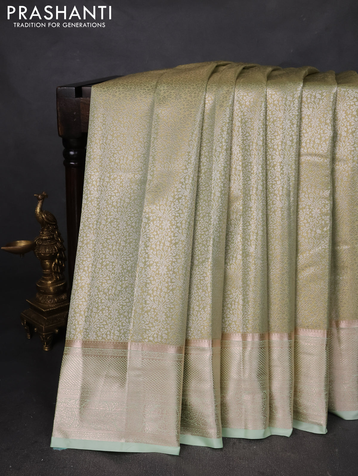 Semi kanchipuram tissue silk saree pista green with allover silver zari woven brocade weaves and zari woven border