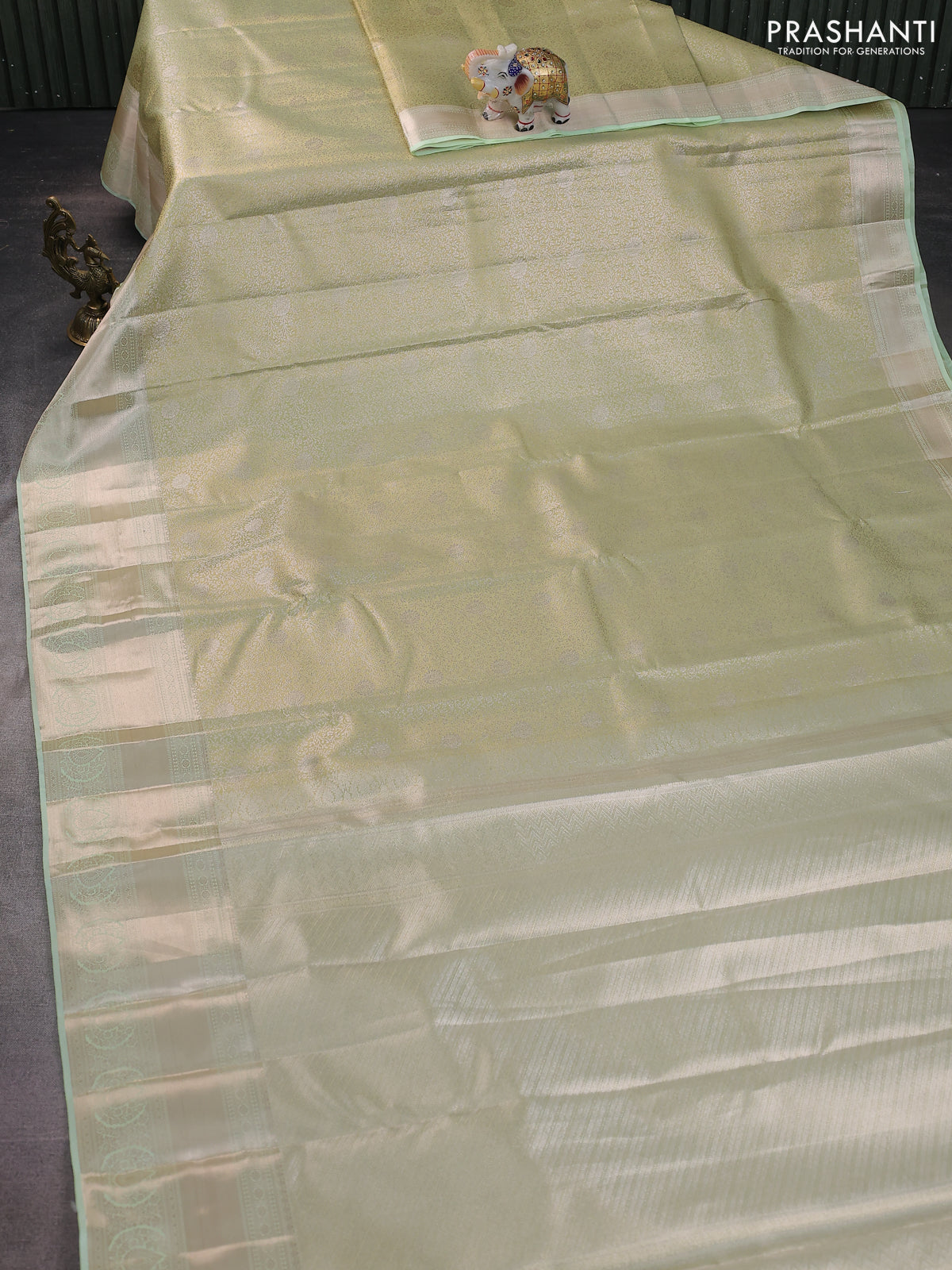 Semi kanchipuram tissue silk saree pista green with allover silver zari woven brocade weaves and zari woven border