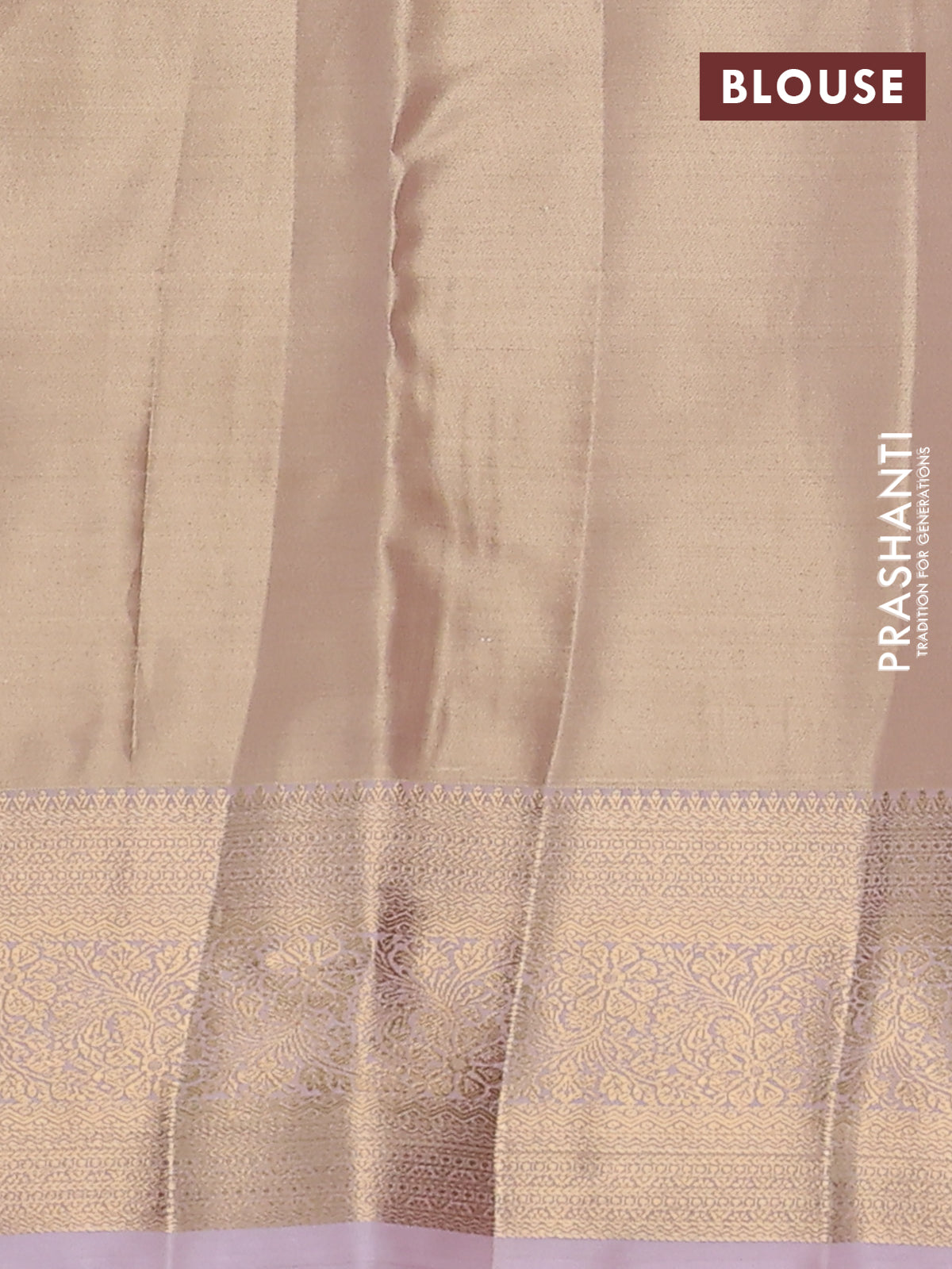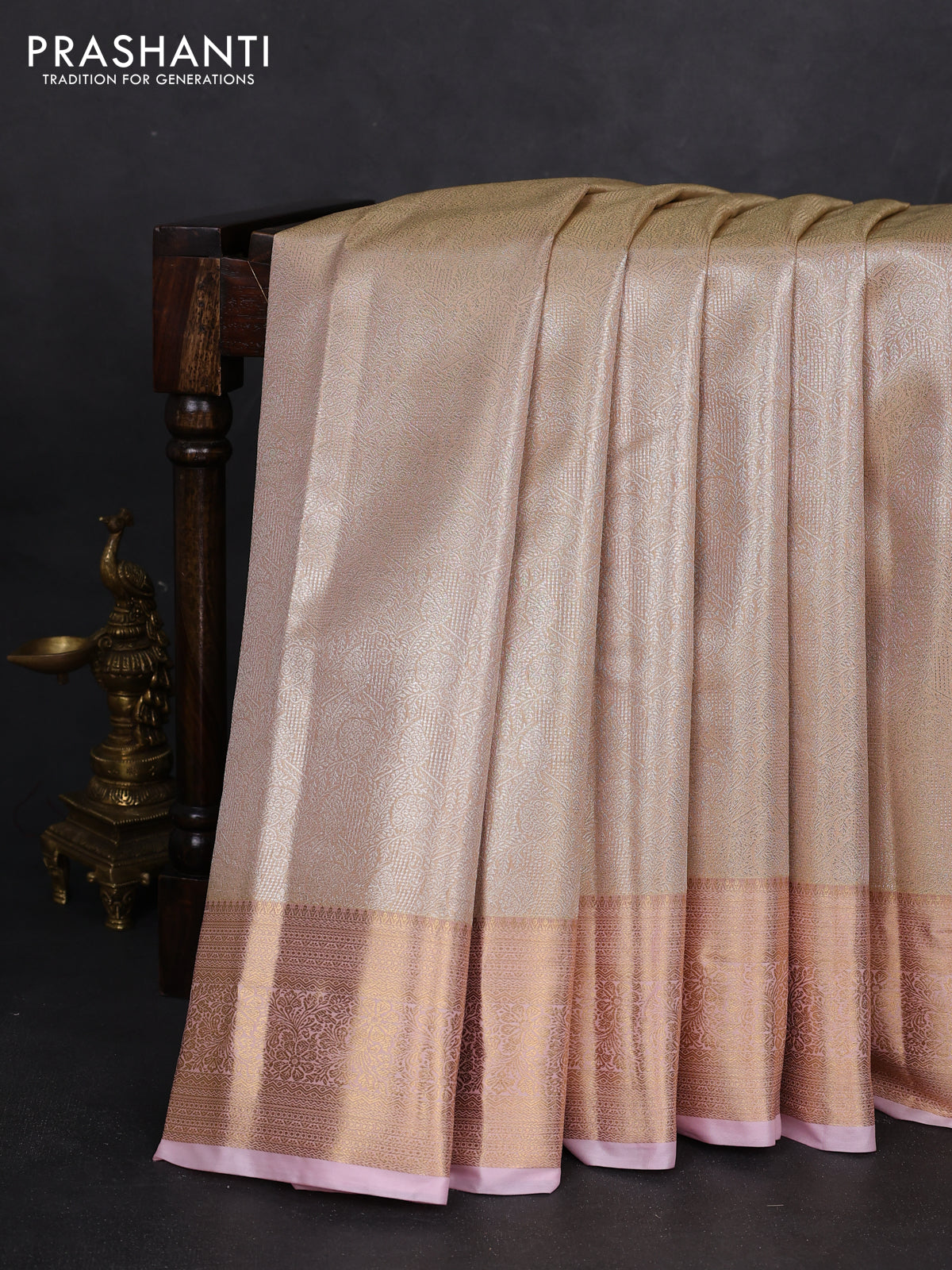 Semi kanchipuram tissue silk saree sandal and baby pink with allover silver zari woven brocade weaves and rich zari woven border