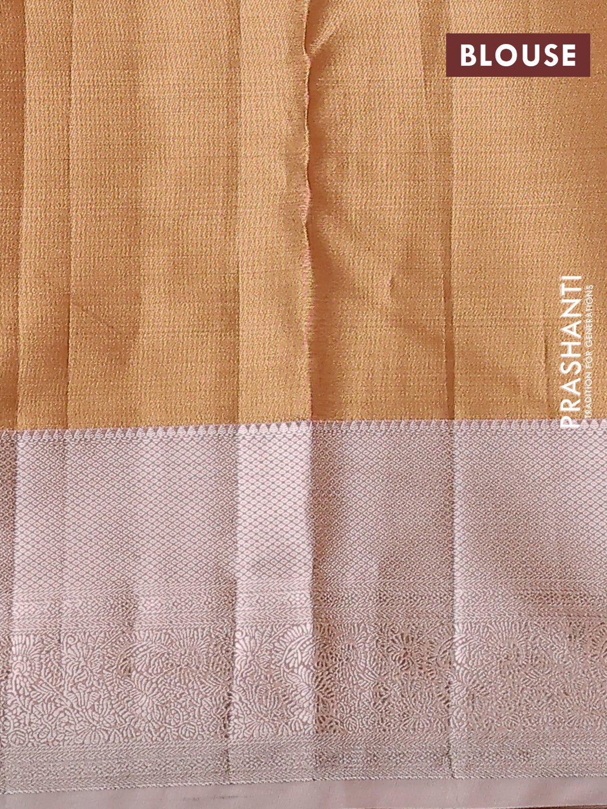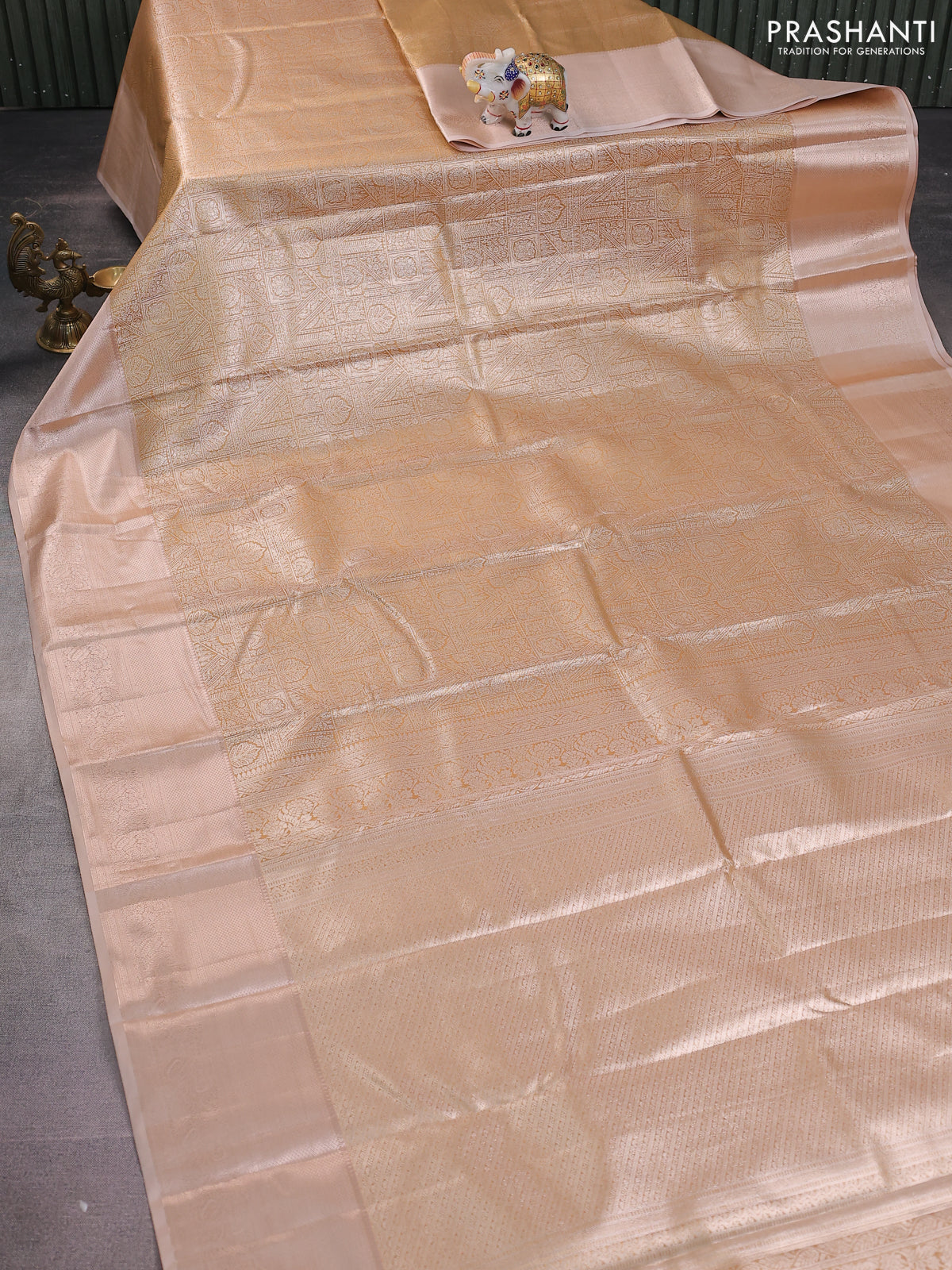 Semi kanchipuram tissue silk saree sandal and pastel peach with allover silver zari woven brocade weaves and zari woven border