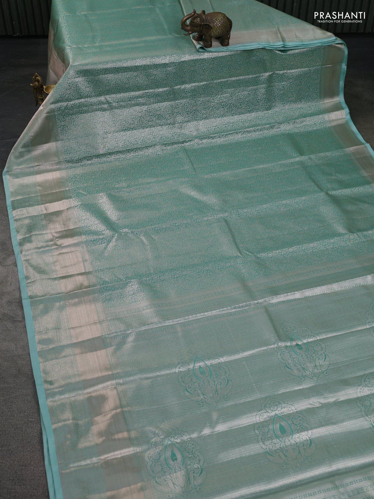 Semi kanchipuram tissue silk saree teal blue with allover silver zari woven brocade weaves and long zari woven border