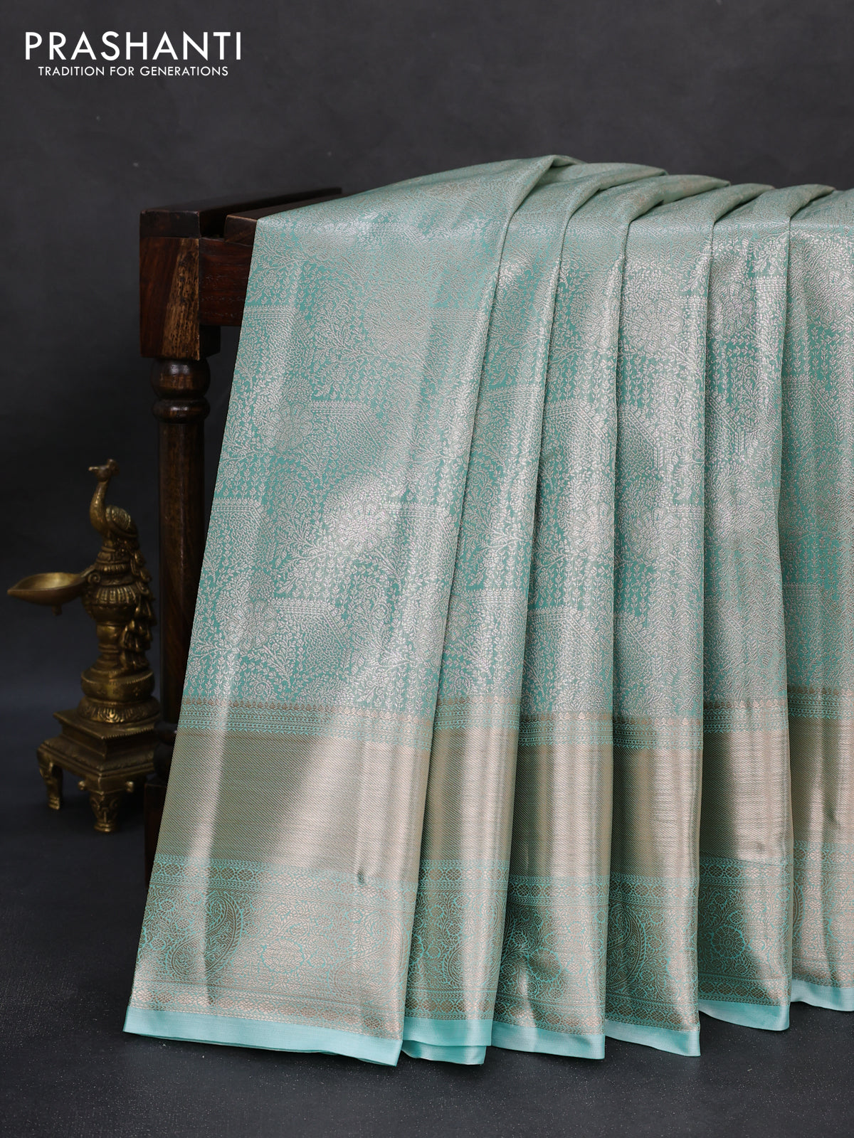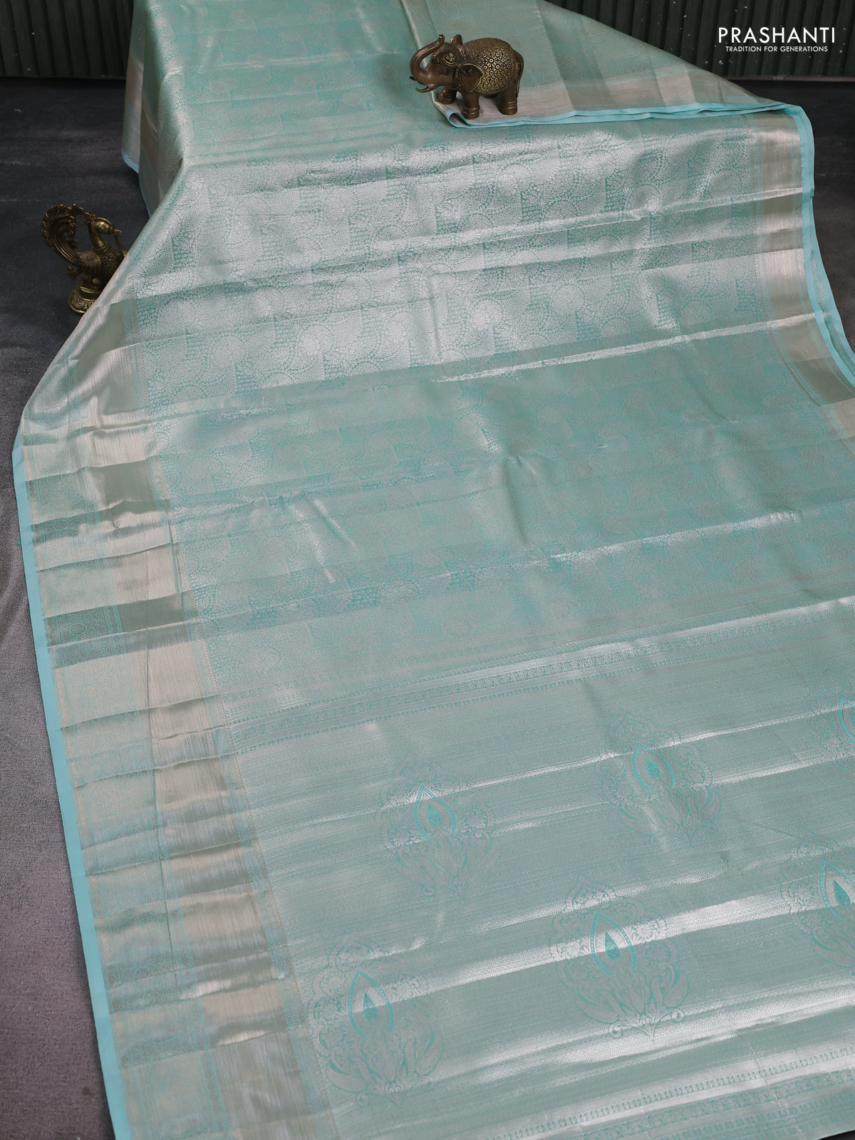 Semi kanchipuram tissue silk saree teal blue with allover silver zari woven brocade weaves and long zari woven border