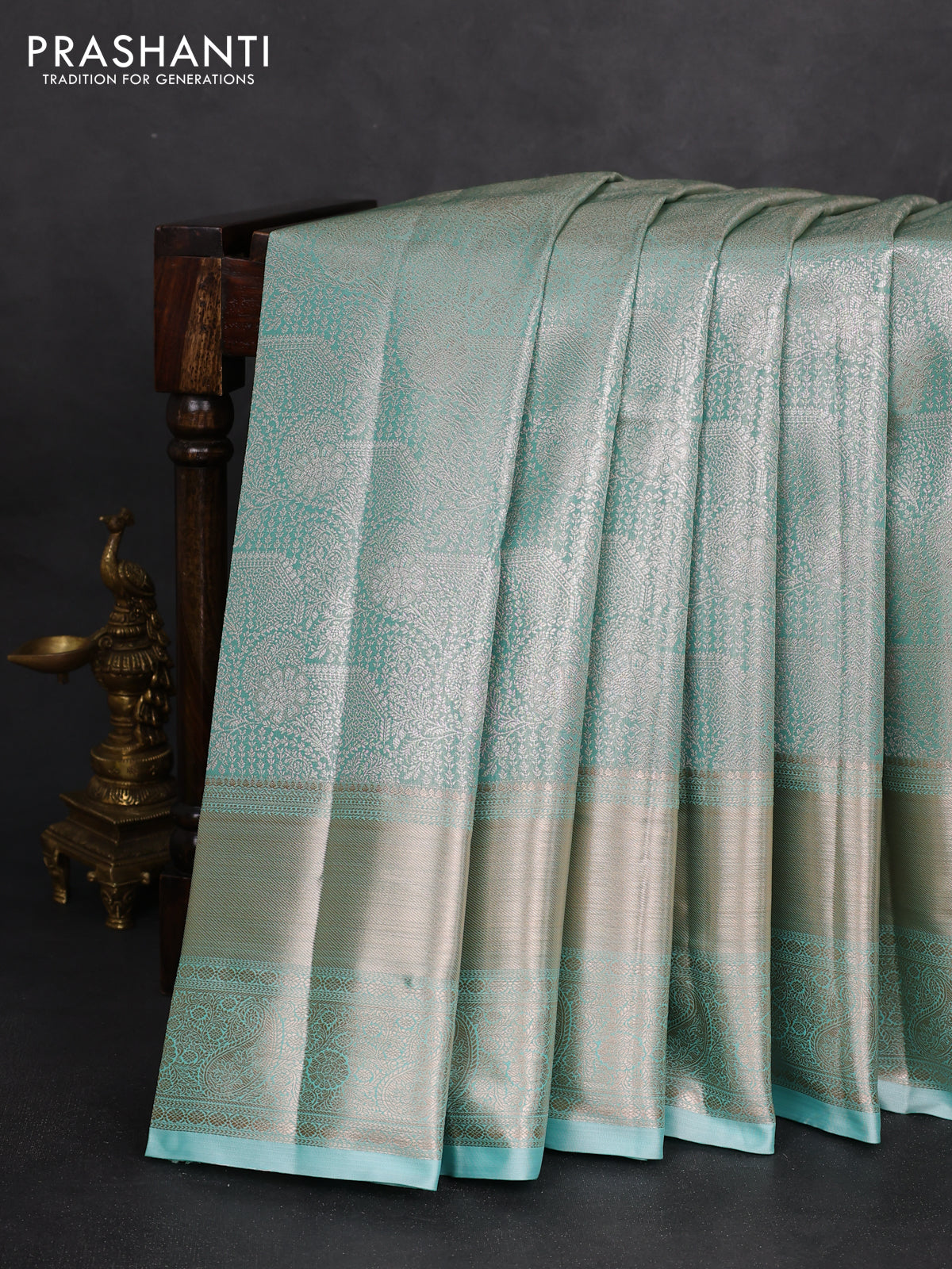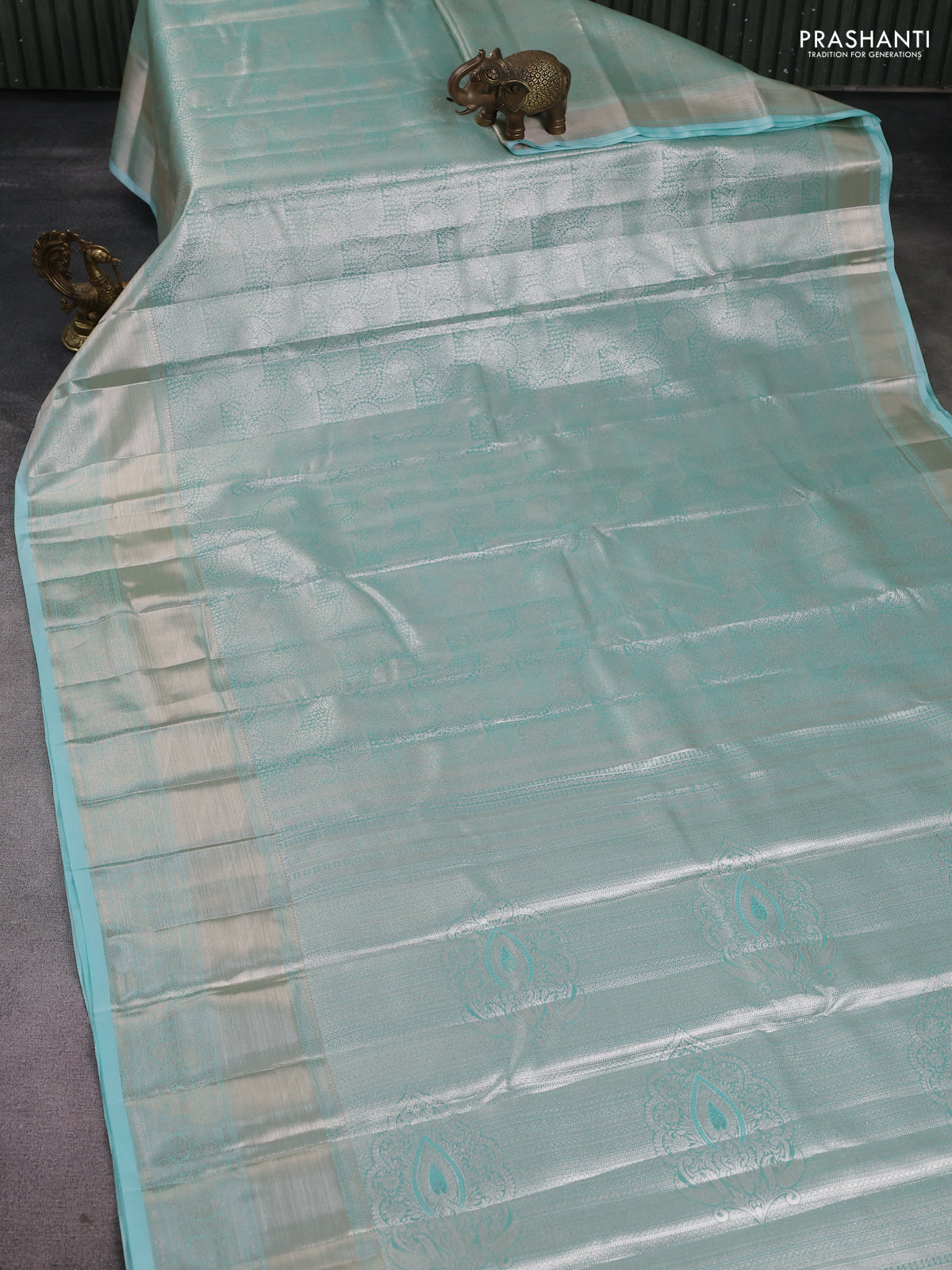 Semi kanchipuram tissue silk saree teal blue with allover silver zari woven brocade weaves and long zari woven border