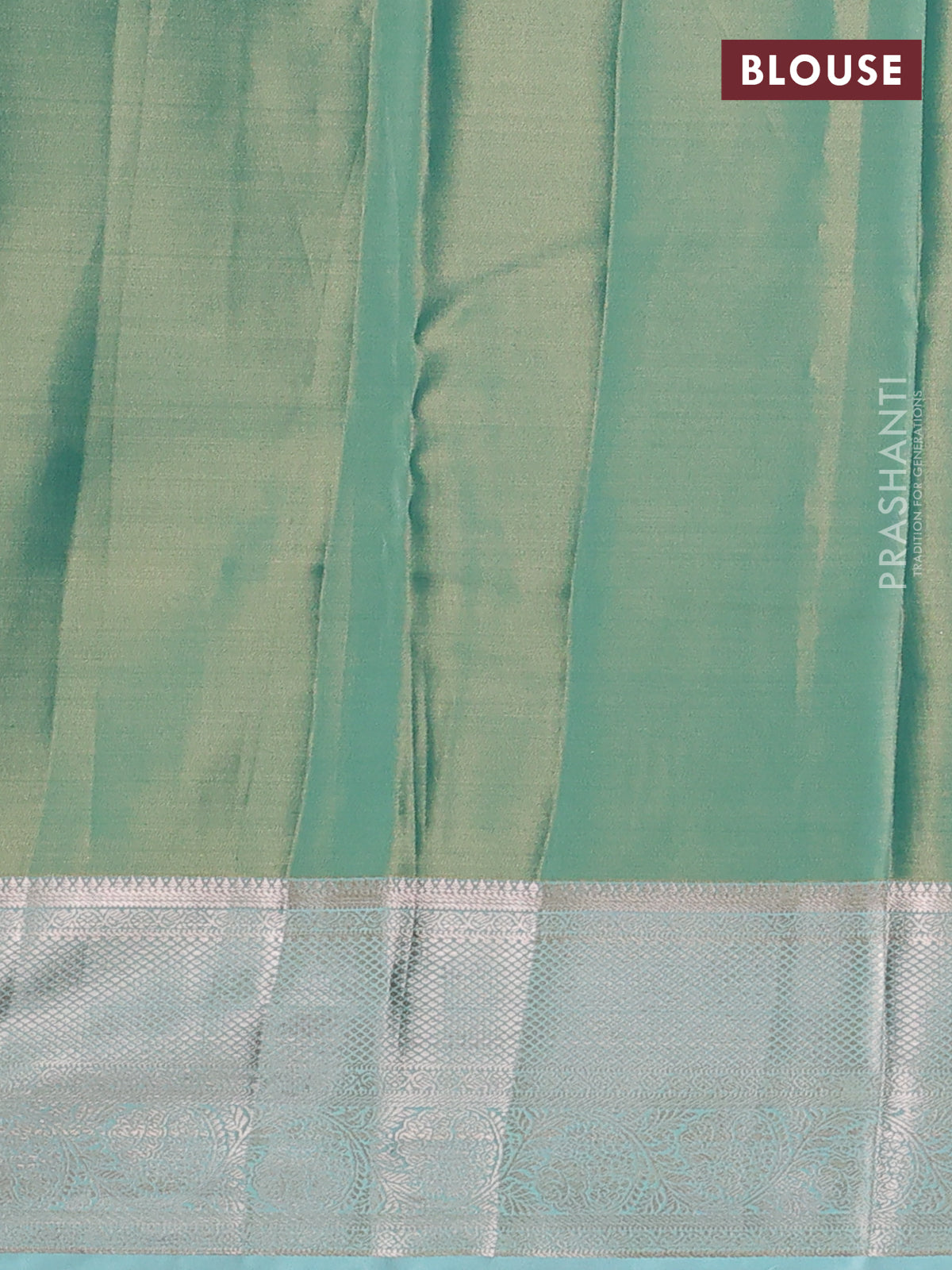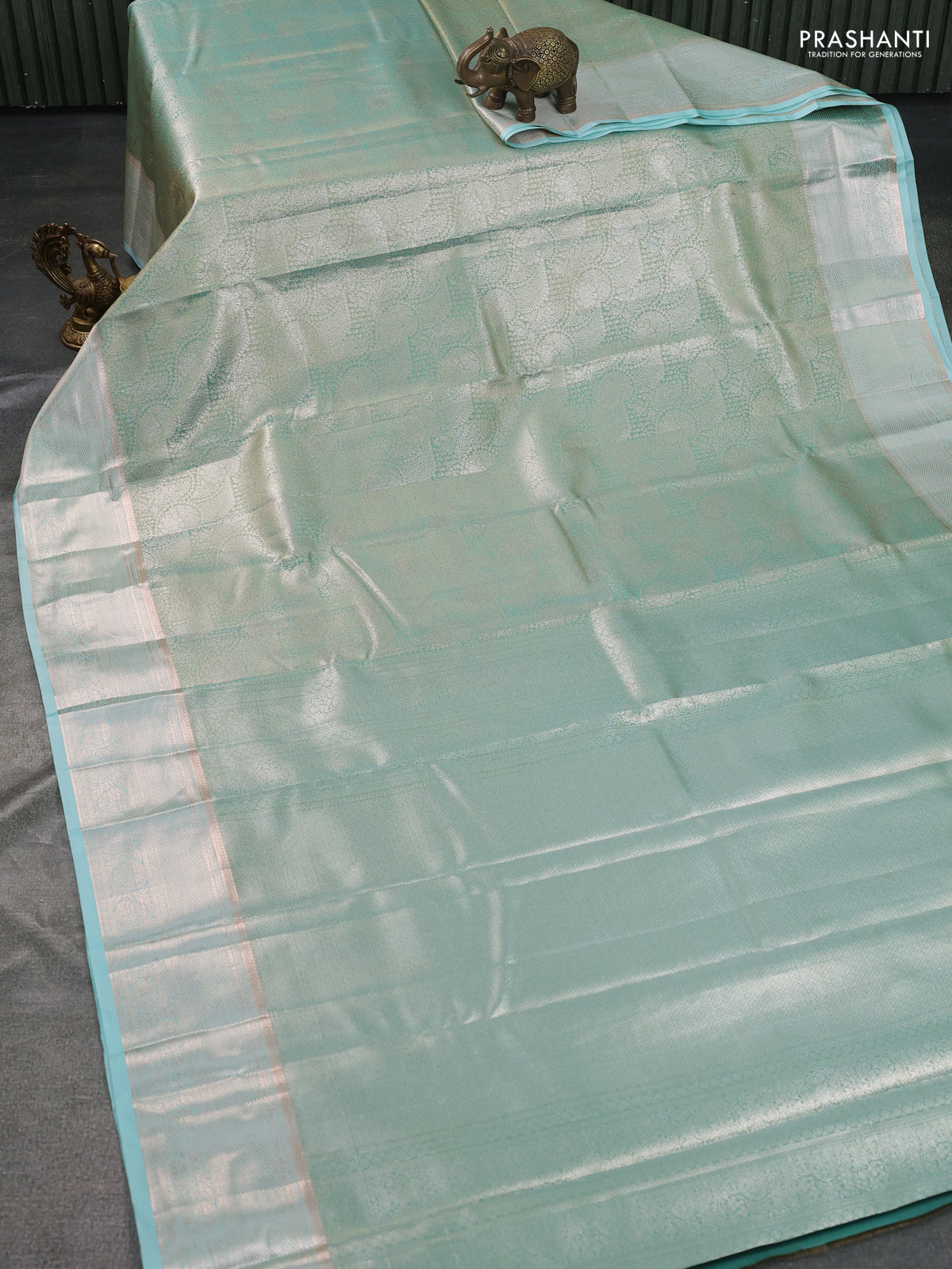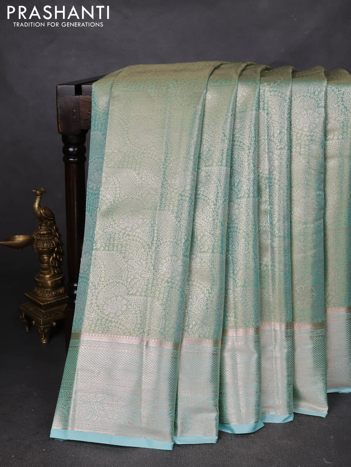 Semi kanchipuram tissue silk saree teal blue with allover silver zari woven brocade weaves and zari woven border