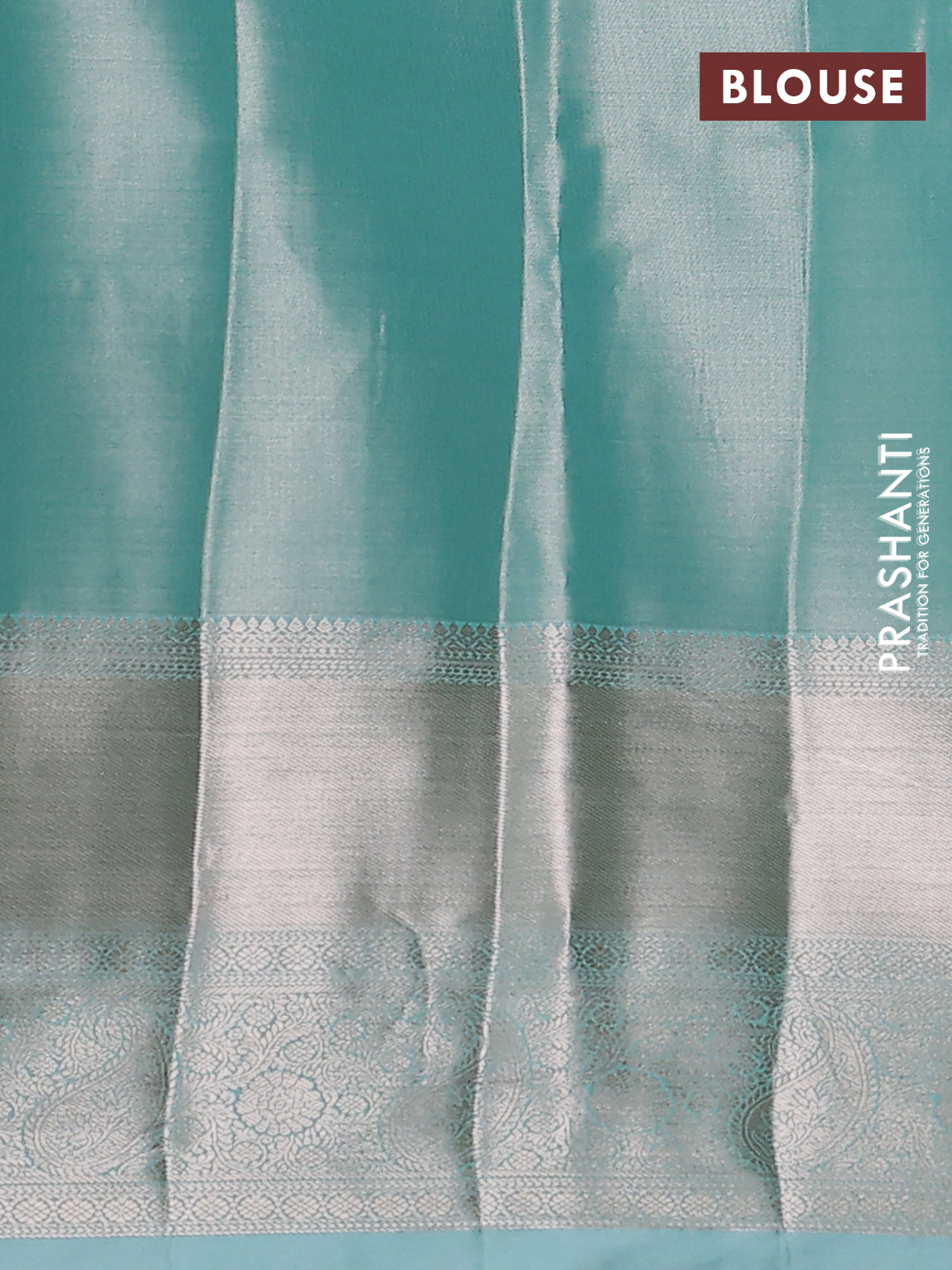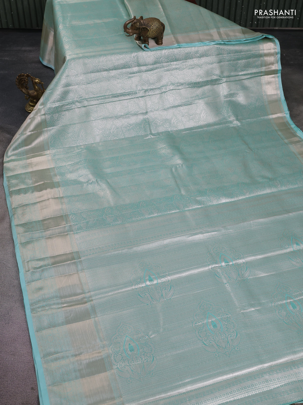 Semi kanchipuram tissue silk saree teal shade with allover silver zari woven brocade weaves and long zari woven border