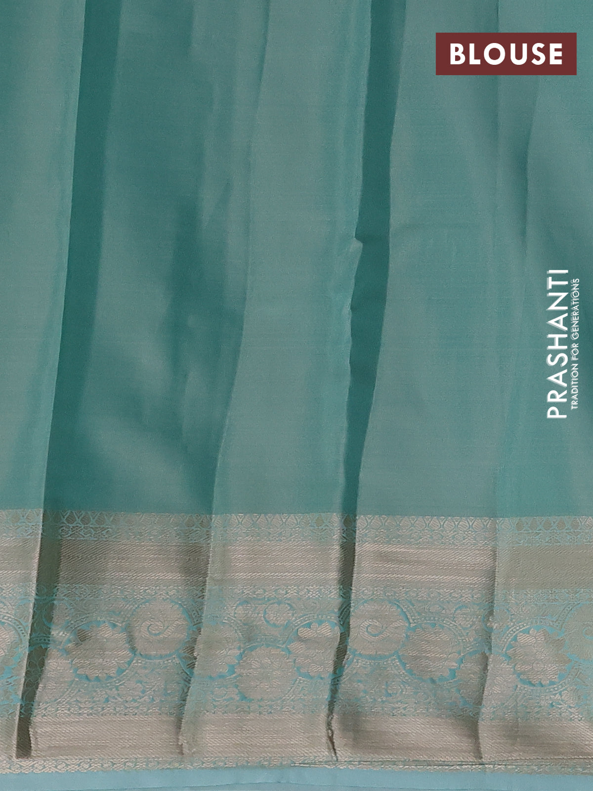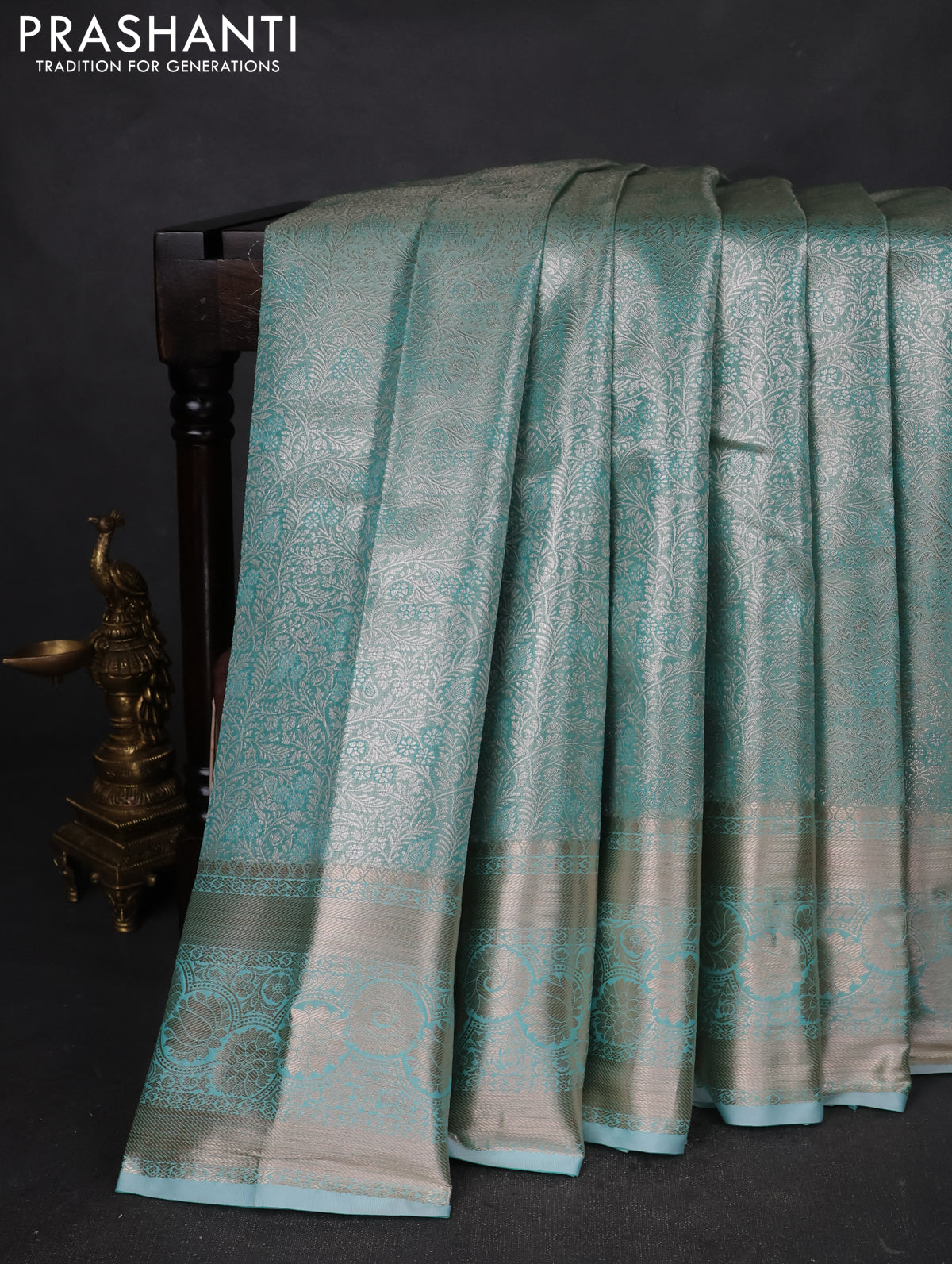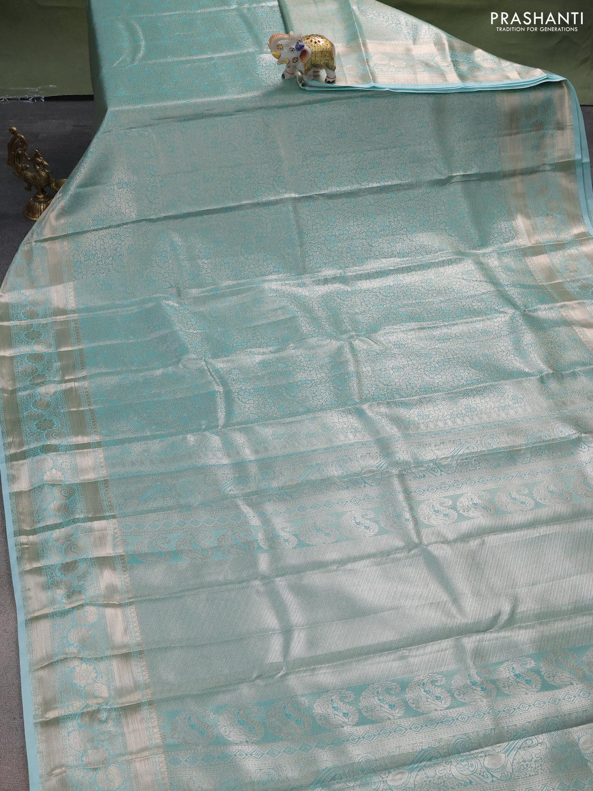 Semi kanchipuram tissue silk saree teal shade with allover silver zari woven brocade weaves and zari woven border
