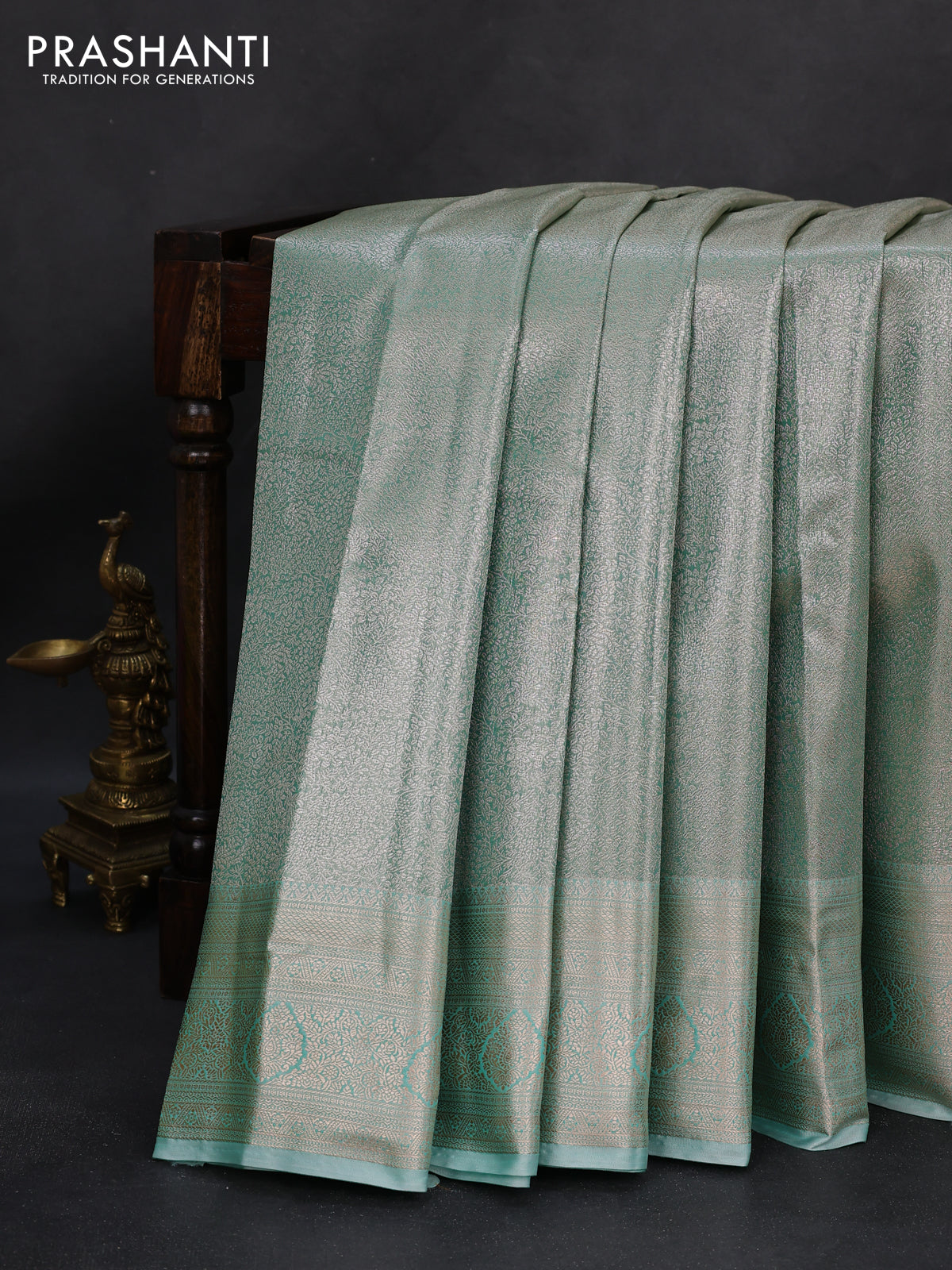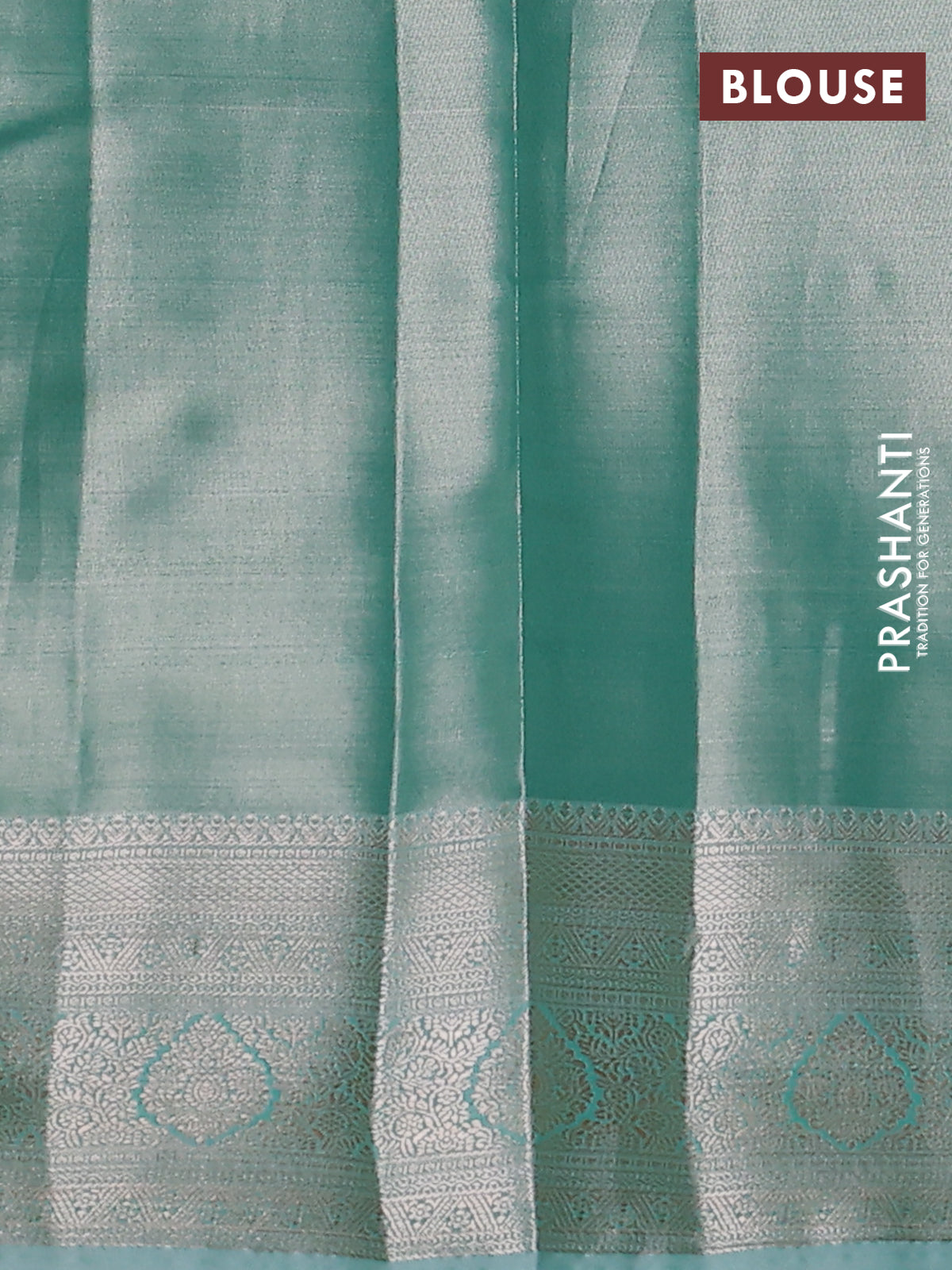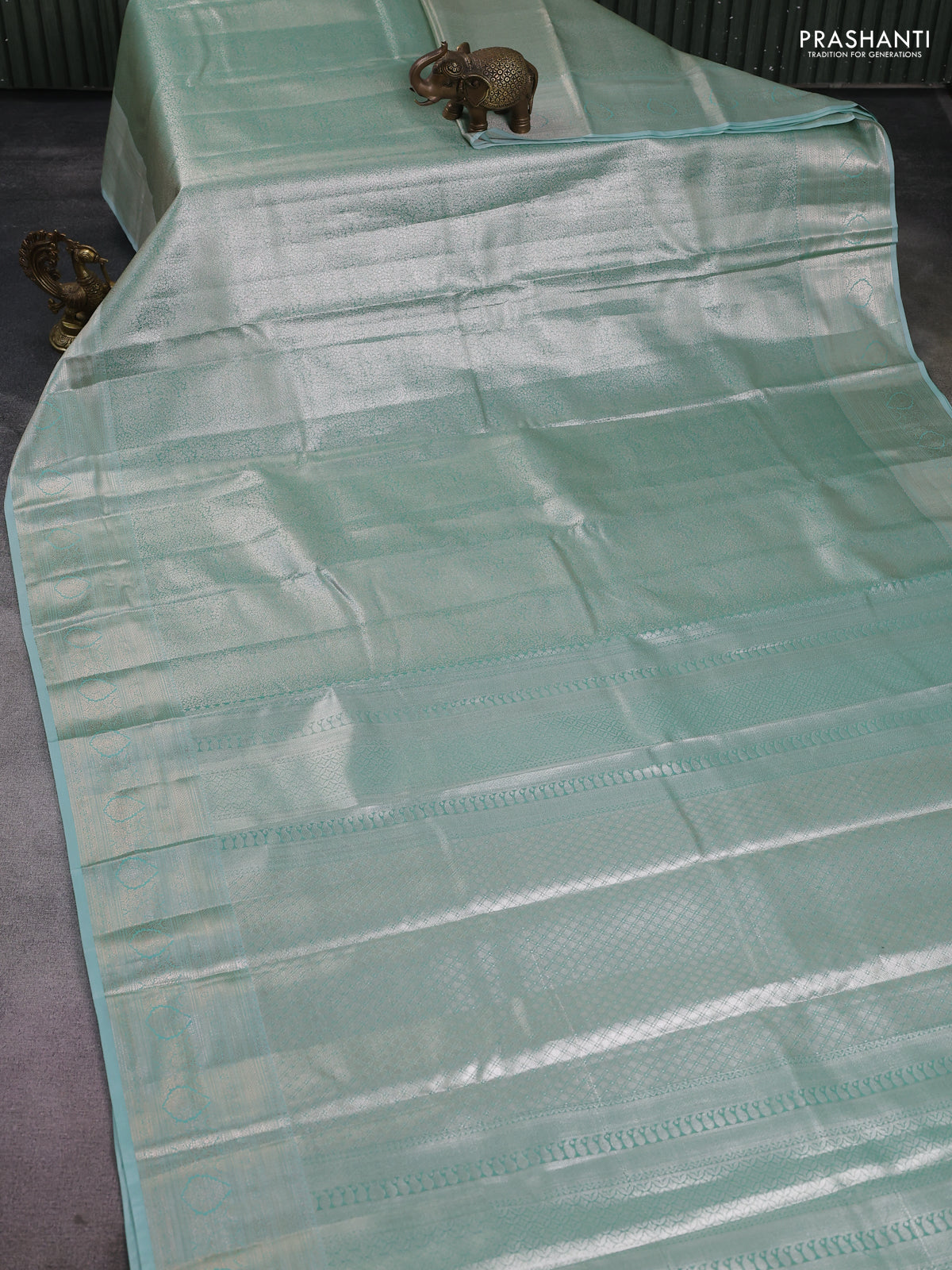 Semi kanchipuram tissue silk saree teal shade with allover silver zari woven brocade weaves and zari woven border