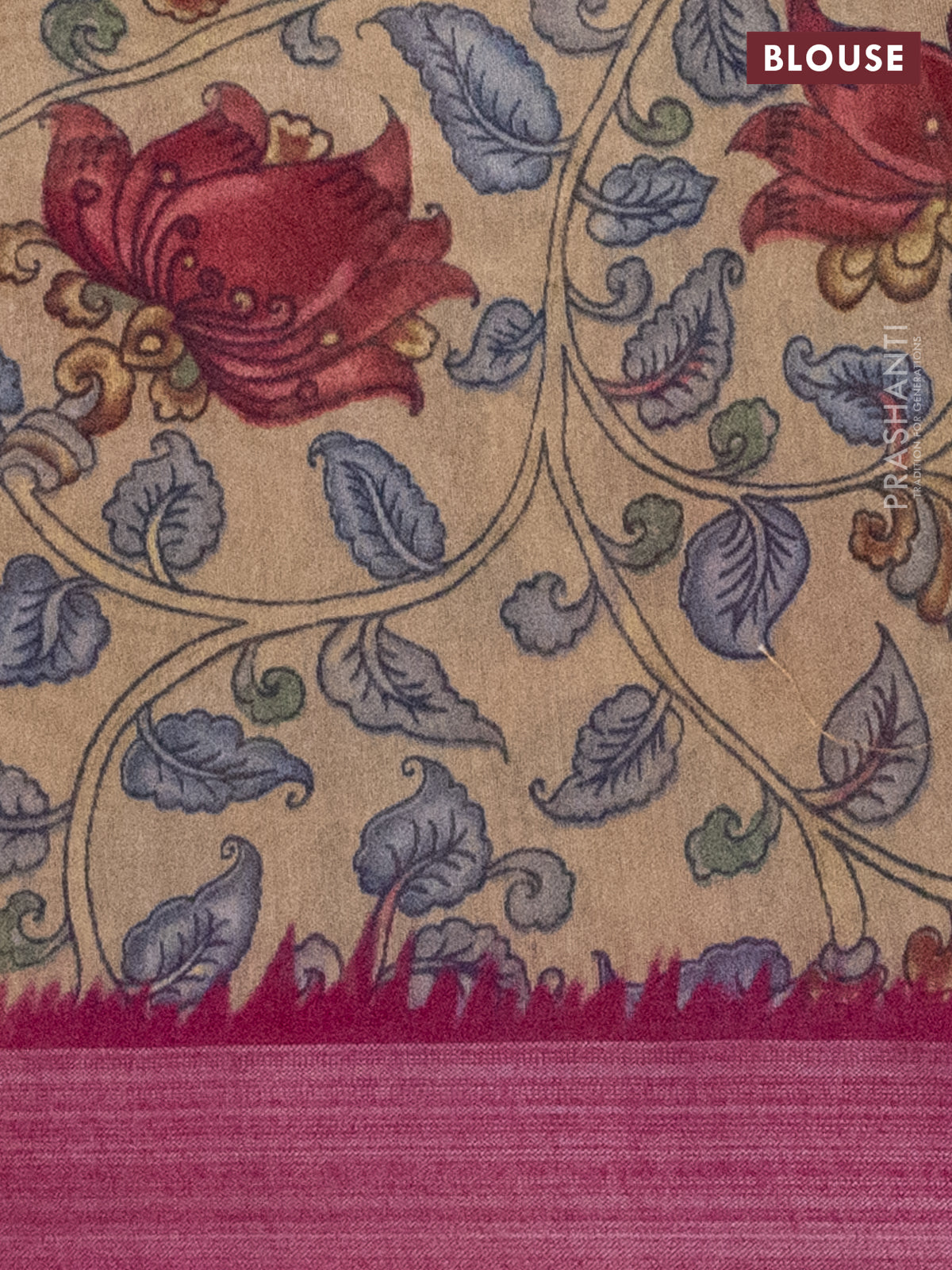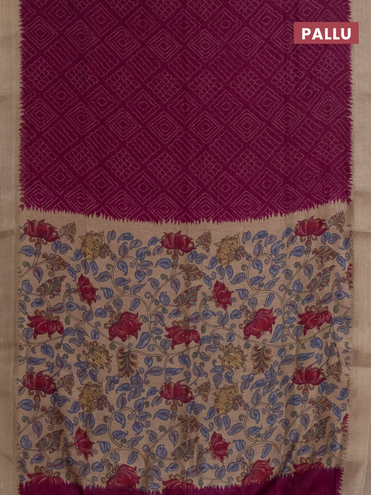 Semi linen saree dark magenta pink and beige with allover bandhani prints and kalamkari printed pallu & blouse