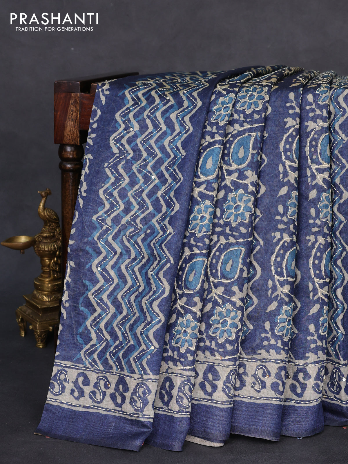 Semi linen saree indigo blue and beige with allover prints & kantha work stitch work