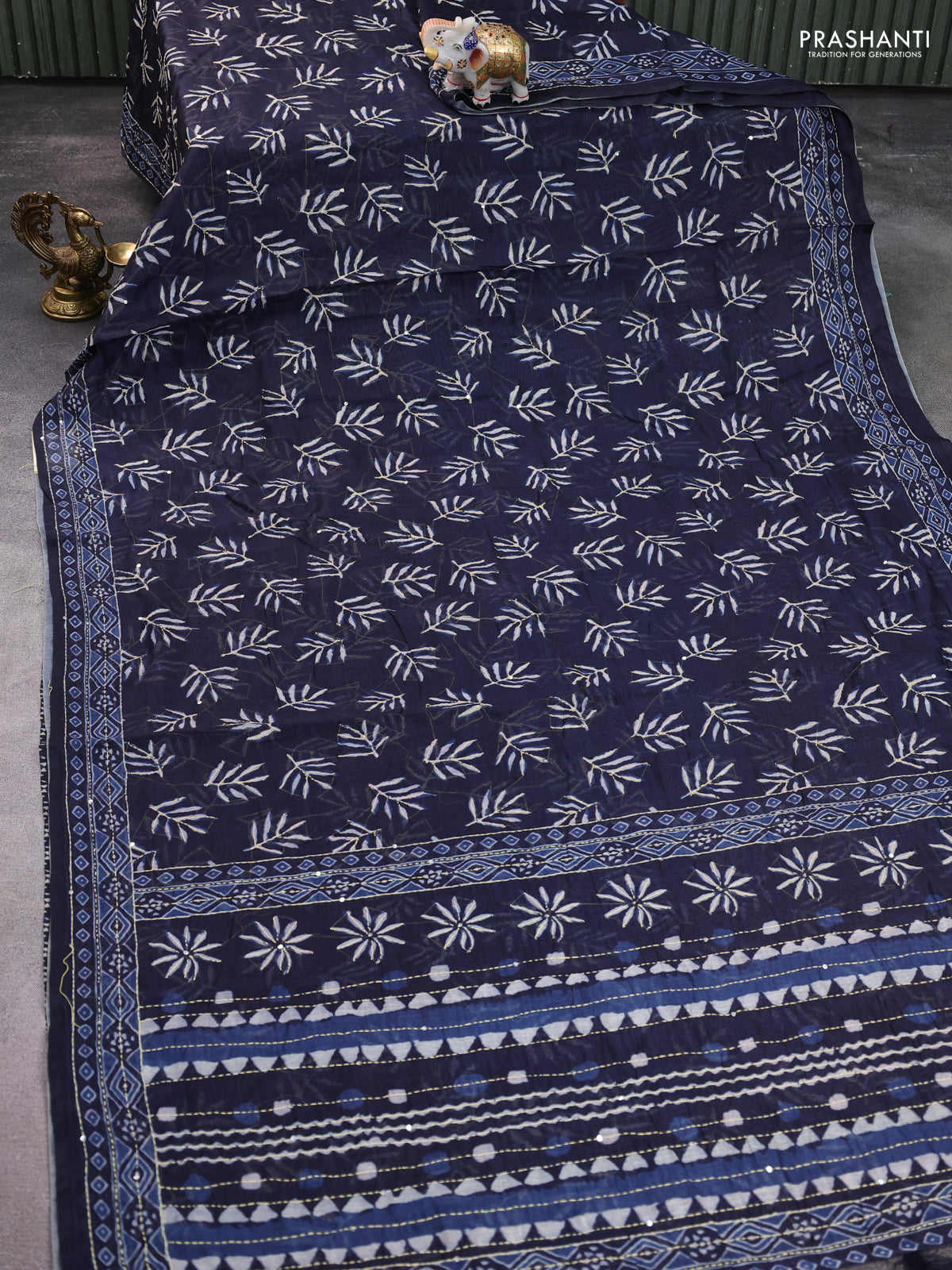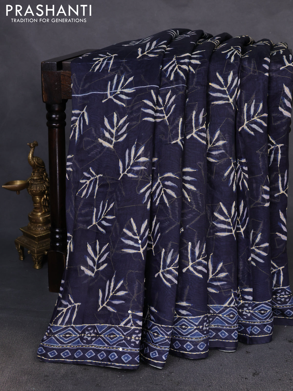 Semi linen saree navy blue with allover leaf prints & kantha stitch work