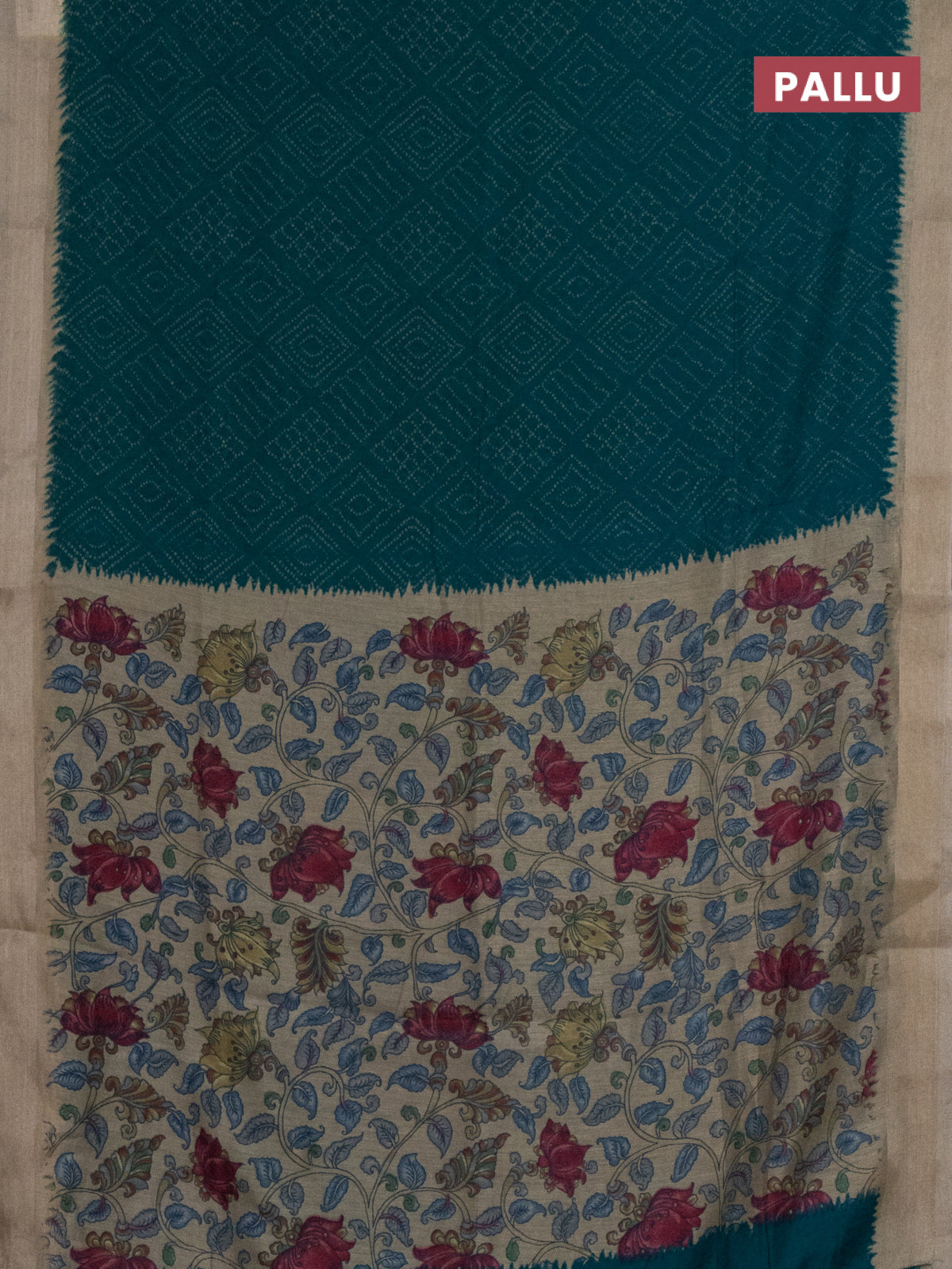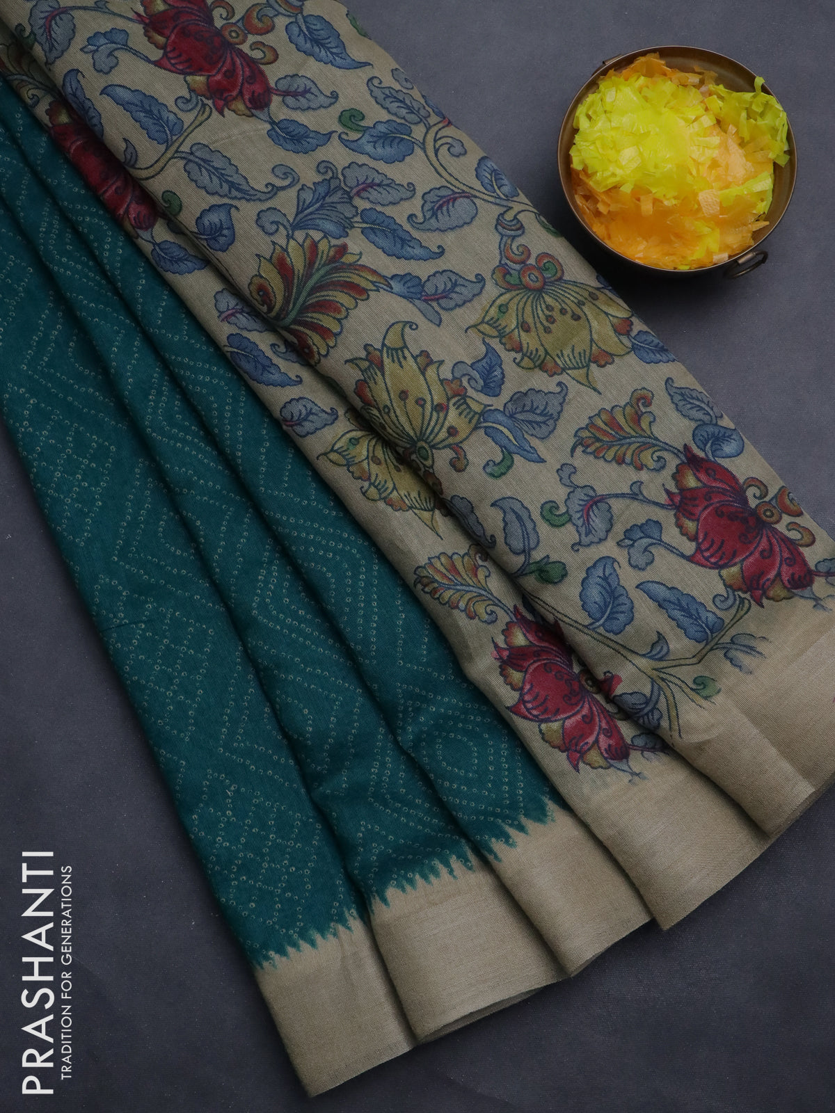 Semi linen saree teal blue and beige with allover bandhani prints and kalamkari printed pallu & blouse