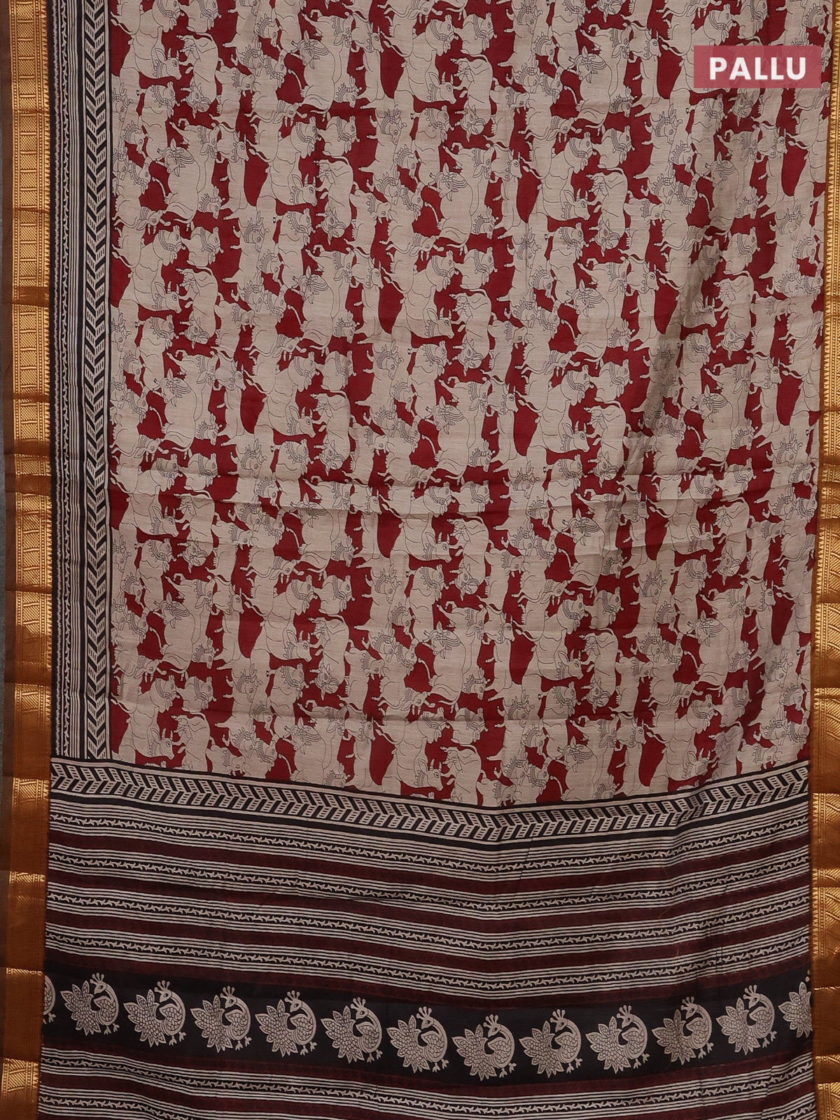 Semi maheshwari cotton saree beige maroon and dark mustard with allover pichwai prints and zari woven border