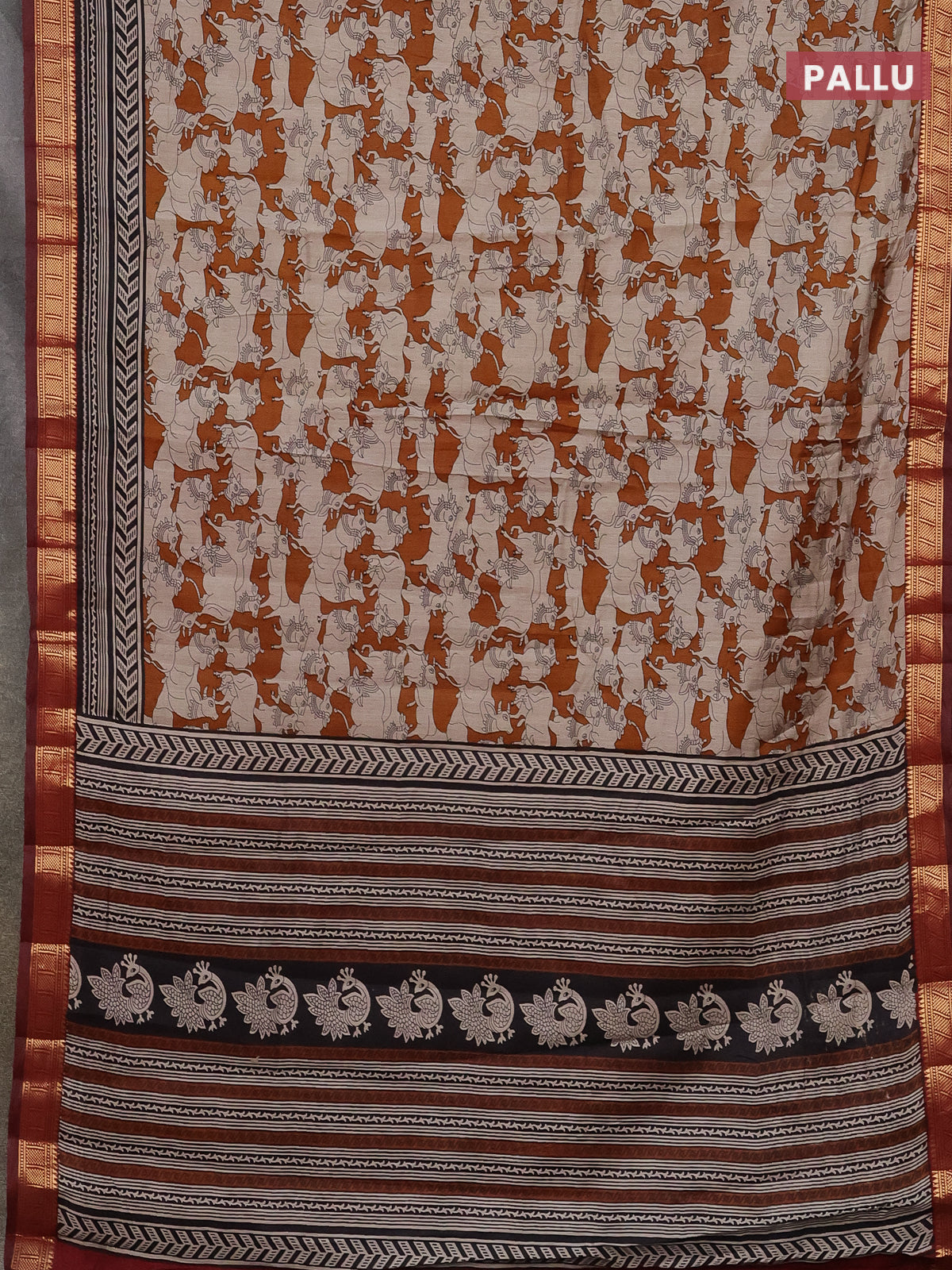 Semi maheshwari cotton saree dark mustard and maroon with allover pichwai prints and zari woven border