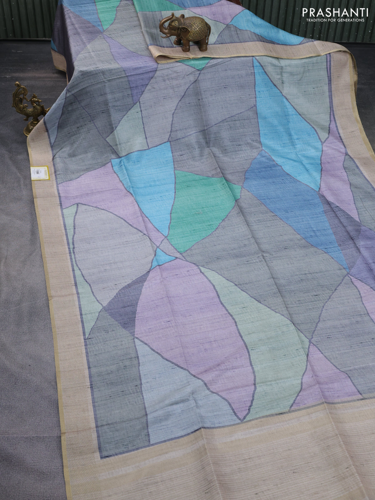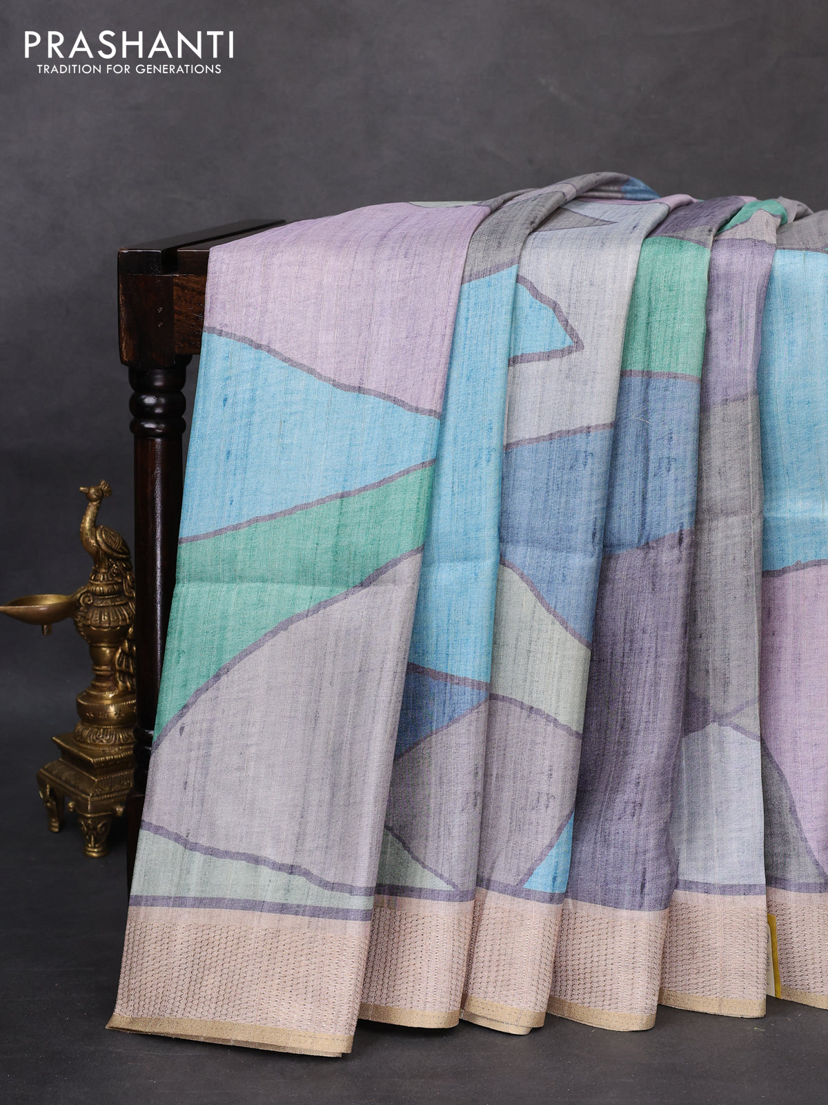 Semi matka saree multi colour green shade and beige with allover geometric prints and zari woven border