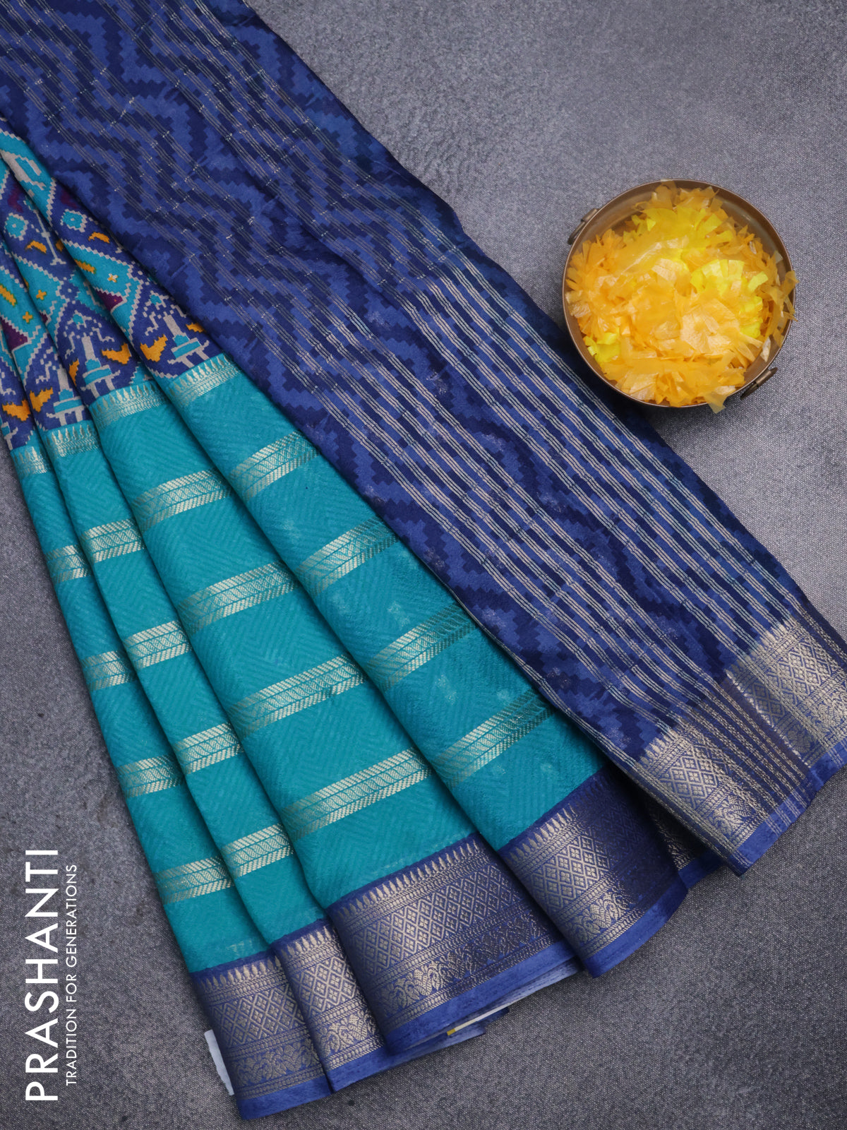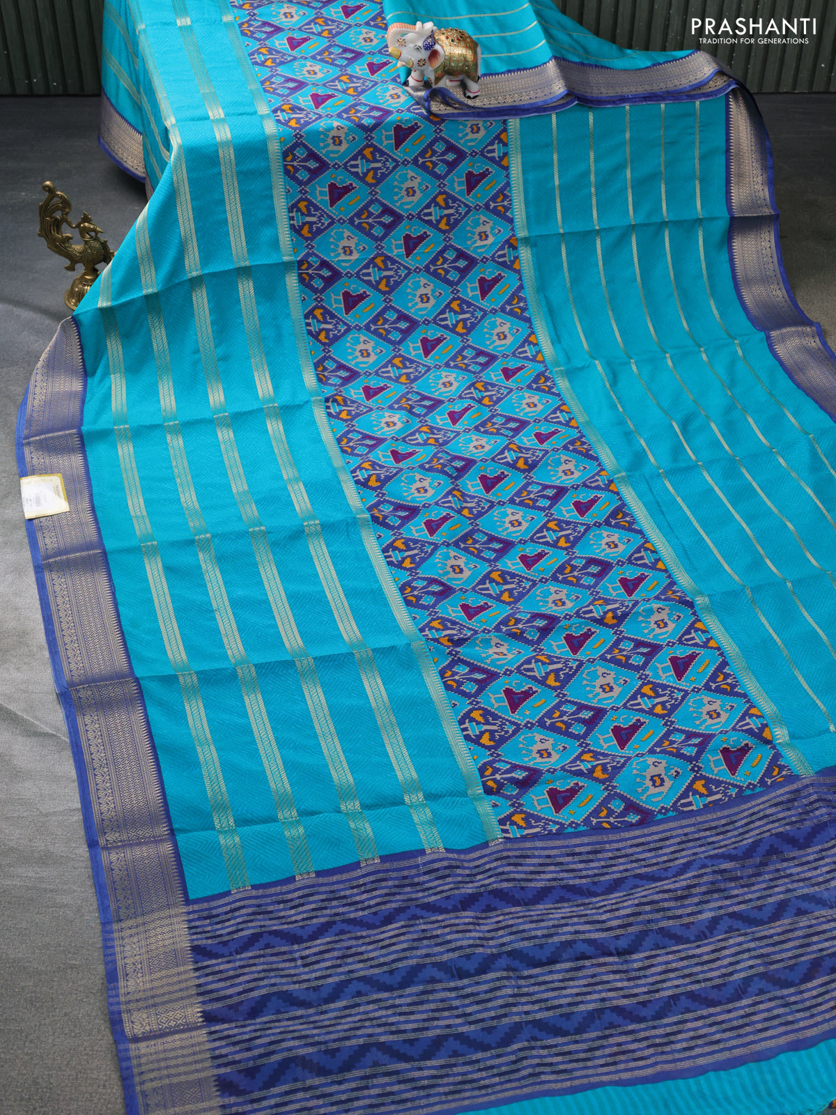 Semi mysore crepe saree blue and teal blue with panel prints and long zari woven border