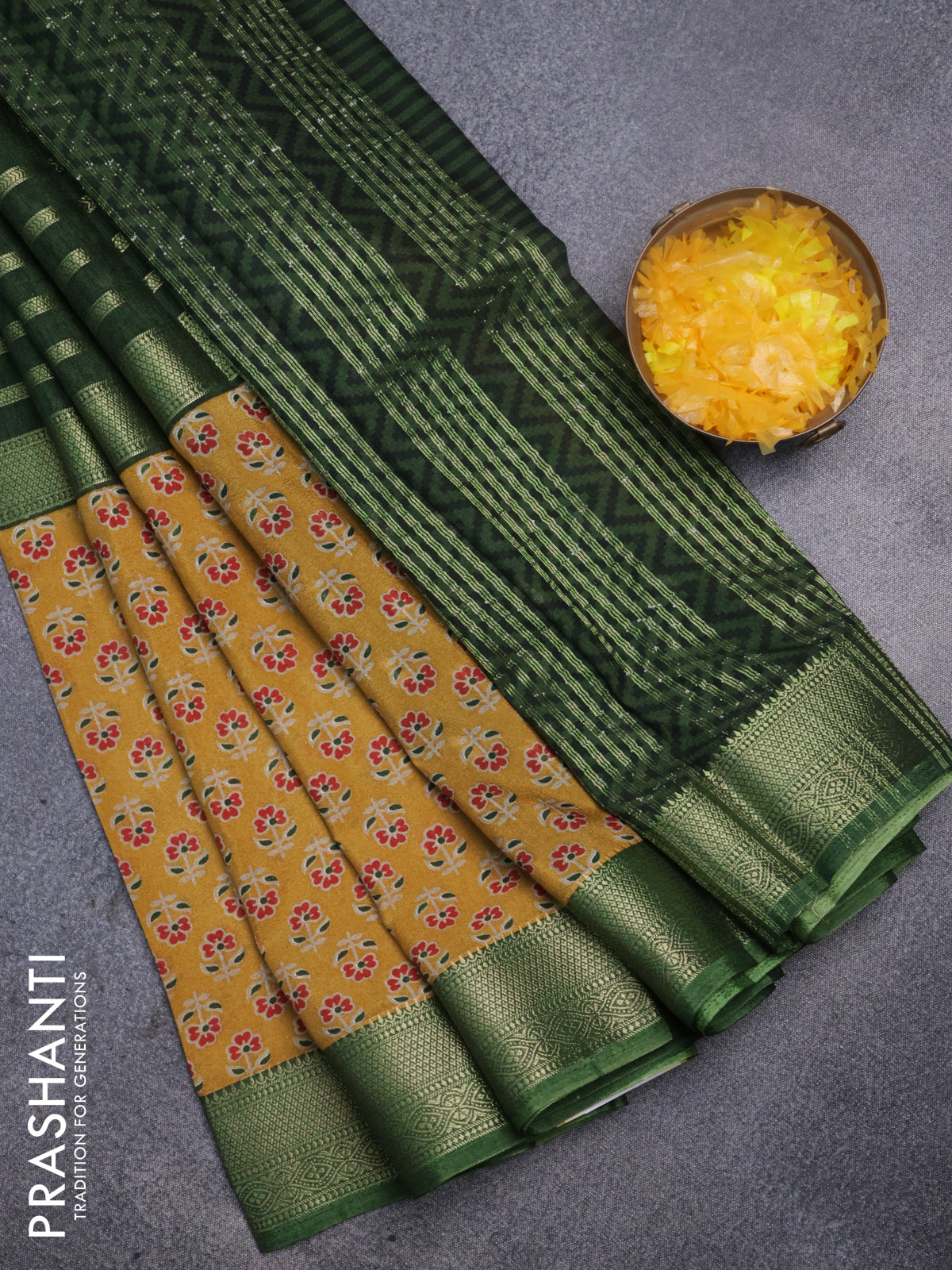 Semi mysore crepe saree green and mustard yellow with zari weaves and long printed border