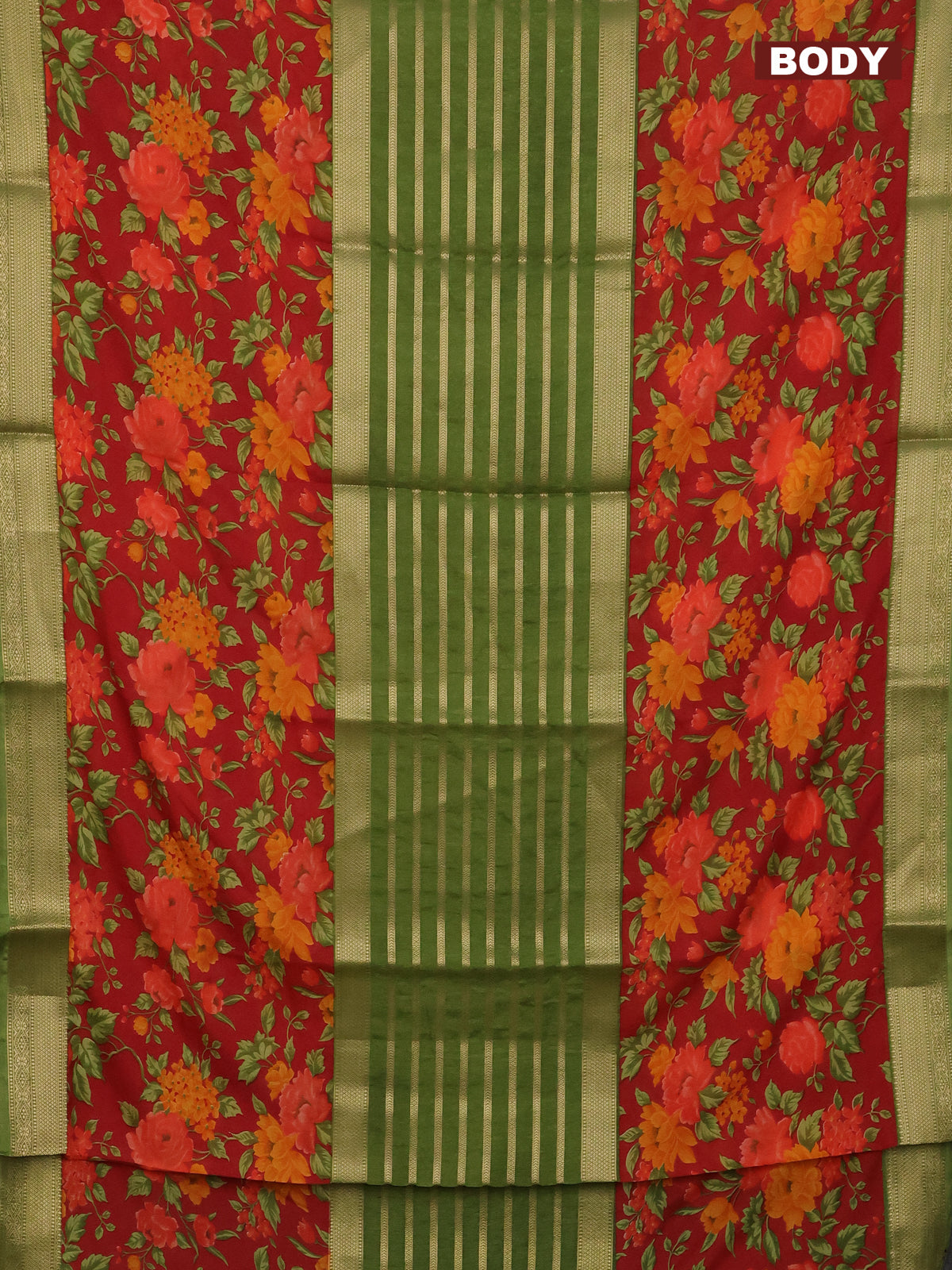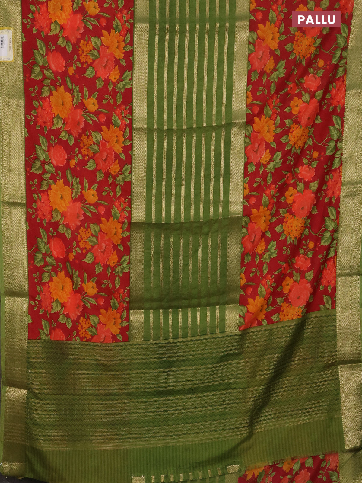 Semi mysore crepe saree green and red with zari weaves and long printed border