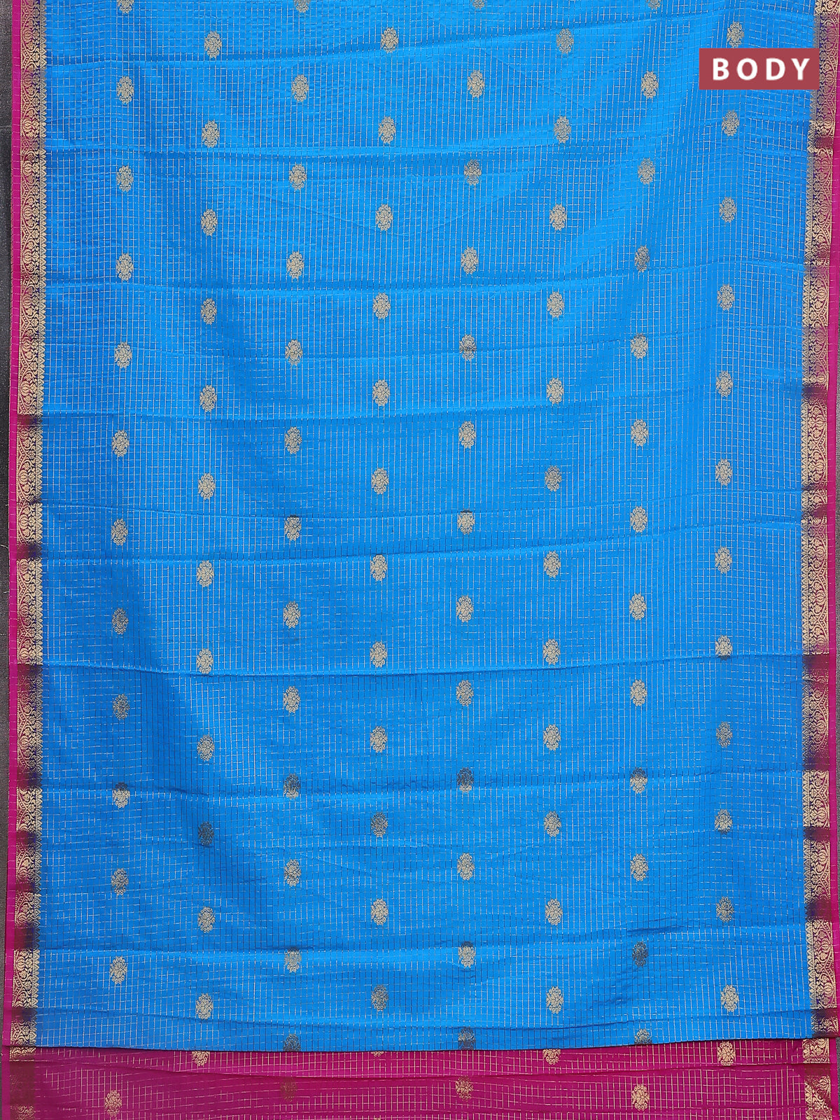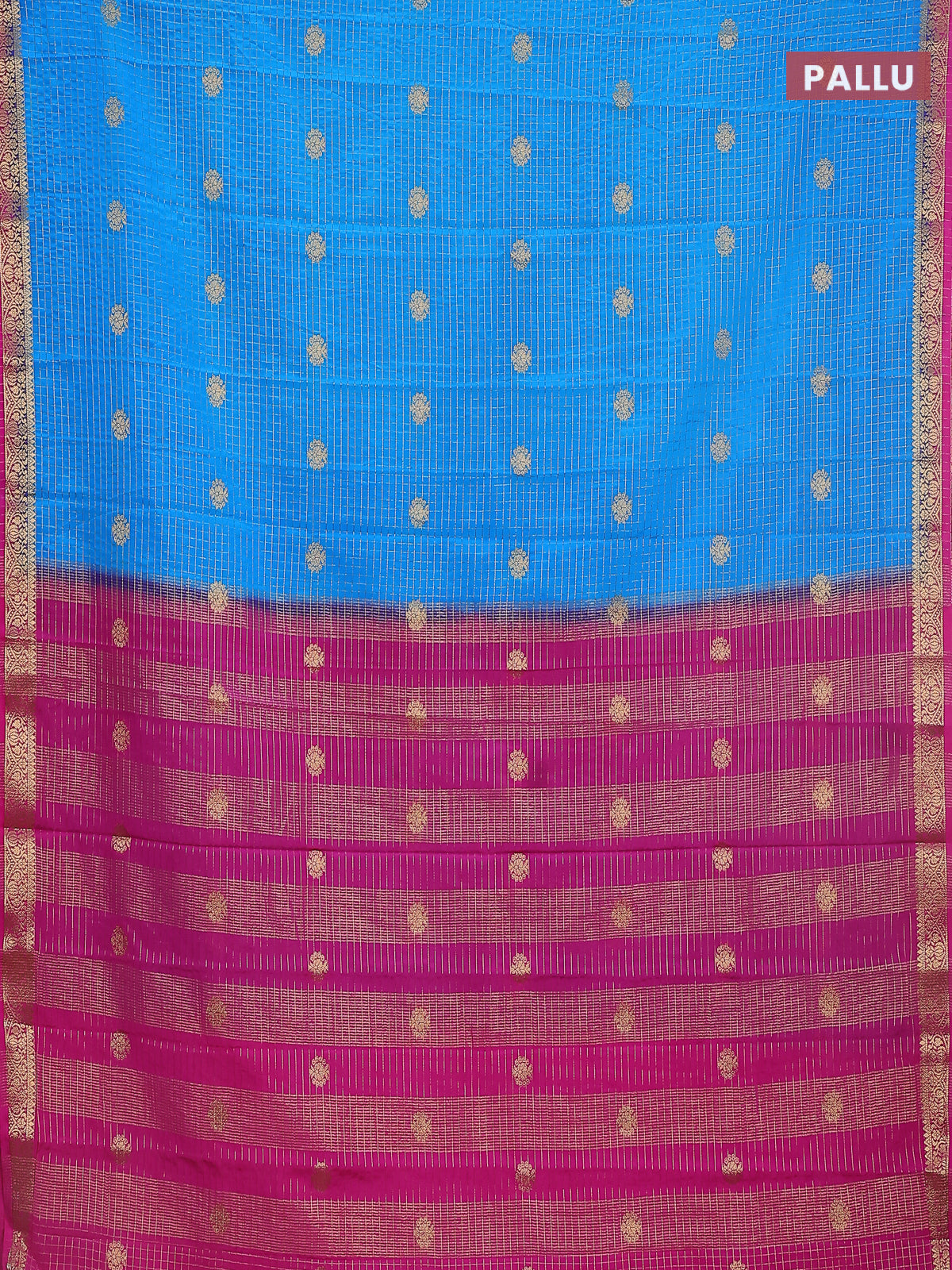 Semi mysore silk saree cs blue and pink with allover zari checks & buttas and zari woven border