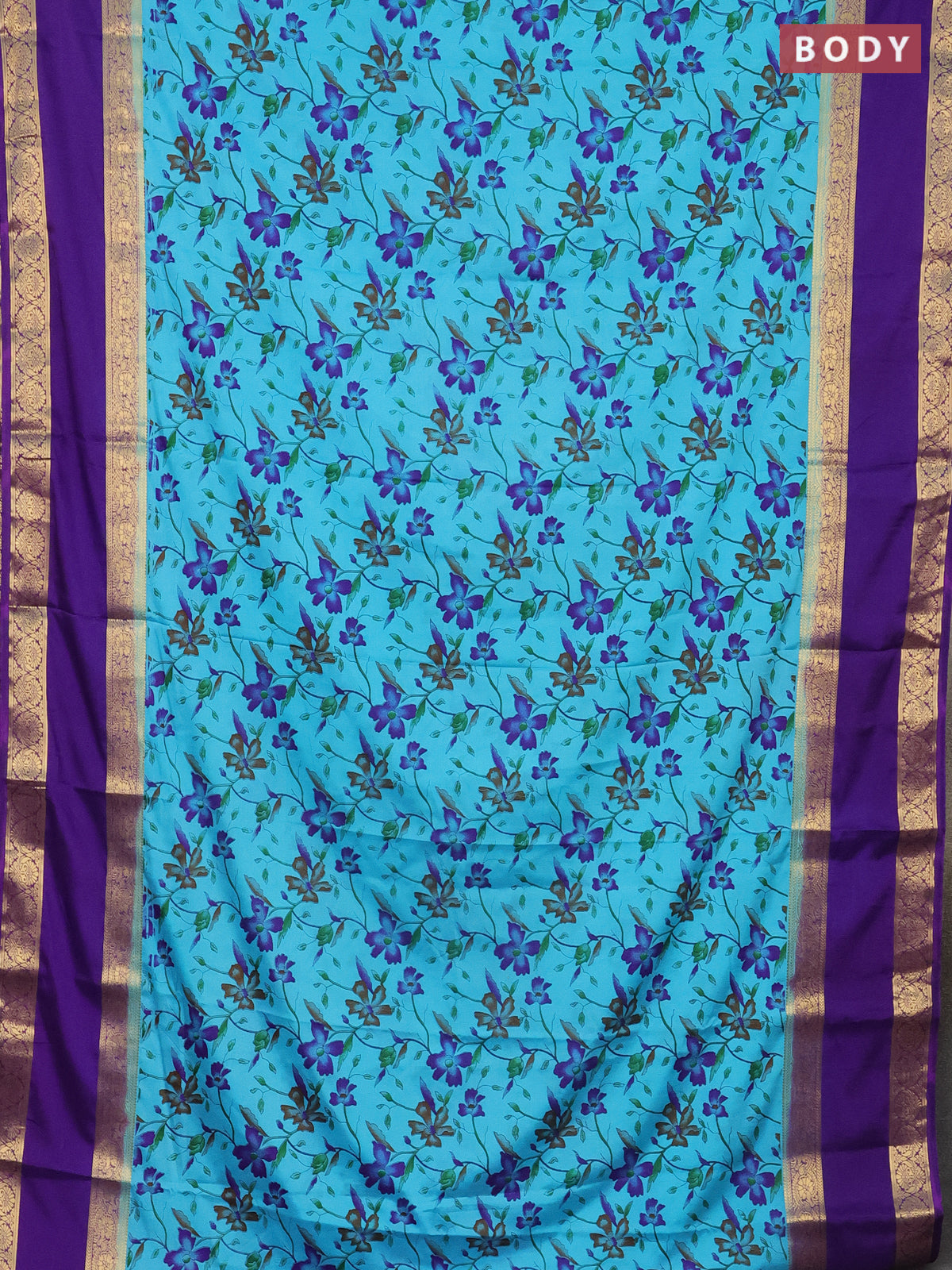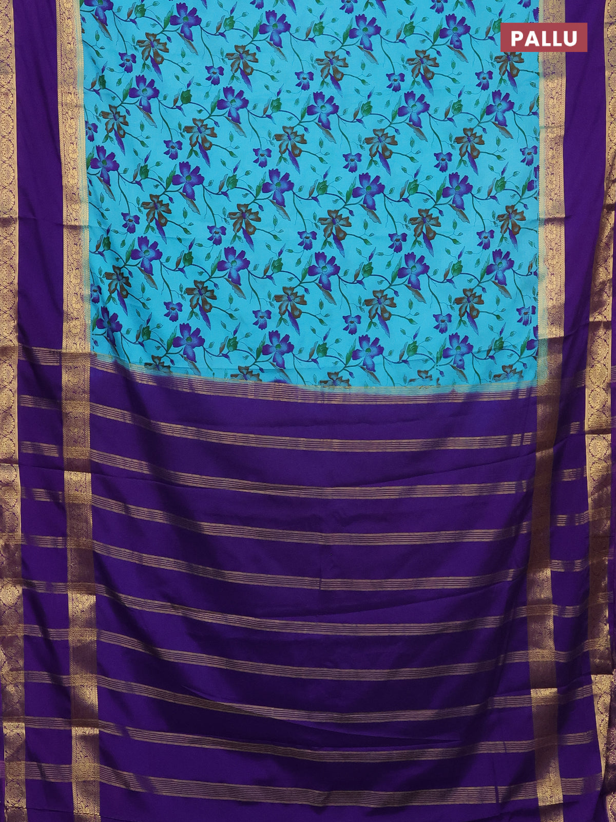 Semi mysore silk saree light blue and violet with allover floral prints and rettapet zari woven border