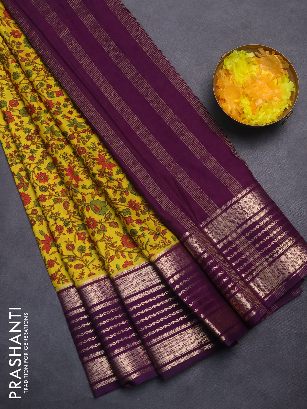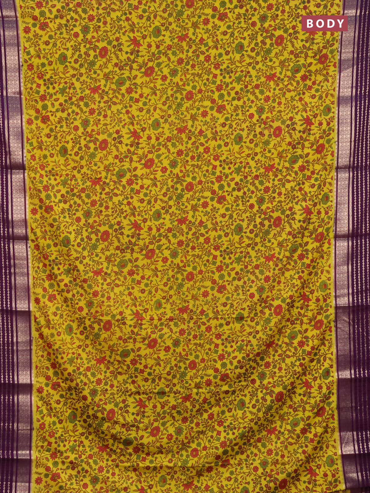 Semi mysore silk saree lime yellow and deep purple with allover kalamkari prints and zari owven border