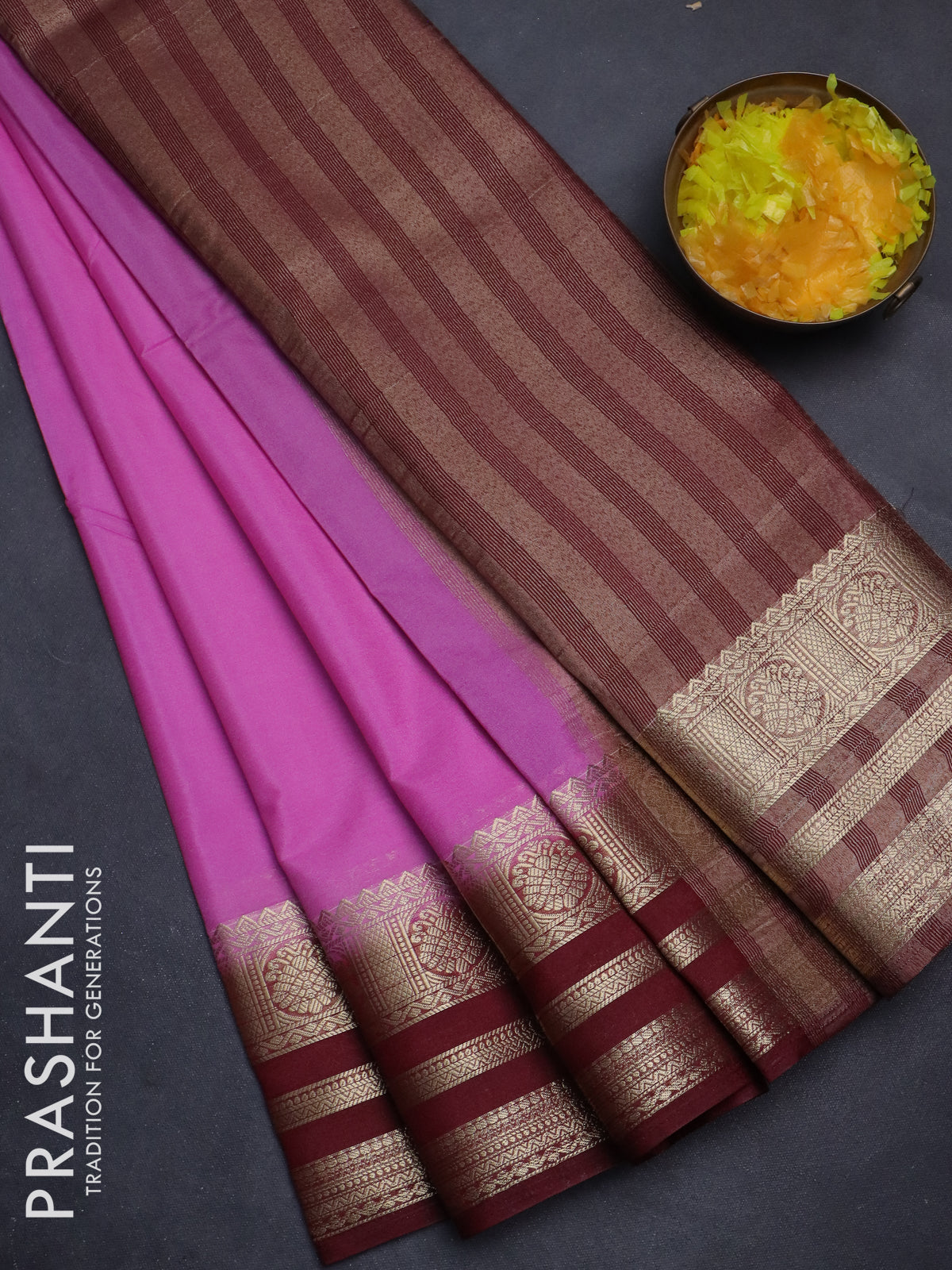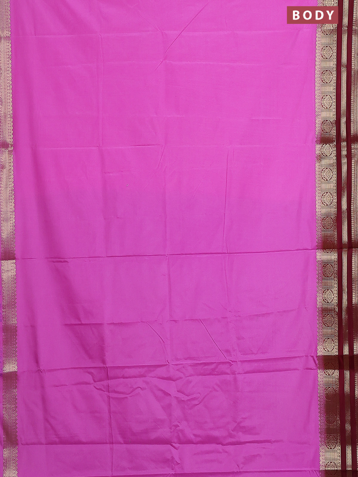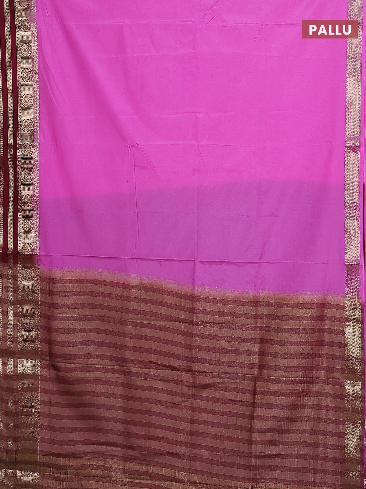 Semi mysore silk saree lotus pink and deep maroon with plain body and zari woven border