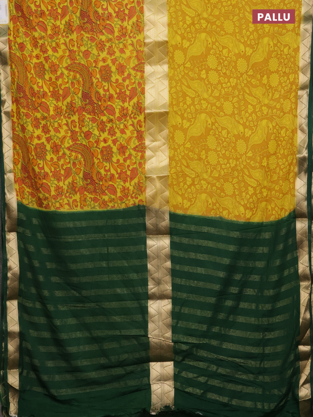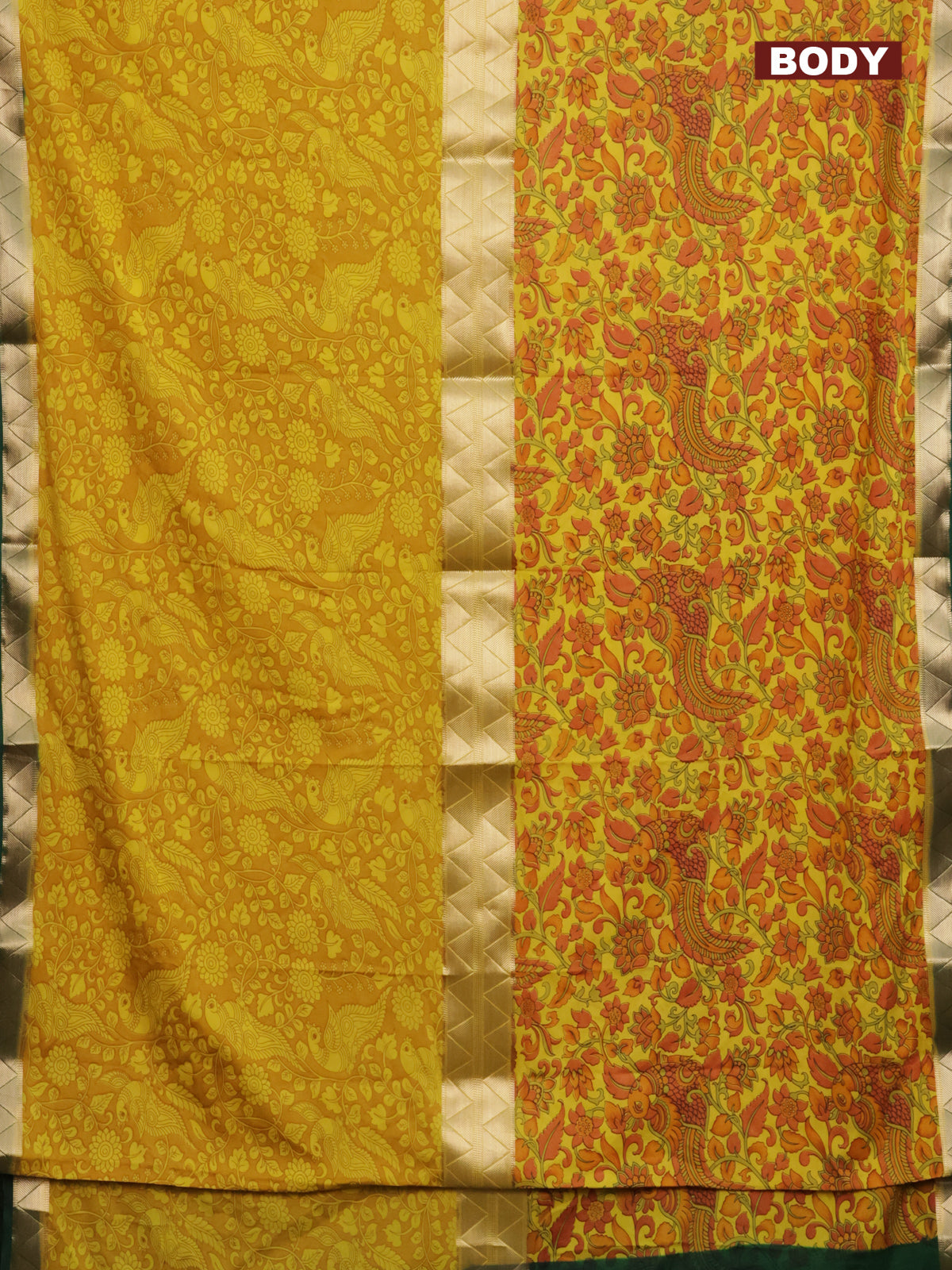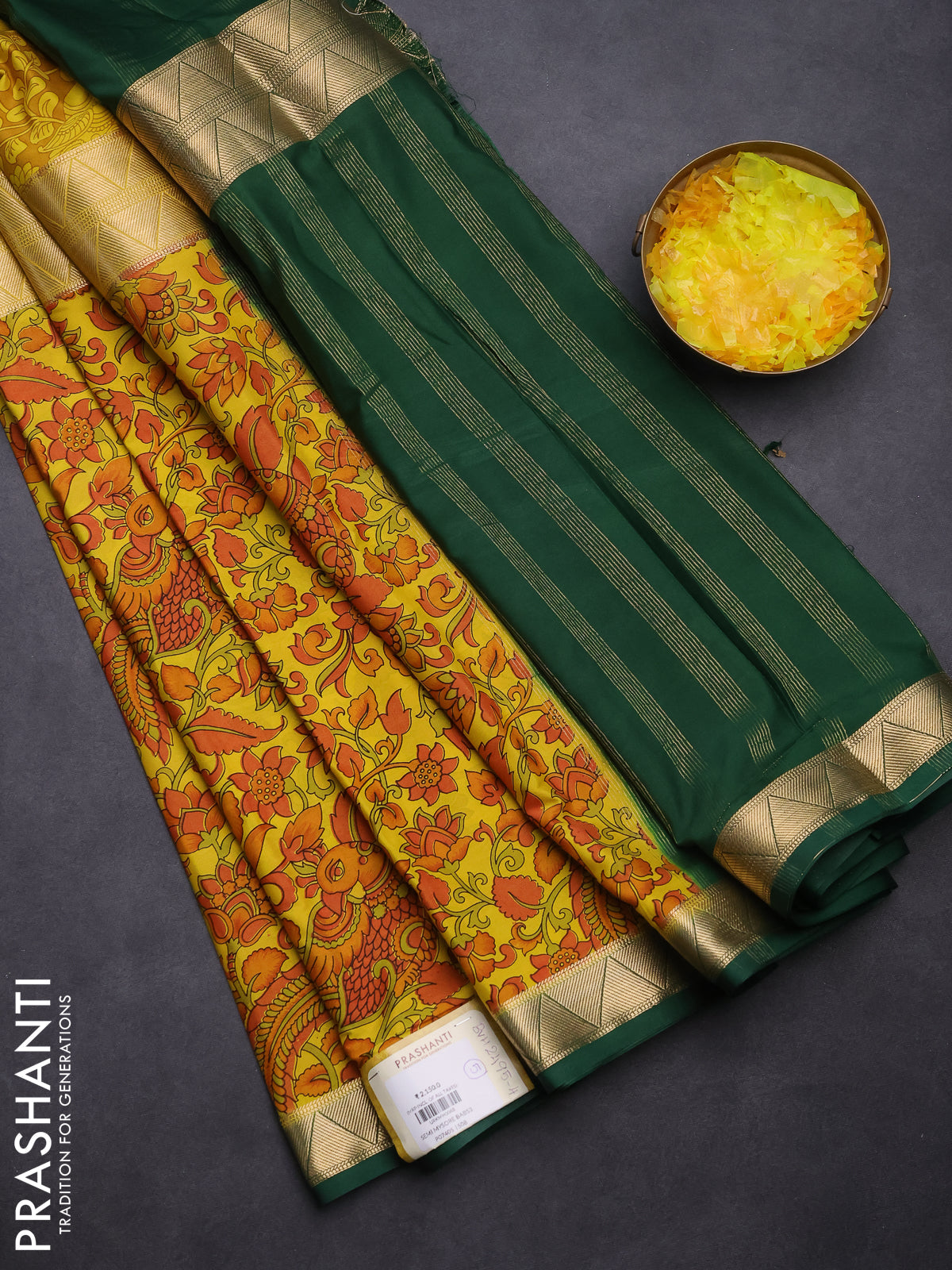Semi mysore silk saree mustard yellow and dark green with allover half & half style and printed zari border