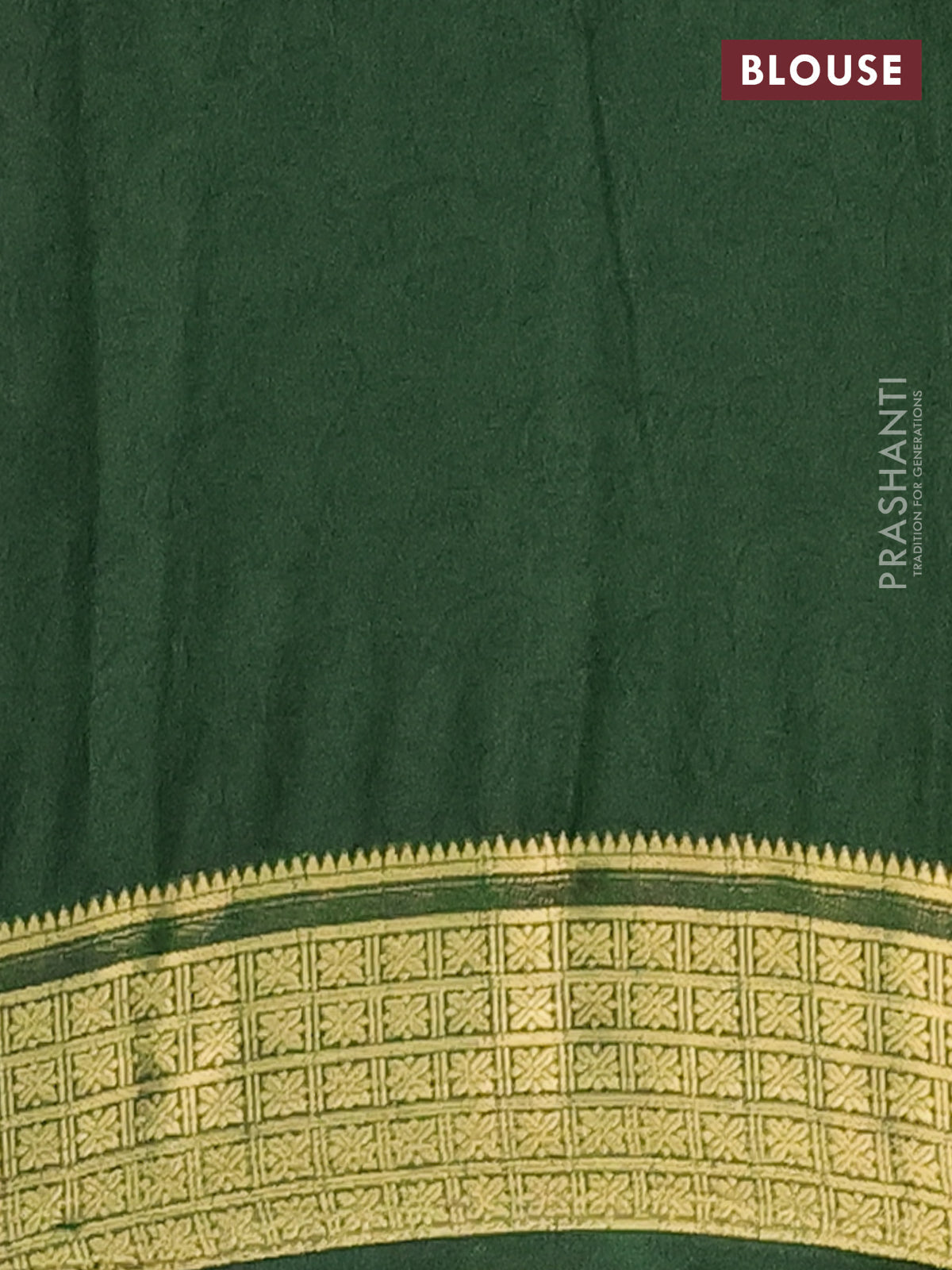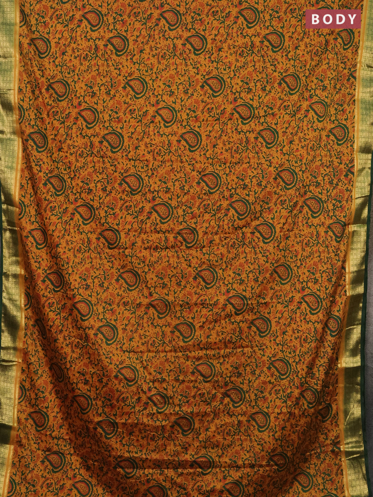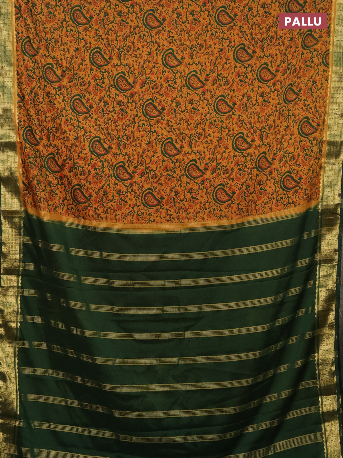 Semi mysore silk saree mustard yellow and green with allover prints and zari woven border