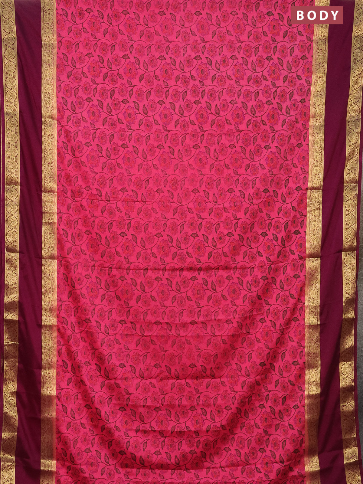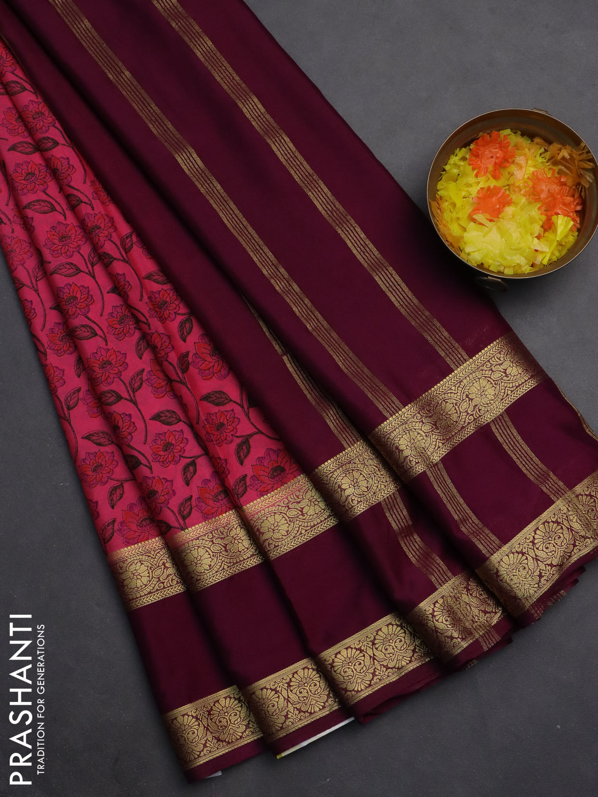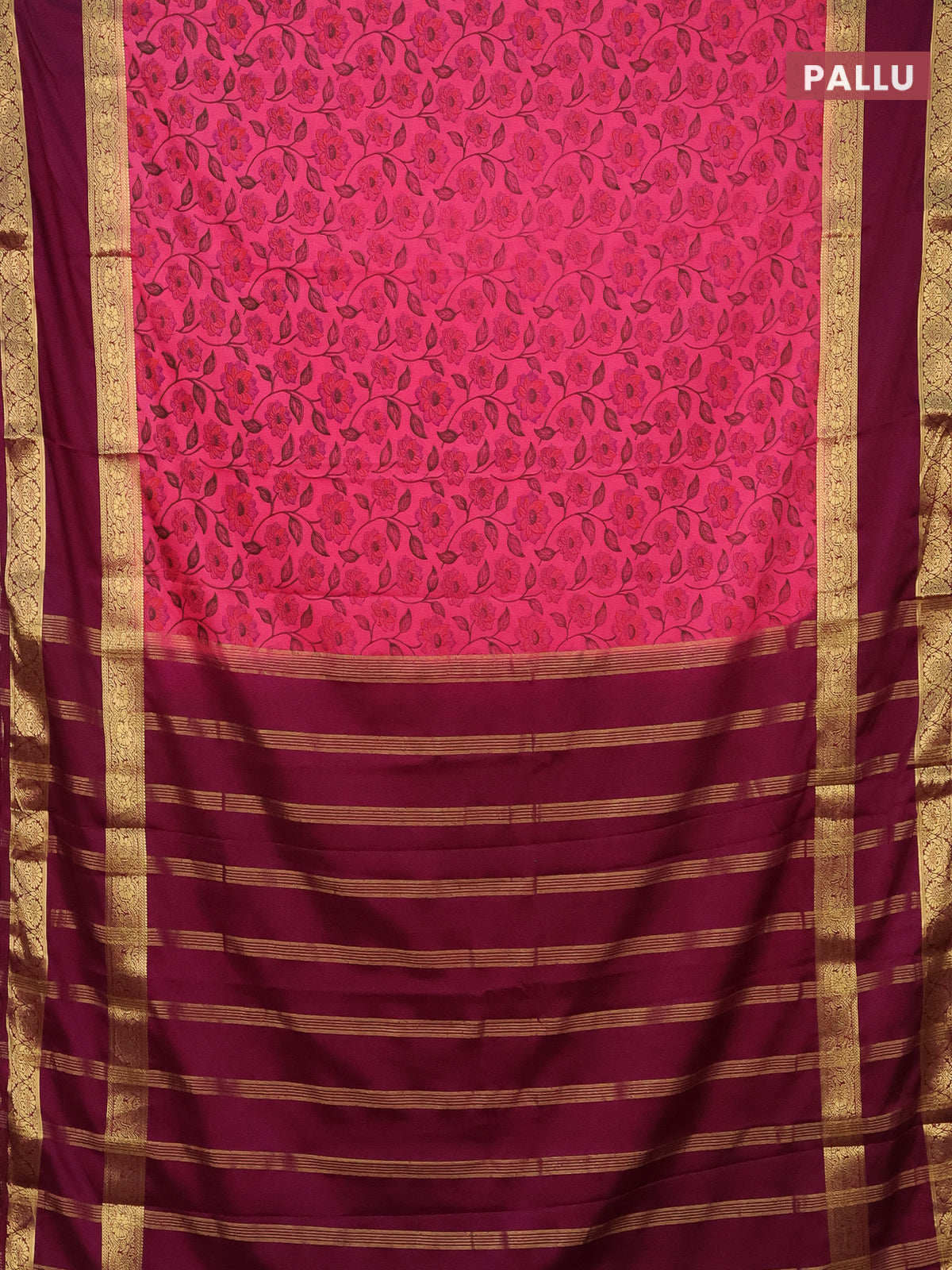 Semi mysore silk saree pink and purple with allover floral prints and rettapet zari woven border
