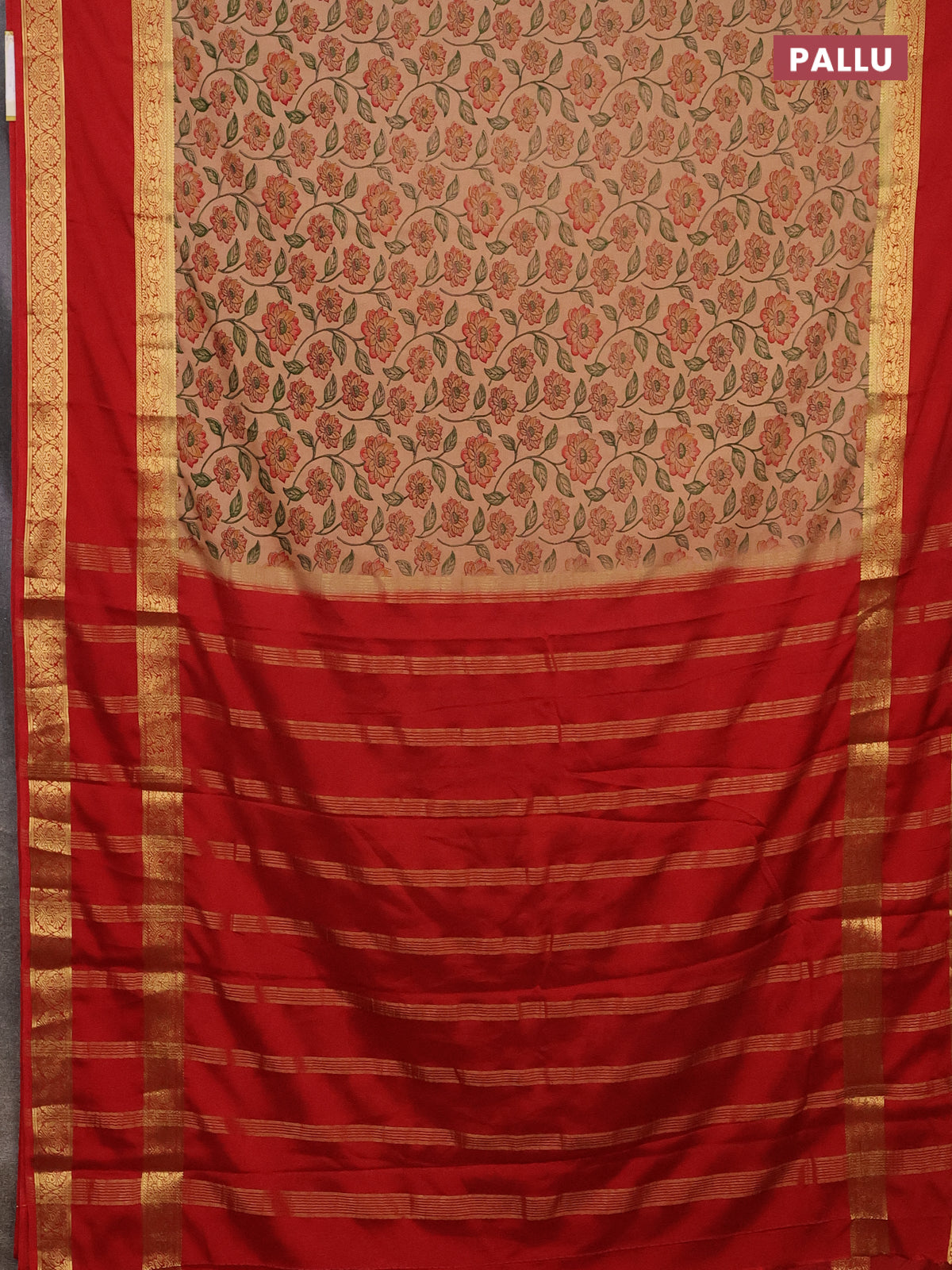 Semi mysore silk saree sandal and red with allover floral prints and rettapet zari woven border