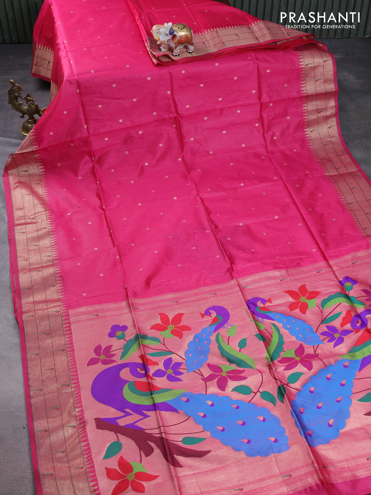 Semi paithani saree pink with allover zari woven buttas and peacock design paithani pallu
