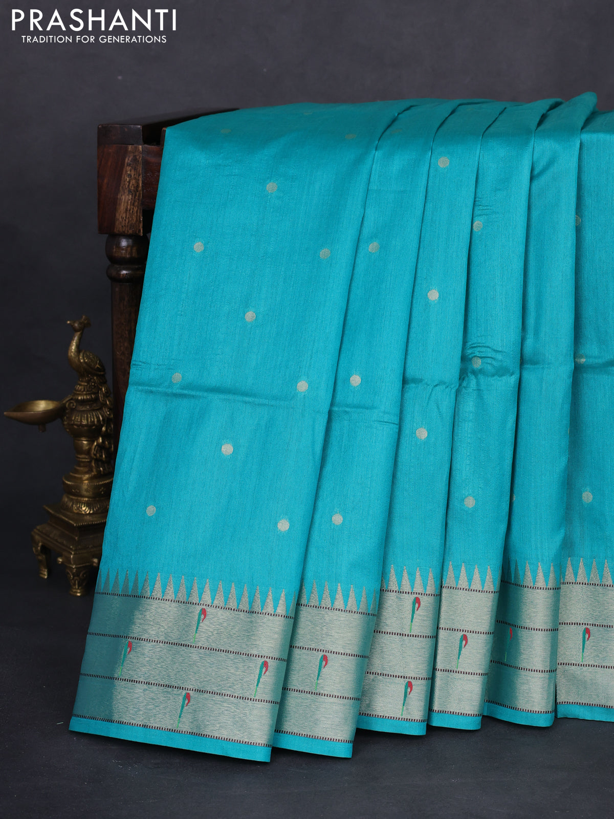 Semi paithani saree teal green shade with allover zari woven buttas and peacock design paithani pallu