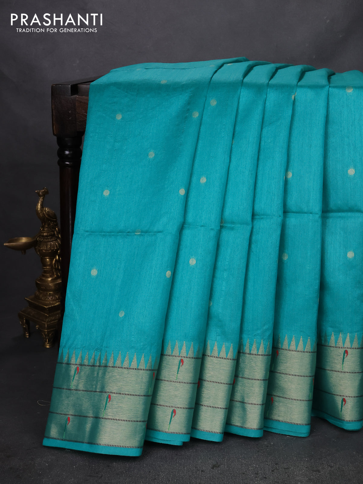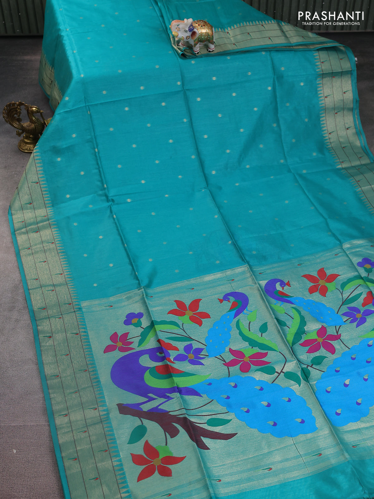 Semi paithani saree teal green with zari woven buttas and peacock design paithani weaving pallu
