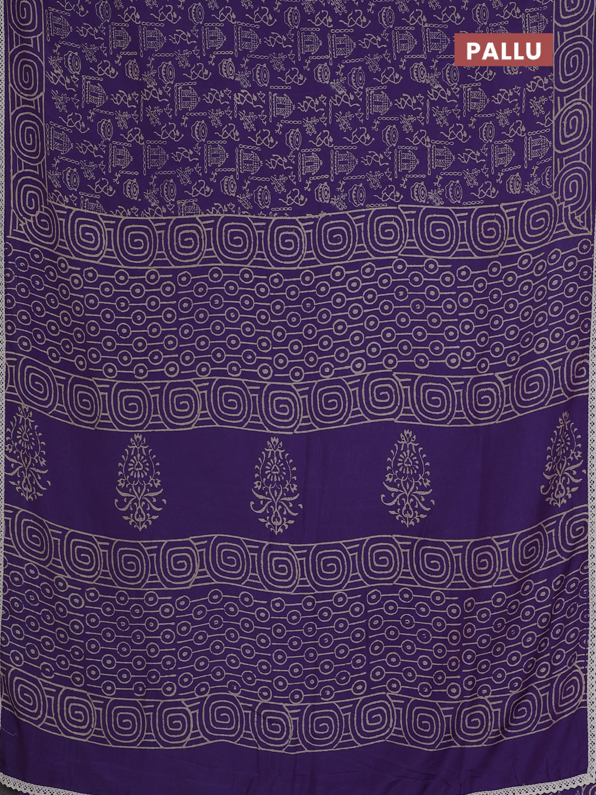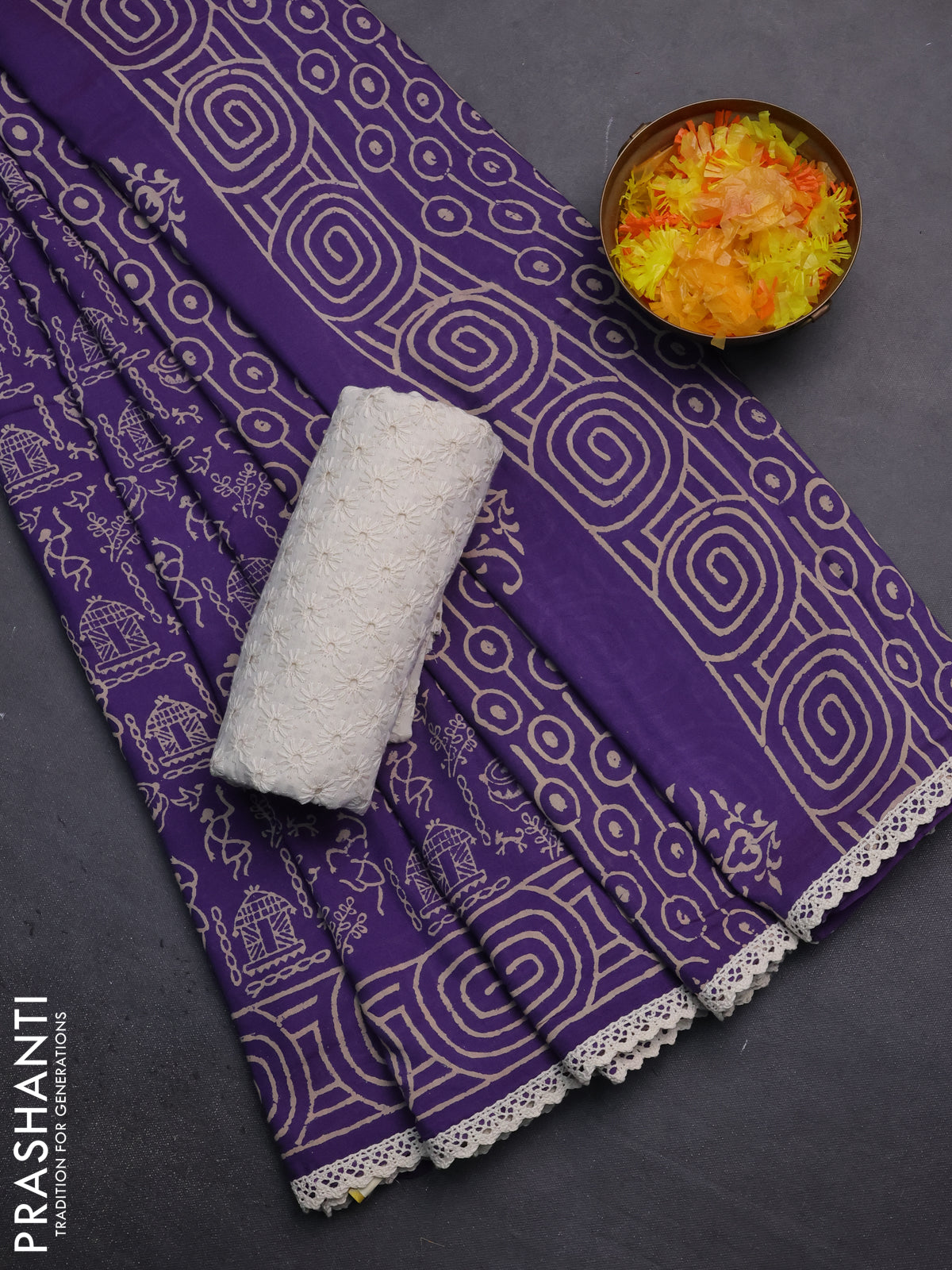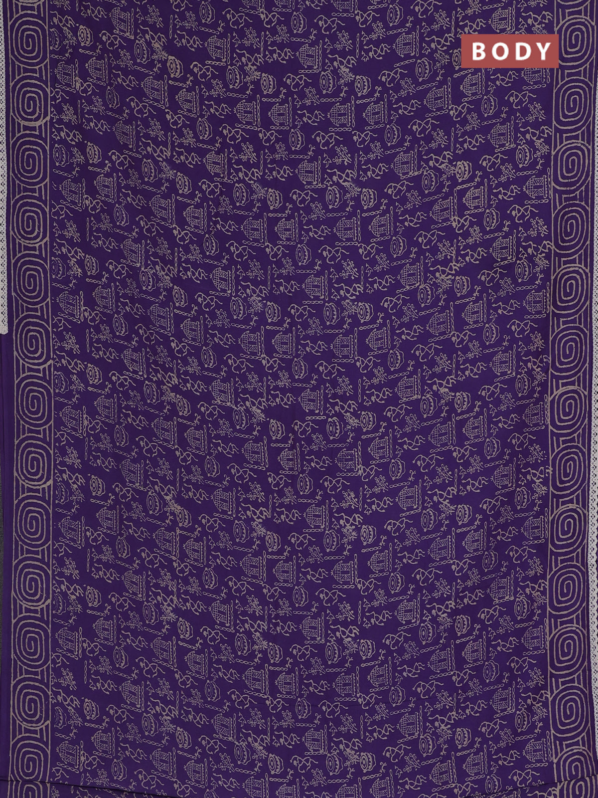 Semi pashmina silk saree violet and cream with allover warli prints and crocia lace work border