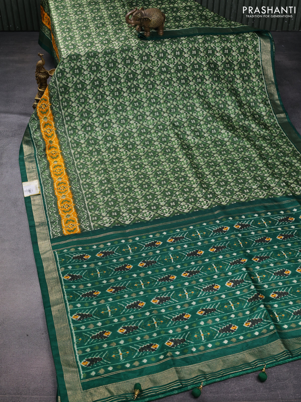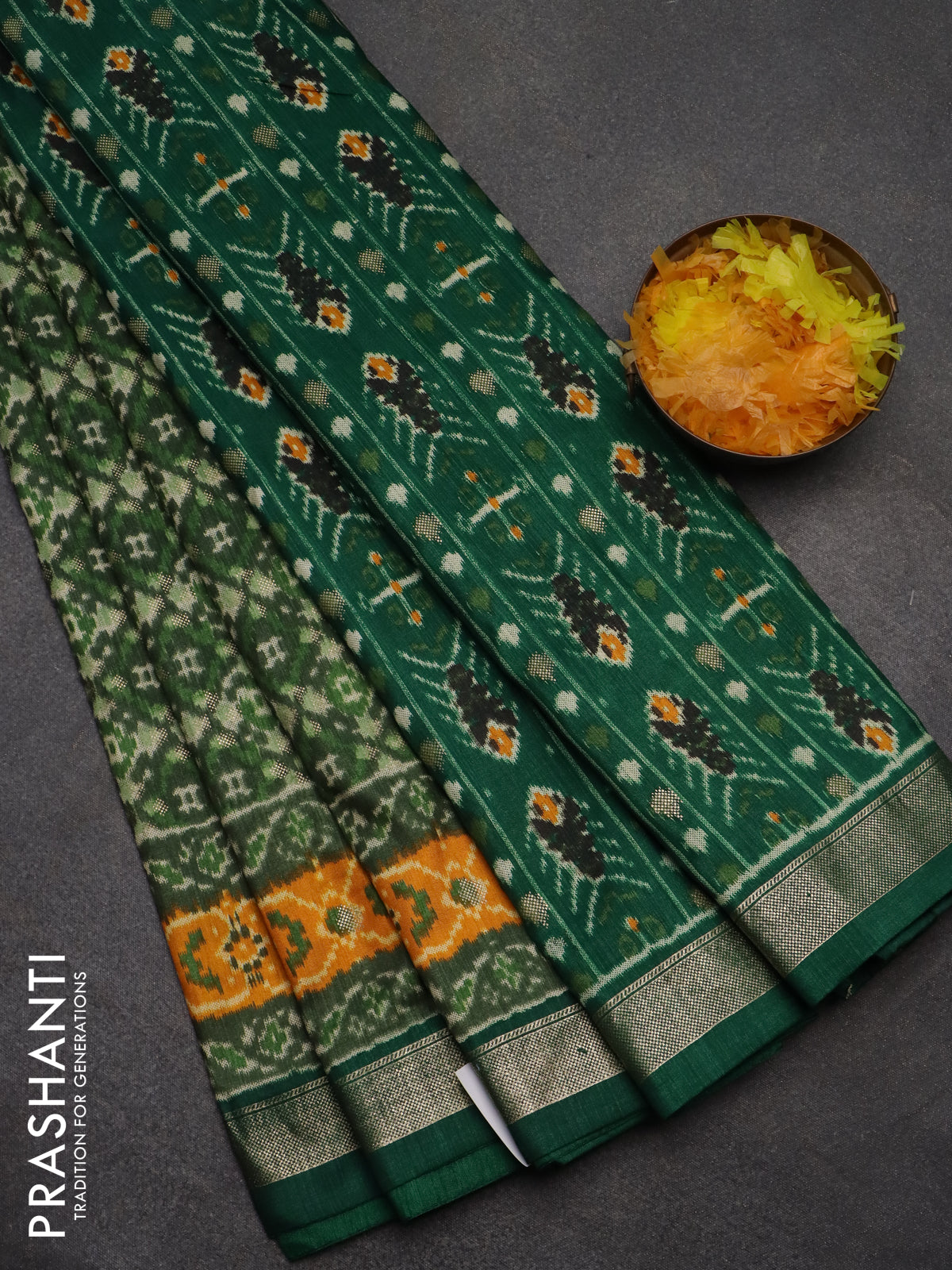 Semi pochampally saree green and mango yellow with allover ikat prints and zari woven border