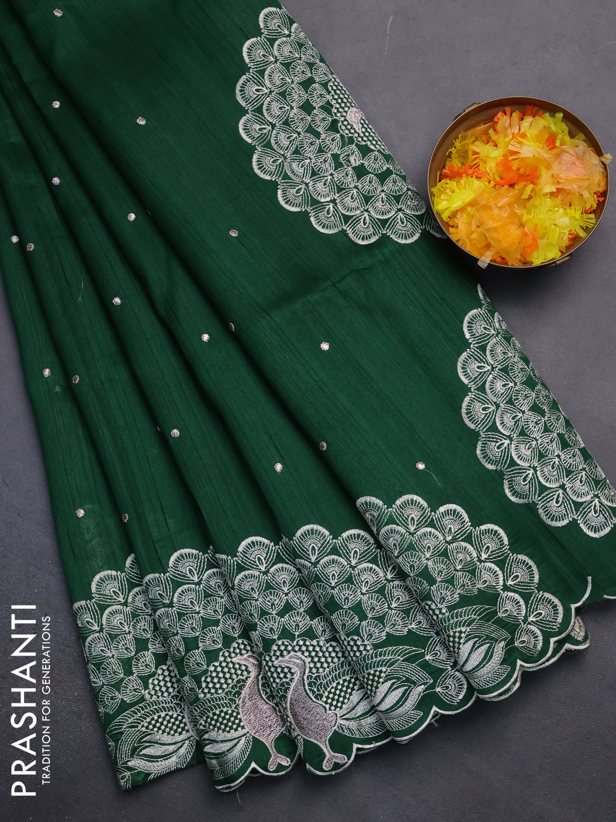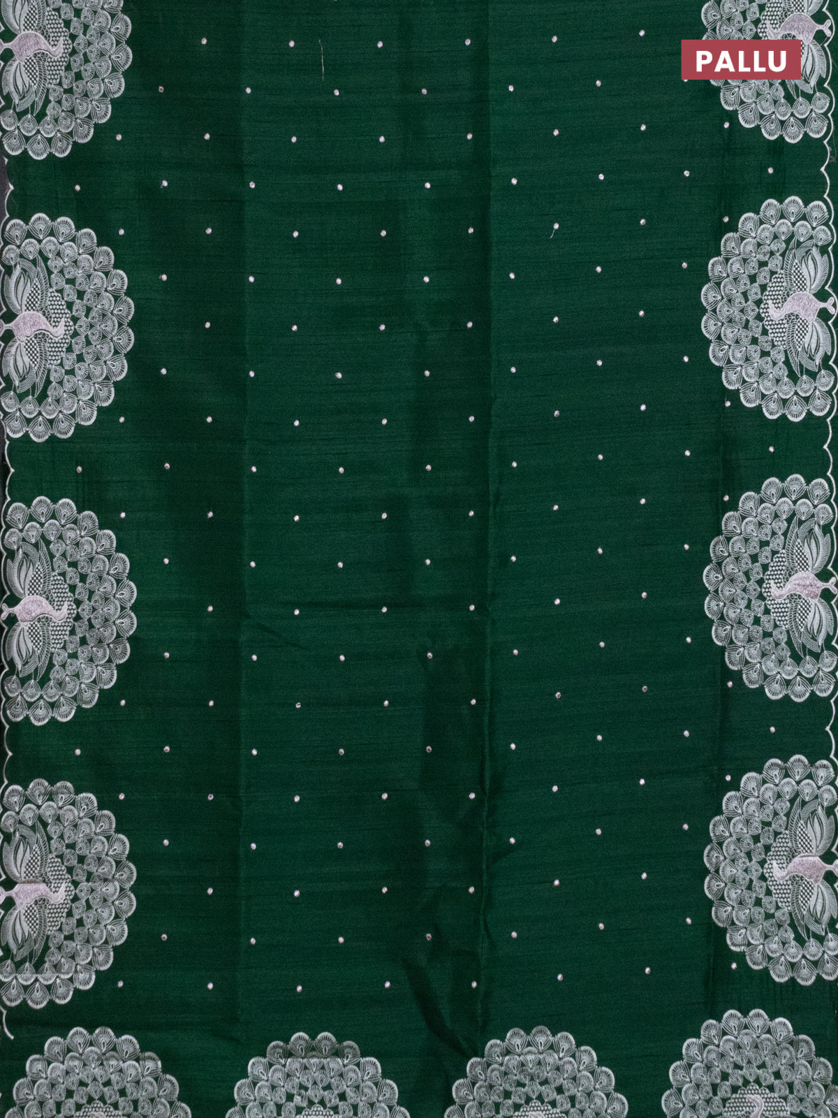 Semi raw silk saree dark green with embroidery work buttas and peacock embroidery border