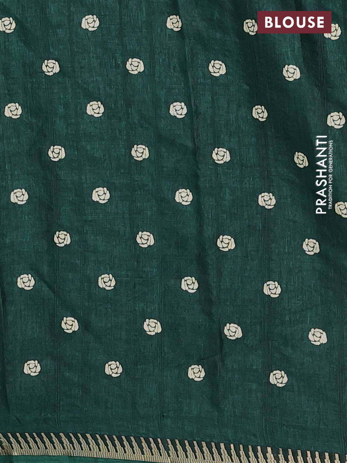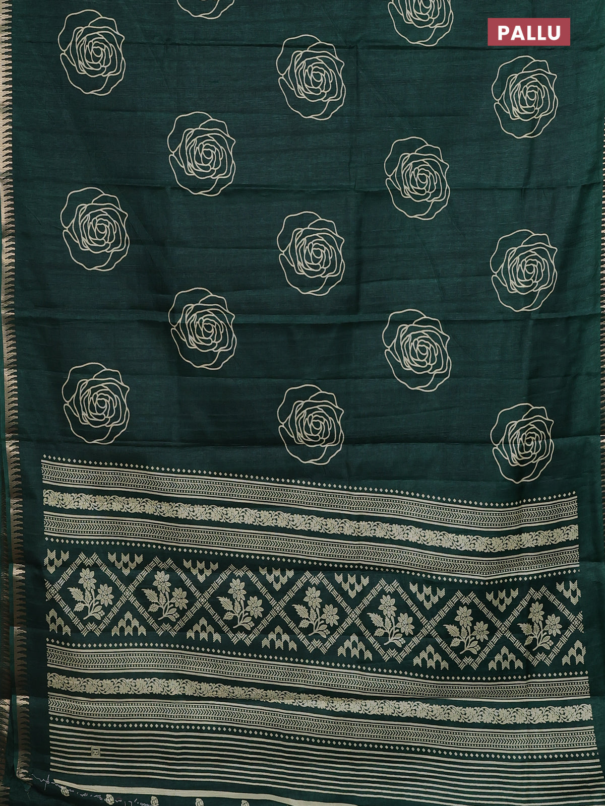 Semi raw silk saree dark green with floral butta prints and temple design zari woven border