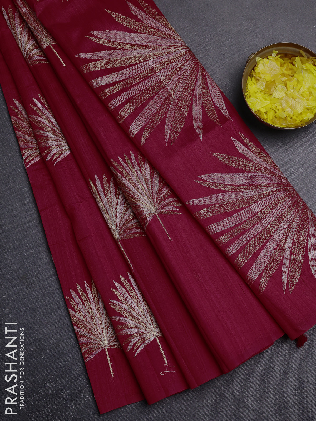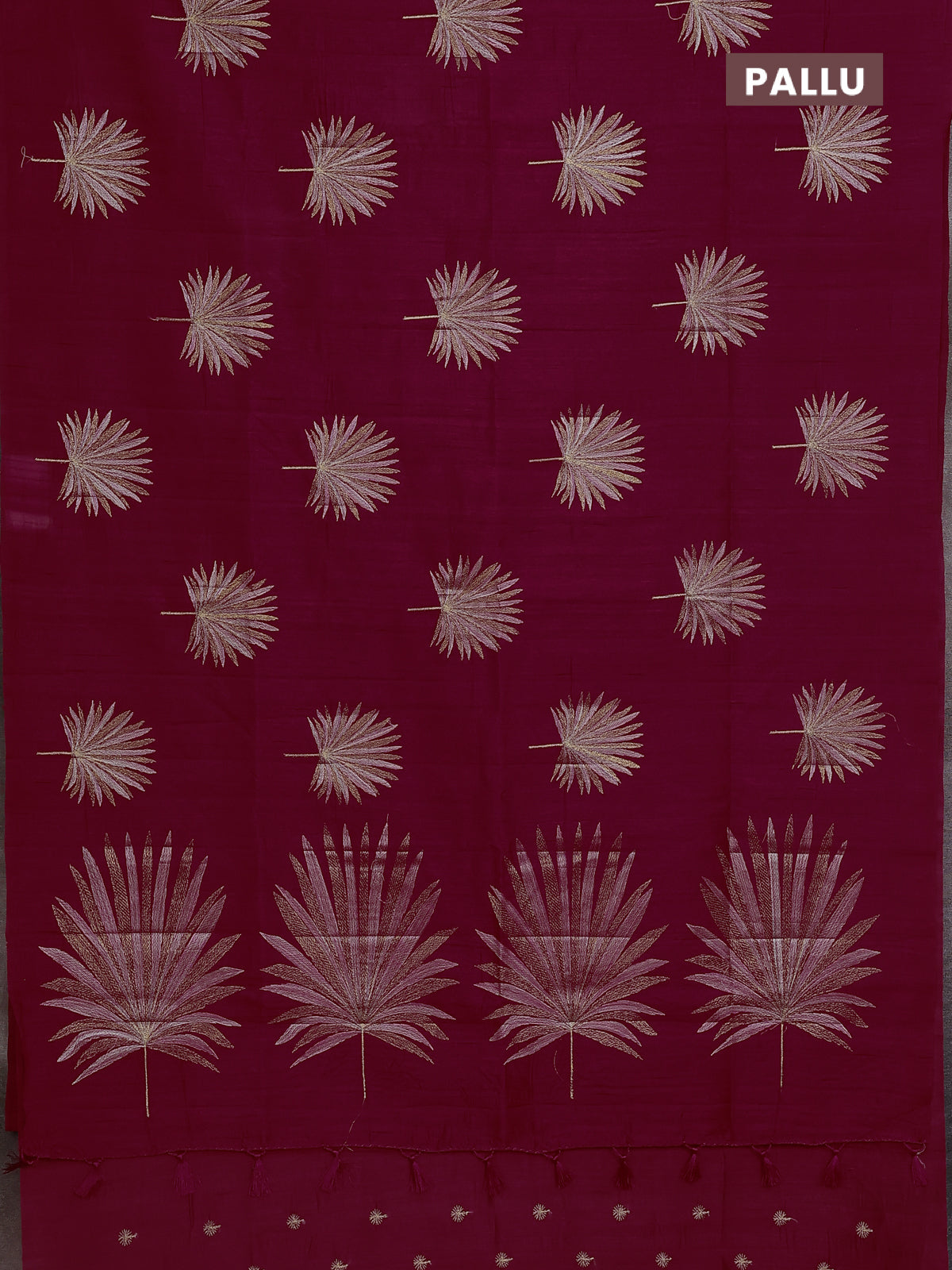 Semi raw silk saree dark pink with embroidery buttas in borderless border