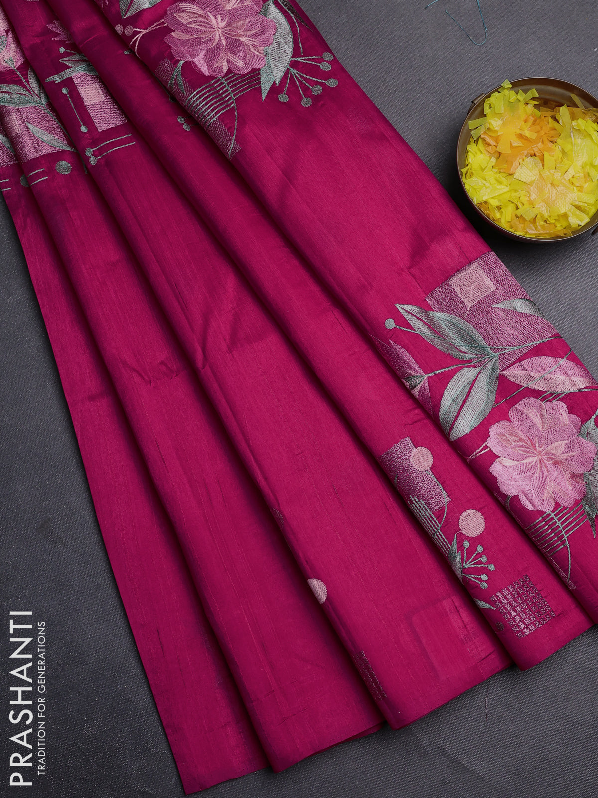 Semi raw silk saree dark pink with embroidery buttas in borderless style