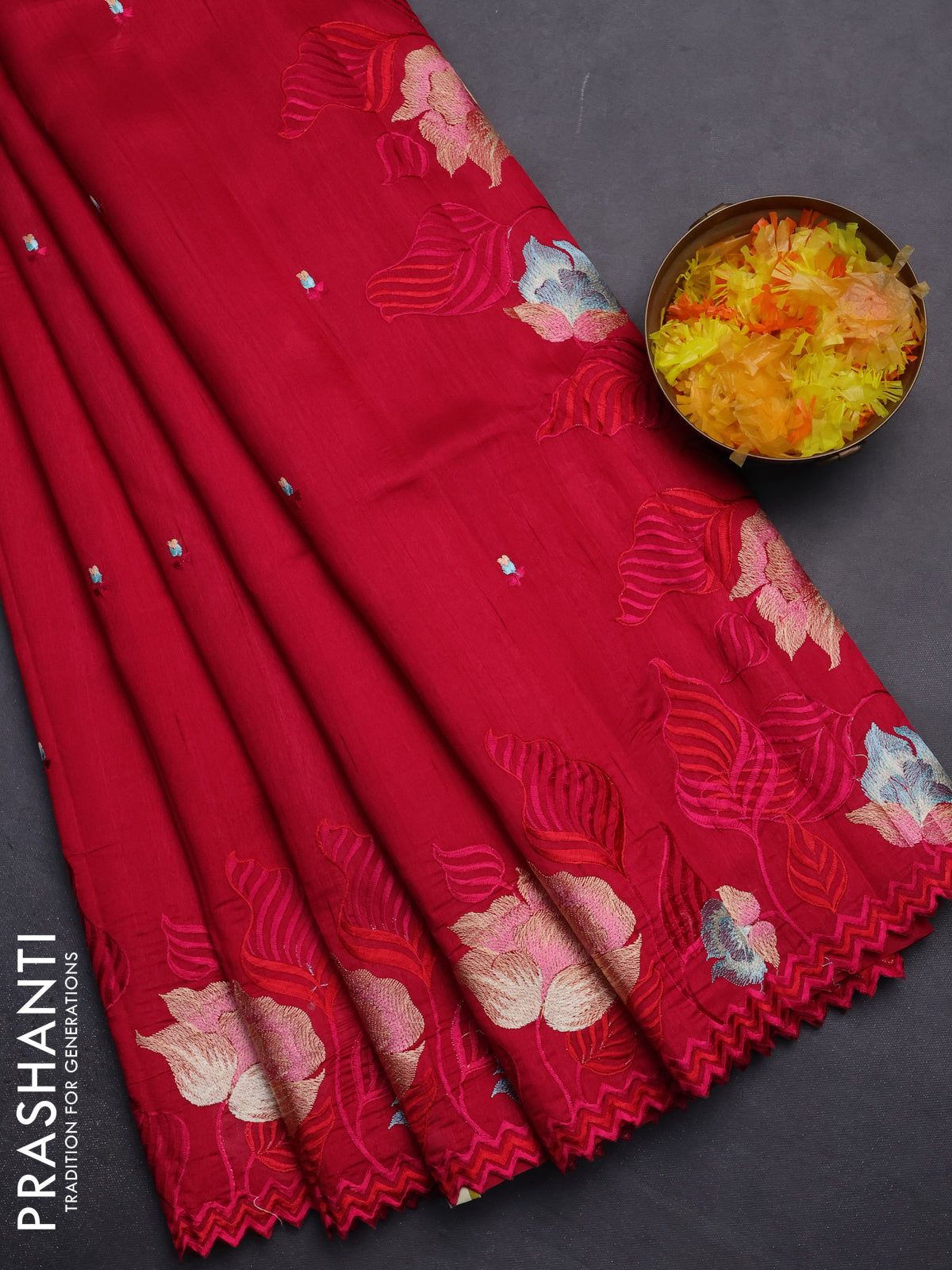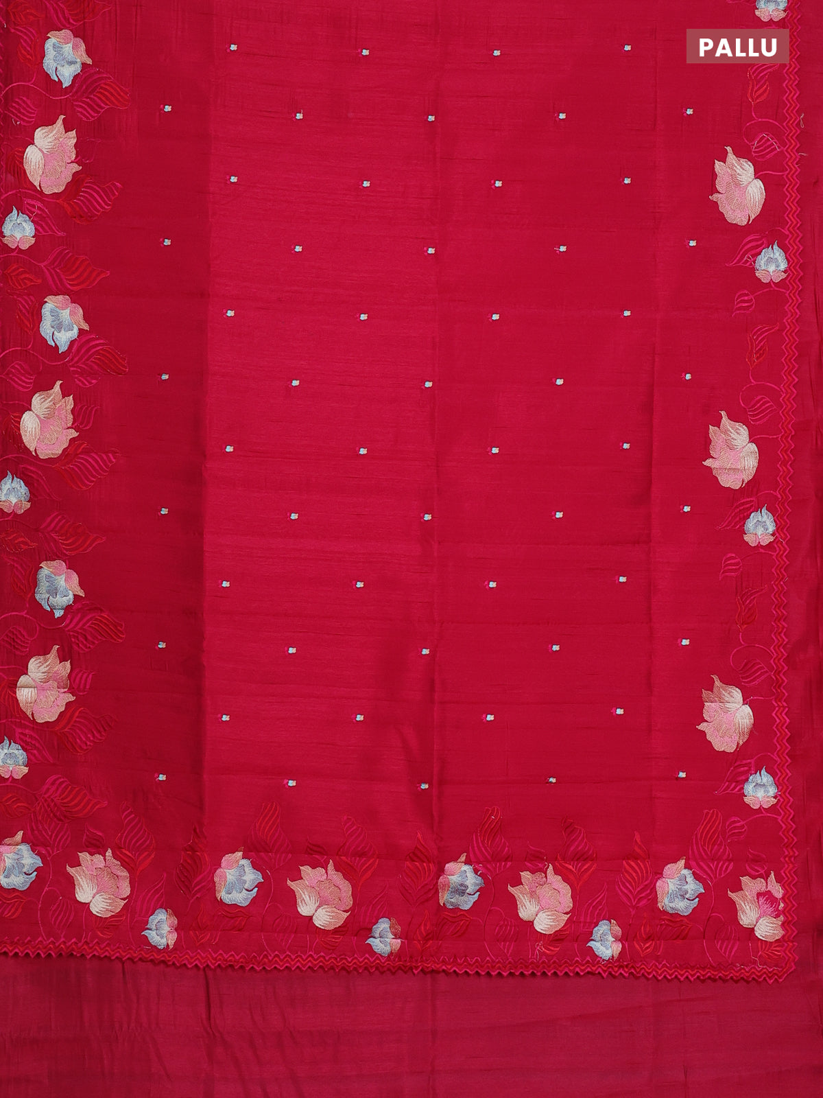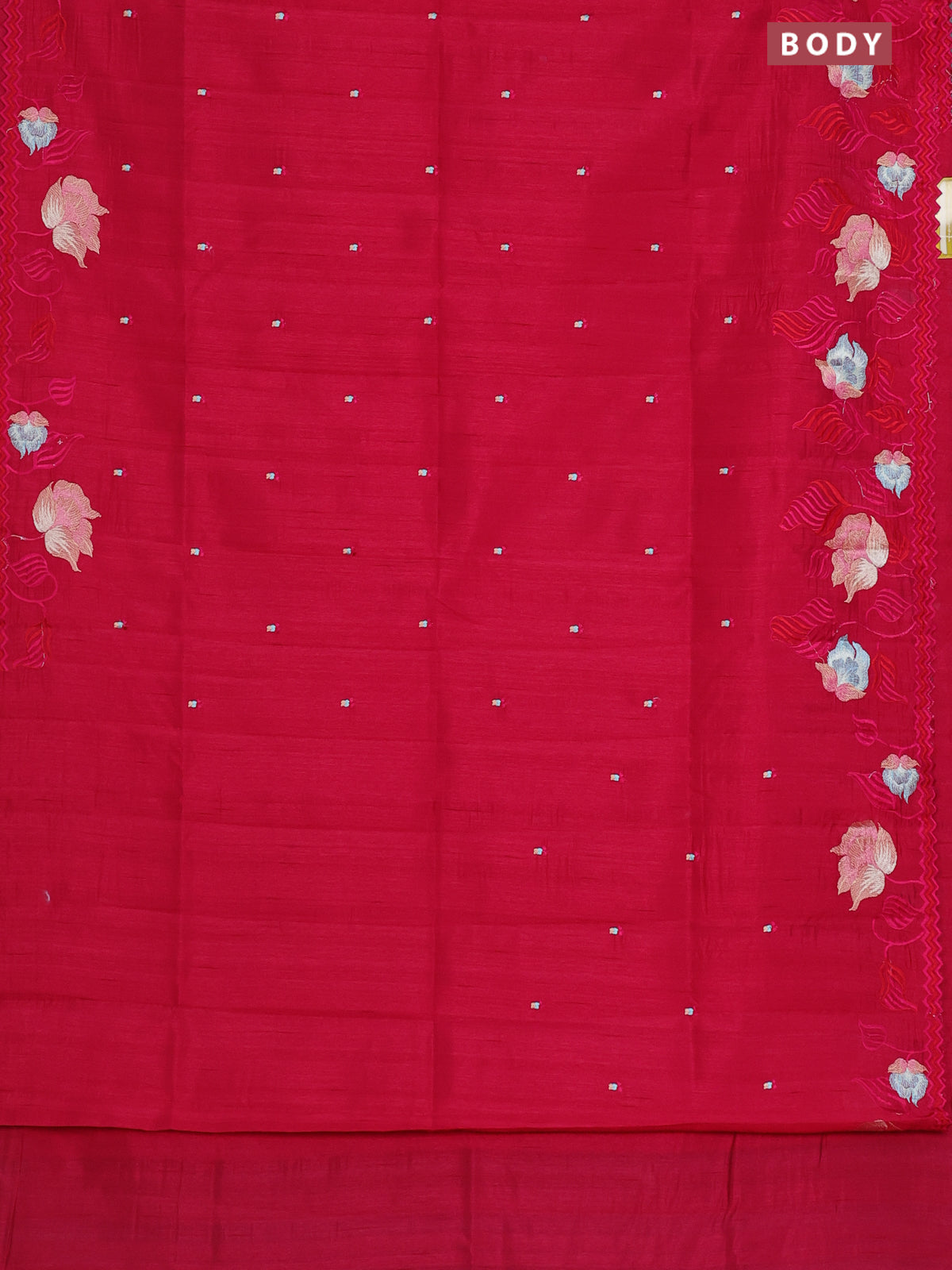 Semi raw silk saree dark pink with embroidery work buttas and floral embroidery border