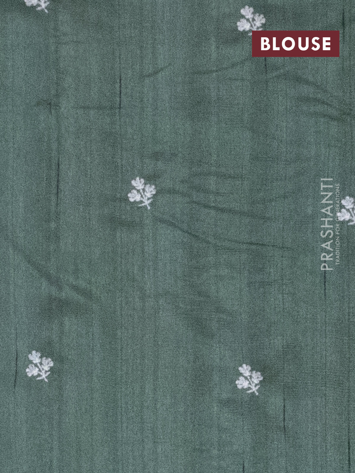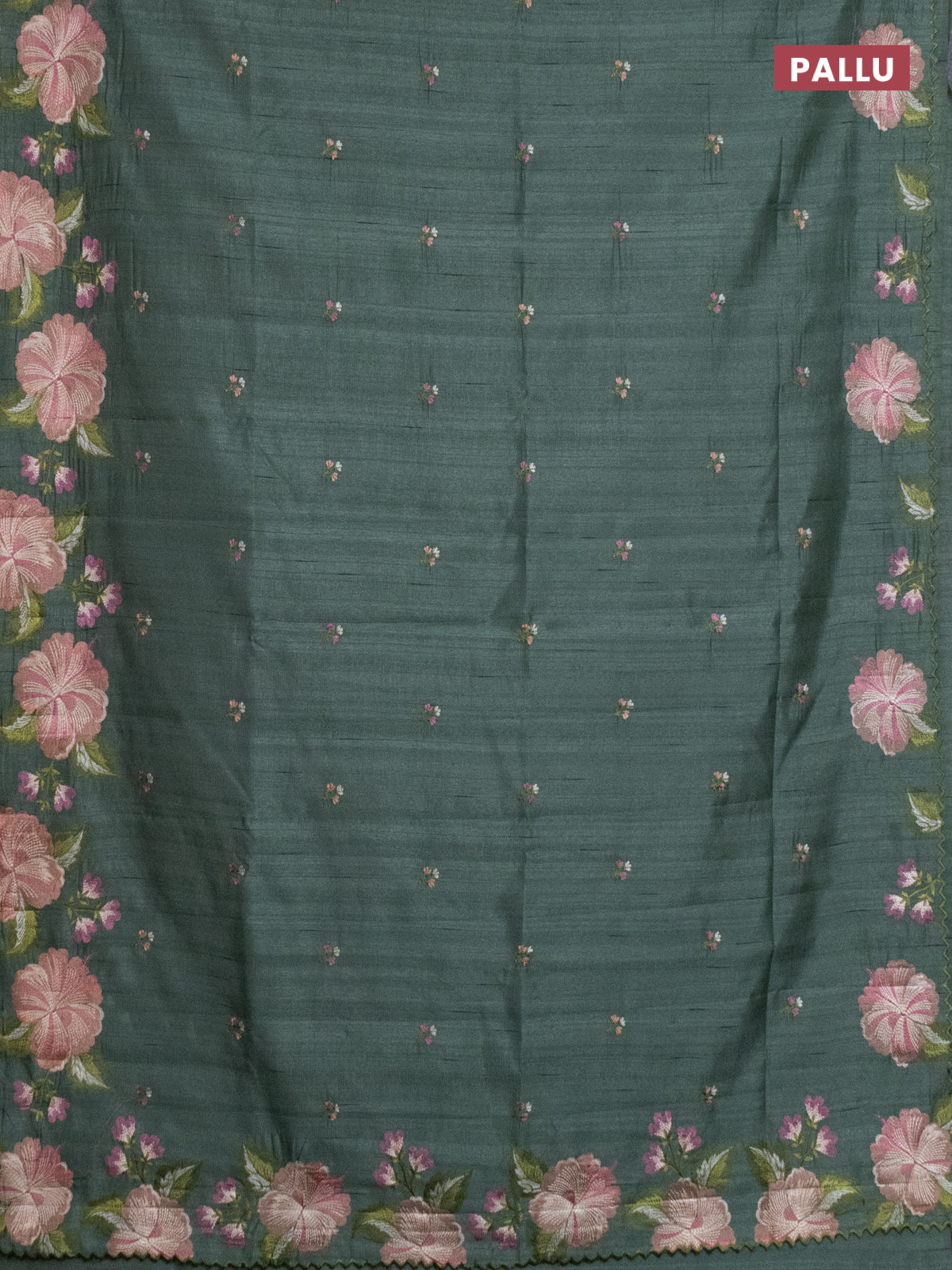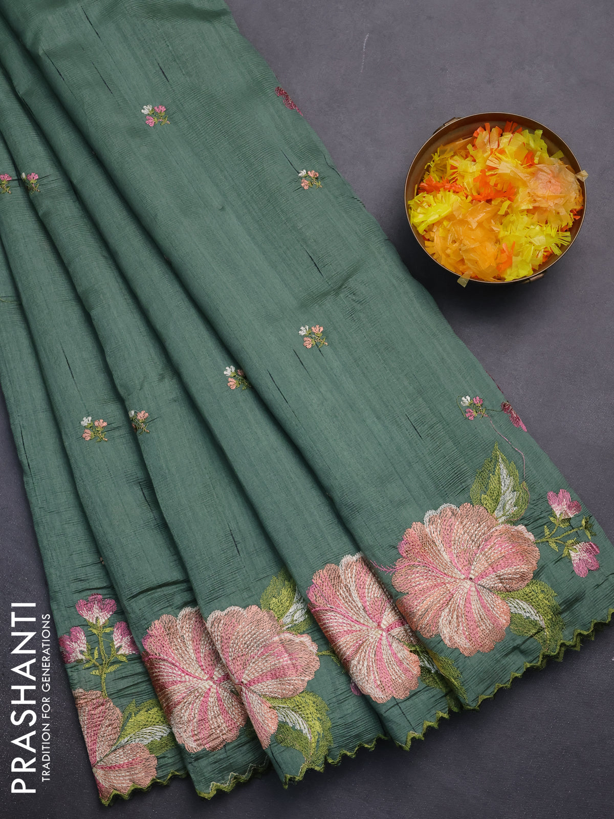 Semi raw silk saree green shade with embroidery work buttas and floral embroidery border