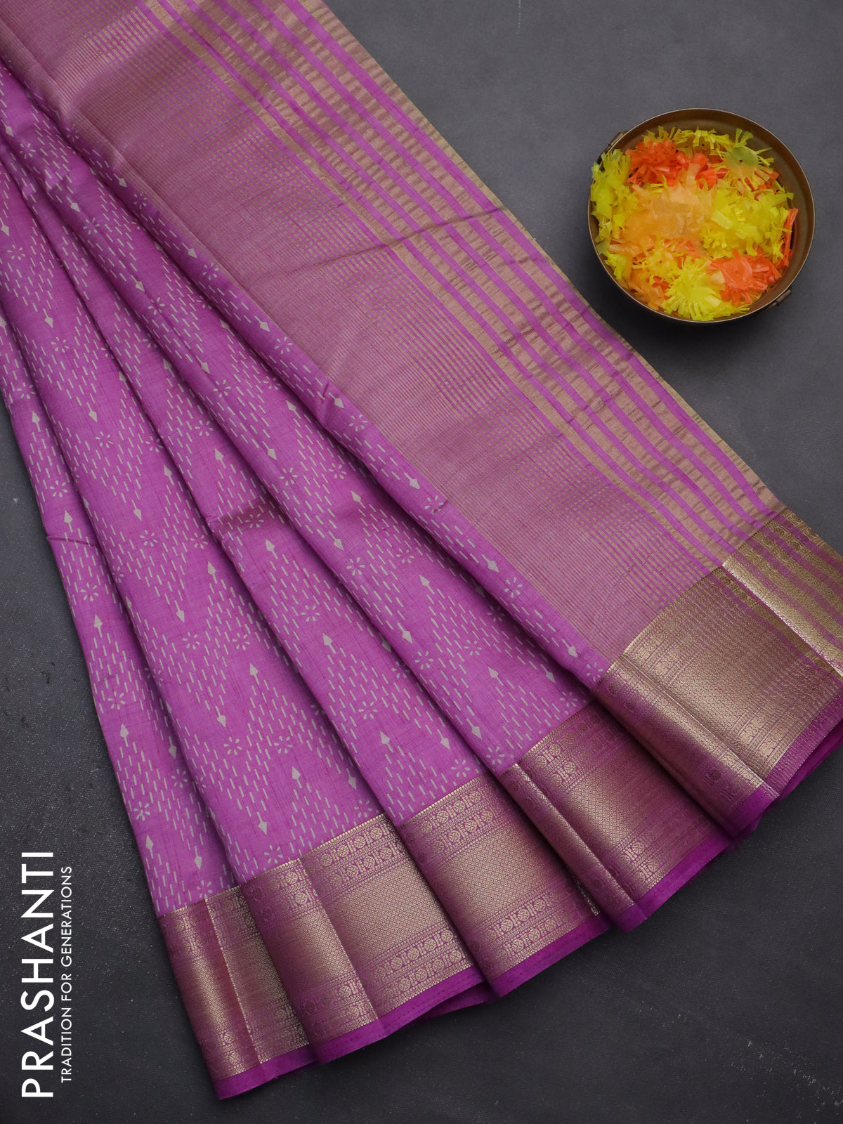 Semi raw silk saree lavender with allover prints and zari woven border