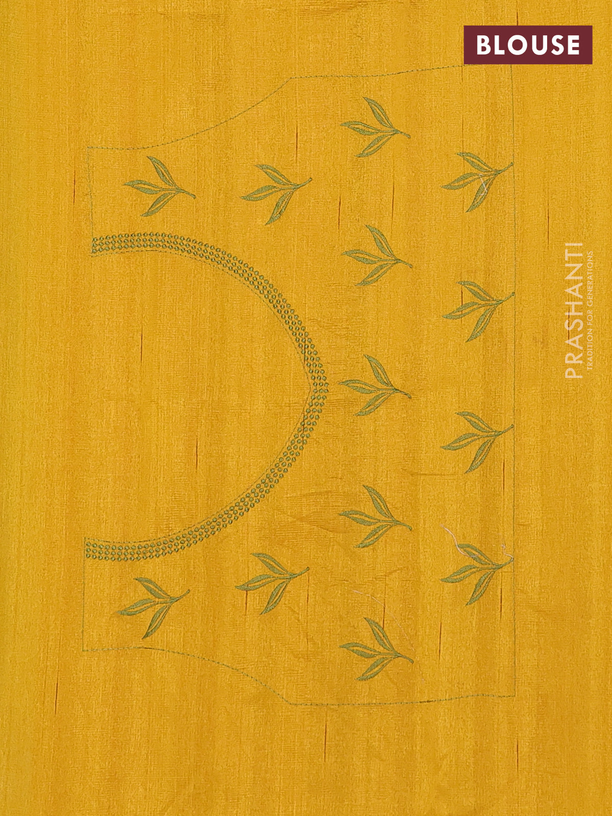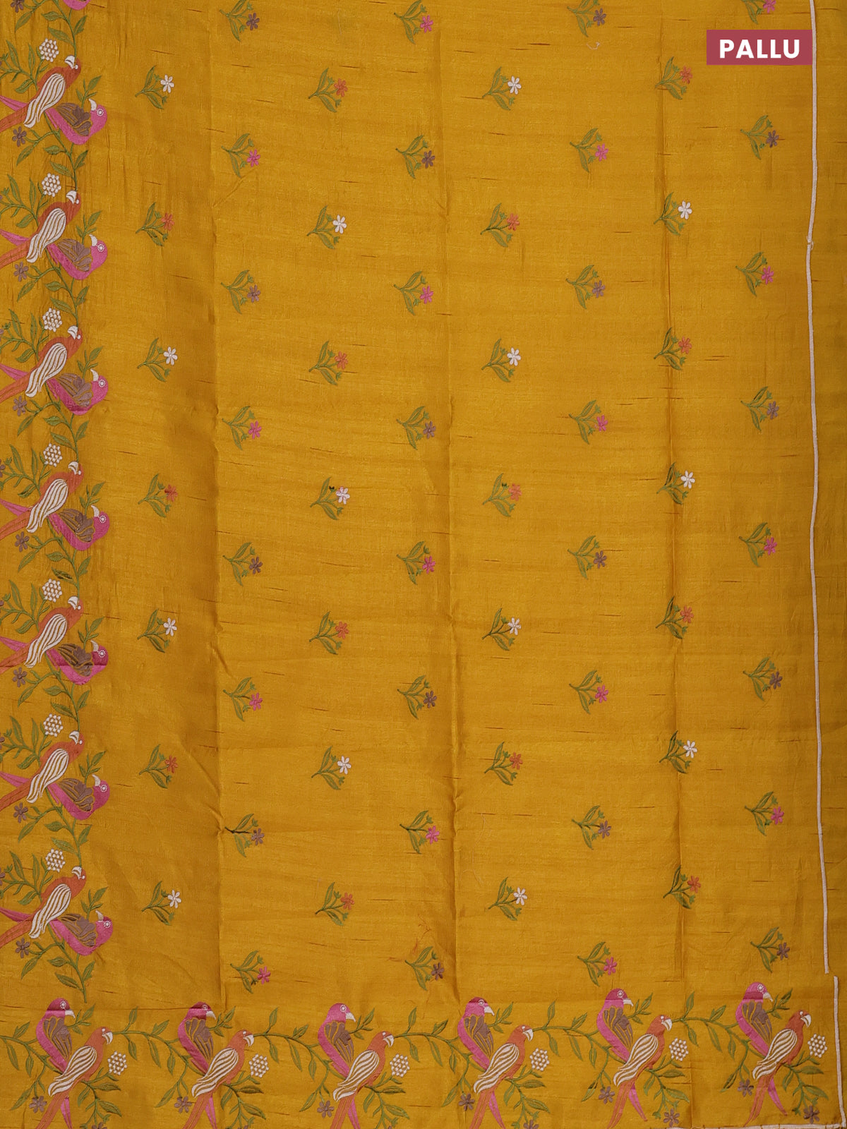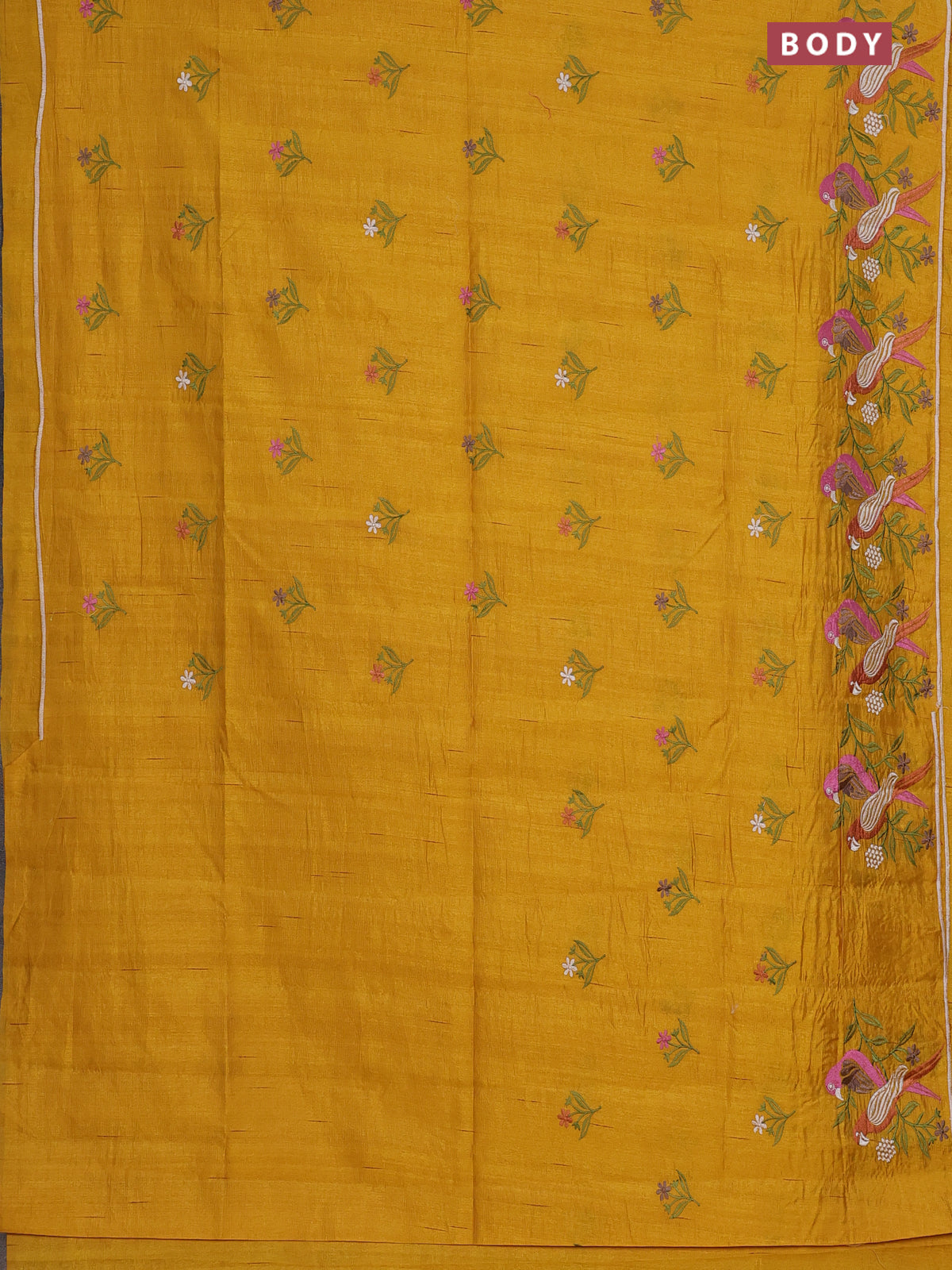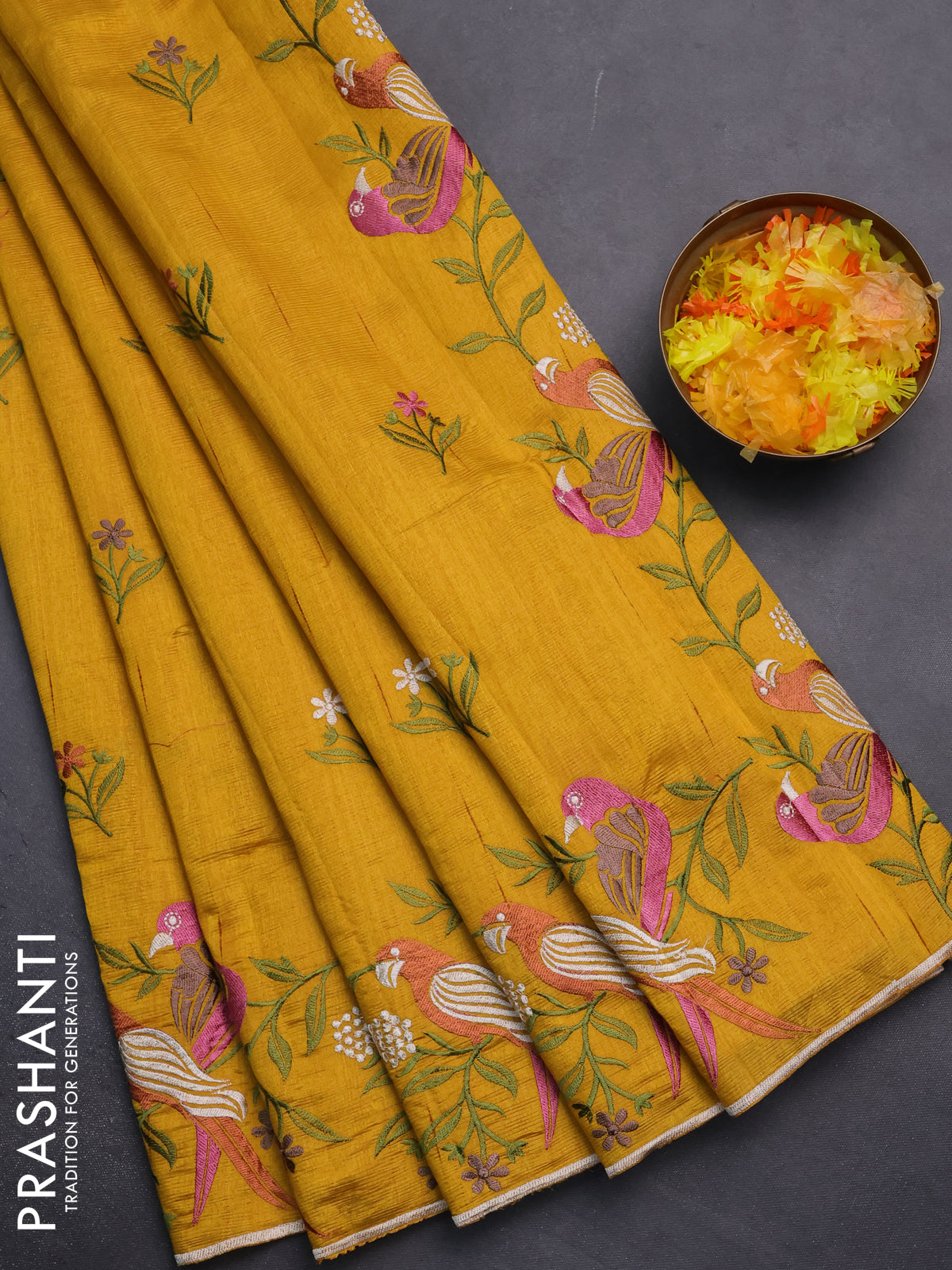 Semi raw silk saree mustard yellow with embroidery work buttas and parrot design embroidery butta border