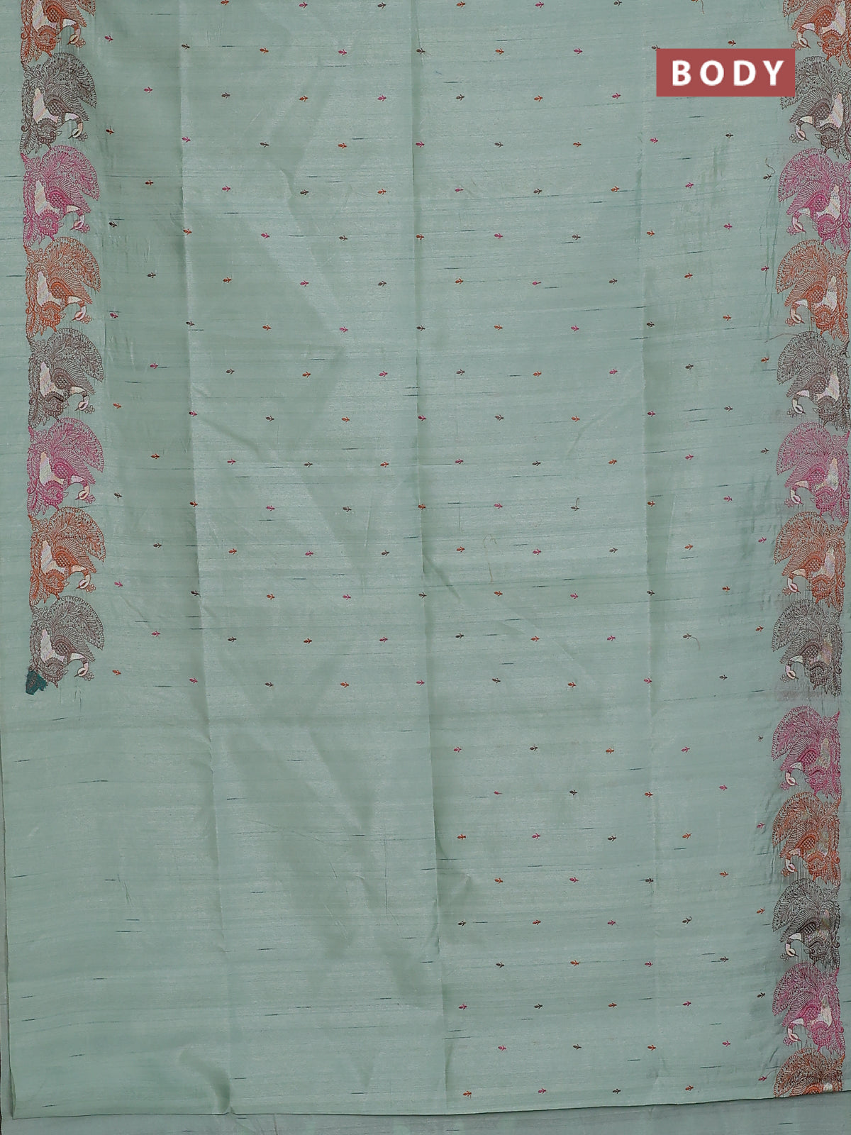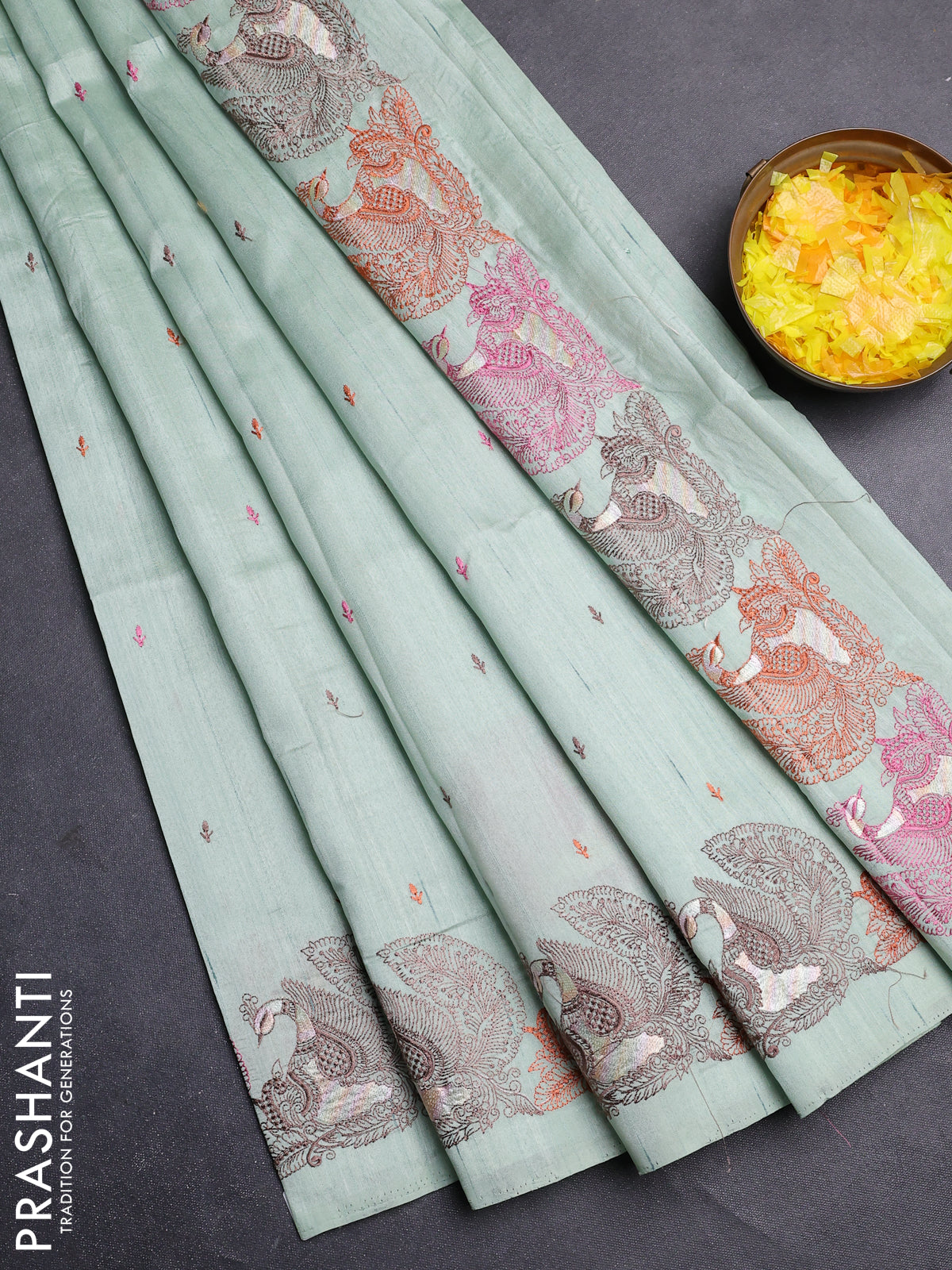 Semi raw silk saree pastel green with allover embroidery work and peacock embroidery border